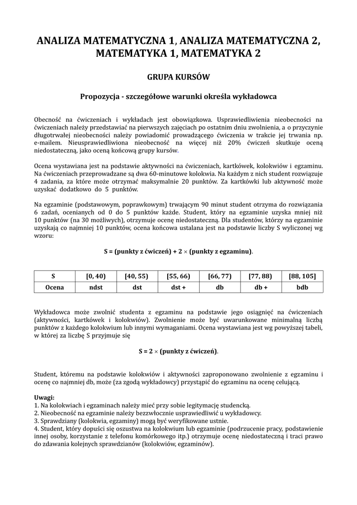 ANALIZA MATEMATYCZNA 1, ANALIZA MATEMATYCZNA 2, MATEMATYKA 1, MATEMATYKA 2 GRUPA KURSÓW Propozycja - szczegółowe warunki określa wykładowca Obecność na ćwiczeniach i wykładach jest obowiązkowa. Usprawiedliwienia nieobecności na ćwiczeniach należy przedstawiać na pierwszych zajęciach po ostatnim dniu zwolnienia, a o przyczynie długotrwałej nieobecności należy powiadomić prowadzącego ćwiczenia w trakcie jej trwania np. e-mailem. Nieusprawiedliwiona nieobecność na więcej niż 20% ćwiczeń skutkuje oceną niedostateczną, jako oceną końcową grupy kursów. Ocena wystawiana jest na podstawie aktywności na ćwiczeniach, kartkówek, kolokwiów i egzaminu. Na ćwiczeniach przeprowadzane są dwa 60-minutowe kolokwia. Na każdym z nich student rozwiązuje 4 zadania, za które może otrzymać maksymalnie 20 punktów. Za kartkówki lub aktywność może uzyskać dodatkowo do 5 punktów. Na egzaminie (podstawowym, poprawkowym) trwającym 90 minut student otrzyma do rozwiązania 6 zadań, ocenianych od 0 do 5 punktów każde. Student, który na egzaminie uzyska mniej niż 10 punktów (na 30 możliwych), otrzymuje ocenę niedostateczną. Dla studentów, którzy na egzaminie uzyskają co najmniej 10 punktów, ocena końcowa ustalana jest na podstawie liczby S wyliczonej wg wzoru: S = (punkty z ćwiczeń) + 2 (punkty z egzaminu). S [0, 40) [40, 55) [55, 66) [66, 77) [77, 88) [88, 105] Ocena ndst dst dst + db db + bdb Wykładowca może zwolnić studenta z egzaminu na podstawie jego osiągnięć na ćwiczeniach (aktywności, kartkówek i kolokwiów). Zwolnienie może być uwarunkowane minimalną liczbą punktów z każdego kolokwium lub innymi wymaganiami. Ocena wystawiana jest wg powyższej tabeli, w której za liczbę S przyjmuje się S = 2 (punkty z ćwiczeń). Student, któremu na podstawie kolokwiów i aktywności zaproponowano zwolnienie z egzaminu i ocenę co najmniej db, może (za zgodą wykładowcy) przystąpić do egzaminu na ocenę celującą. Uwagi: 1. Na kolokwiach i egzaminach należy mieć przy sobie legitymację studencką. 2. Nieobecność na egzaminie należy bezzwłocznie usprawiedliwić u wykładowcy. 3. Sprawdziany (kolokwia, egzaminy) mogą być weryfikowane ustnie. 4. Student, który dopuści się oszustwa na kolokwium lub egzaminie (podrzucenie pracy, podstawienie innej osoby, korzystanie z telefonu komórkowego itp.) otrzymuje ocenę niedostateczną i traci prawo do zdawania kolejnych sprawdzianów (kolokwiów, egzaminów).
