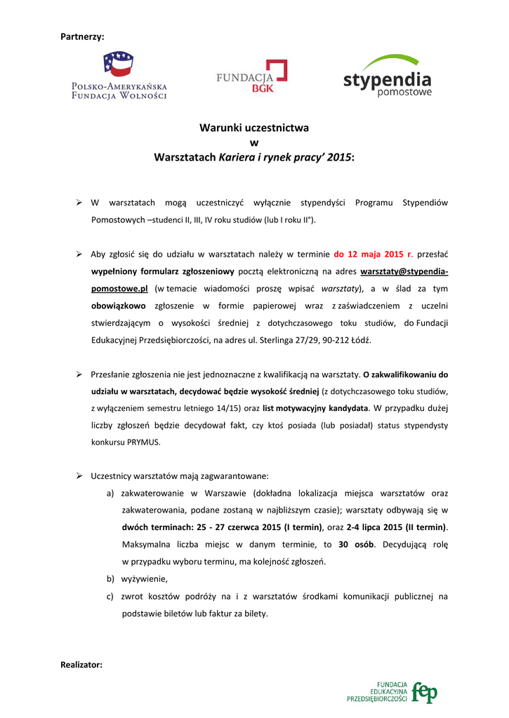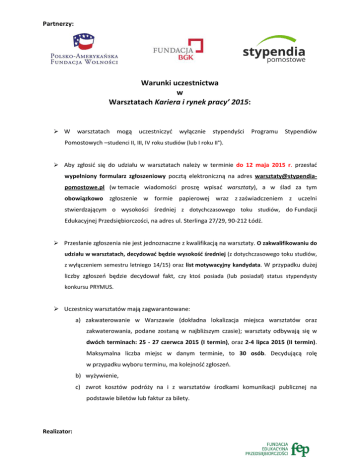 Partnerzy: Warunki uczestnictwa w Warsztatach Kariera i rynek pracy’ 2015: W warsztatach mogą uczestniczyć wyłącznie stypendyści Programu Stypendiów Pomostowych –studenci II, III, IV roku studiów (lub I roku II°). Aby zgłosić się do udziału w warsztatach należy w terminie do 12 maja 2015 r. przesłać wypełniony formularz zgłoszeniowy pocztą elektroniczną na adres [email protected] (w temacie wiadomości proszę wpisać warsztaty), a w ślad za tym obowiązkowo zgłoszenie w formie papierowej wraz z zaświadczeniem z uczelni stwierdzającym o wysokości średniej z dotychczasowego toku studiów, do Fundacji Edukacyjnej Przedsiębiorczości, na adres ul. Sterlinga 27/29, 90-212 Łódź. Przesłanie zgłoszenia nie jest jednoznaczne z kwalifikacją na warsztaty. O zakwalifikowaniu do udziału w warsztatach, decydować będzie wysokość średniej (z dotychczasowego toku studiów, z wyłączeniem semestru letniego 14/15) oraz list motywacyjny kandydata. W przypadku dużej liczby zgłoszeń będzie decydował fakt, czy ktoś posiada (lub posiadał) status stypendysty konkursu PRYMUS. Uczestnicy warsztatów mają zagwarantowane: a) zakwaterowanie w Warszawie (dokładna lokalizacja miejsca warsztatów oraz zakwaterowania, podane zostaną w najbliższym czasie); warsztaty odbywają się w dwóch terminach: 25 - 27 czerwca 2015 (I termin), oraz 2-4 lipca 2015 (II termin). Maksymalna liczba miejsc w danym terminie, to 30 osób. Decydującą rolę w przypadku wyboru terminu, ma kolejność zgłoszeń. b) wyżywienie, c) zwrot kosztów podróży na i z warsztatów środkami komunikacji publicznej na podstawie biletów lub faktur za bilety. Realizator: Partnerzy: W razie rezygnacji z udziału w warsztatach, zakwalifikowany uczestnik powinien niezwłocznie (najpóźniej tydzień przed rozpoczęciem warsztatów) poinformować organizatorów o zaistniałej sytuacji. Dodatkowych informacji dotyczących warsztatów udziela: Fundacja Edukacyjna Przedsiębiorczości: p. Anna Wiśniewska, [email protected], tel.: 42 632 59 91. Realizator: