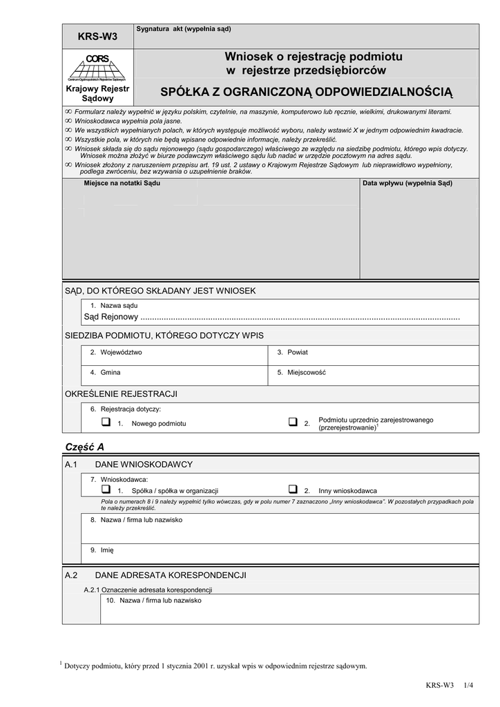 Sygnatura akt (wypełnia sąd) KRS-W3 Wniosek o rejestrację podmiotu w rejestrze przedsiębiorców CORS Centrum Ogólnopolskich Rejestrów Sądowych Krajowy Rejestr Sądowy • • • • • • SPÓŁKA Z OGRANICZONĄ ODPOWIEDZIALNOŚCIĄ Formularz naleŜy wypełnić w języku polskim, czytelnie, na maszynie, komputerowo lub ręcznie, wielkimi, drukowanymi literami. Wnioskodawca wypełnia pola jasne. We wszystkich wypełnianych polach, w których występuje moŜliwość wyboru, naleŜy wstawić X w jednym odpowiednim kwadracie. Wszystkie pola, w których nie będą wpisane odpowiednie informacje, naleŜy przekreślić. Wniosek składa się do sądu rejonowego (sądu gospodarczego) właściwego ze względu na siedzibę podmiotu, którego wpis dotyczy. Wniosek moŜna złoŜyć w biurze podawczym właściwego sądu lub nadać w urzędzie pocztowym na adres sądu. Wniosek złoŜony z naruszeniem przepisu art. 19 ust. 2 ustawy o Krajowym Rejestrze Sądowym lub nieprawidłowo wypełniony, podlega zwróceniu, bez wzywania o uzupełnienie braków. Miejsce na notatki Sądu Data wpływu (wypełnia Sąd) SĄD, DO KTÓREGO SKŁADANY JEST WNIOSEK 1. Nazwa sądu Sąd Rejonowy ......................................................................................................................................... SIEDZIBA PODMIOTU, KTÓREGO DOTYCZY WPIS 2. Województwo 3. Powiat 4. Gmina 5. Miejscowość OKREŚLENIE REJESTRACJI 6. Rejestracja dotyczy: 1. Nowego podmiotu 2. Podmiotu uprzednio zarejestrowanego (przerejestrowanie)1 2. Inny wnioskodawca Część A A.1 DANE WNIOSKODAWCY 7. Wnioskodawca: 1. Spółka / spółka w organizacji Pola o numerach 8 i 9 naleŜy wypełnić tylko wówczas, gdy w polu numer 7 zaznaczono „Inny wnioskodawca”. W pozostałych przypadkach pola te naleŜy przekreślić. 8. Nazwa / firma lub nazwisko 9. Imię A.2 DANE ADRESATA KORESPONDENCJI A.2.1 Oznaczenie adresata korespondencji 10. Nazwa / firma lub nazwisko 1 Dotyczy podmiotu, który przed 1 stycznia 2001 r. uzyskał wpis w odpowiednim rejestrze sądowym. KRS-W3 1/4 11. Imię A.2.2 Adres do korespondencji 12. Ulica 16. Kod pocztowy A.3 13. Nr domu 14. Nr lokalu 17. Poczta 15. Miejscowość 18. Kraj DANE PEŁNOMOCNIKA PROCESOWEGO A.3.1 Oznaczenie pełnomocnika 19. Nazwa / firma lub nazwisko 20. Imię A.3.2 Adres pełnomocnika 21. Ulica 25. Kod pocztowy 22. Nr domu 23. Nr lokalu 26. Poczta 24. Miejscowość 27. Kraj Część B Wnoszę o dokonanie wpisu zgodnie z informacjami zamieszczonymi we wniosku i na załącznikach: B.1 DANE PODMIOTU 28. Firma spółki 29. Oznaczenie formy prawnej Spółka z ograniczoną odpowiedzialnością Część C C.1 DANE O WCZEŚNIEJSZEJ REJESTRACJI SPÓŁKI (Pola o numerach od 30 do 32 dotyczą wyłącznie spółki uprzednio zarejestrowanej. W przypadku zgłoszenia nowej spółki pola te naleŜy przekreślić.) 30. Nazwa sądu prowadzącego rejestr 31. Nazwa rejestru 32. Numer w rejestrze RHB 33. Numer identyfikacji podatkowej NIP C.2 34. Numer identyfikacyjny REGON INFORMACJA O PROWADZENIU DZIAŁALNOŚCI GOSPODARCZEJ Z INNYMI PODMIOTAMI NA PODSTAWIE UMOWY SPÓŁKI CYWILNEJ 35. Czy przedsiębiorca prowadzi działalność gospodarczą z innymi podmiotami na podstawie umowy spółki cywilnej? C.3 NIE KRS-W3 2/4 TAK SIEDZIBA I ADRES SPÓŁKI 36. Województwo 37. Powiat 38. Gmina 39. Miejscowość 40. Ulica 41. Nr domu 43. Kod pocztowy C.4 42. Nr lokalu 44. Poczta INFORMACJA NA TEMAT UMOWY SPÓŁKI (Dla spółki uprzednio zarejestrowanej naleŜy podać informację o umowie stanowiącej podstawę dokonania wpisu do Rejestru Handlowego oraz o zmianach umowy spółki dotychczas nie zarejestrowanych.) 45. Data sporządzenia aktu notarialnego (dzień – miesiąc – rok), oznaczenie notariusza i kancelarii notarialnej, numer repertorium oraz dla spółki przerejestrowywanej, w przypadku zmiany umowy - numery zmienionych, dodanych, usuniętych paragrafów (innych jednostek redakcyjnych) C.5 INFORMACJA O CZASIE, NA JAKI UTWORZONA JEST SPÓŁKA 46. Spółka utworzona jest na czas: C.6 1. Oznaczony, jaki ? 2. Nieoznaczony INFORMACJA O PIŚMIE PRZEZNACZONYM DO OGŁOSZEŃ SPÓŁKI INNYM NIś MONITOR SĄDOWY I GOSPODARCZY 47. Oznaczenie pisma przeznaczonego do ogłoszeń spółki C.7 INFORMACJA CZY WSPÓLNIK MOśE MIEĆ JEDEN, CZY WIĘKSZĄ LICZBĘ UDZIAŁÓW 48. Wspólnik moŜe mieć: C.8 1. Jeden udział 2. Większą liczbę udziałów INFORMACJA O KAPITALE SPÓŁKI 49. Wysokość kapitału zakładowego spółki 50. Waluta Słownie: 51. Wartość udziałów objętych za aport 52. Waluta Słownie: Część D D.1 INFORMACJA O ZAŁĄCZNIKACH: 1. Jeśli spółka posiada oddziały naleŜy wypełnić załącznik KRS-WA „Oddziały, terenowe jednostki organizacyjne”. 2. Jeśli spółka powstała w wyniku połączenia, podziału lub przekształcenia, naleŜy wypełnić załącznik KRS-WH „Sposób powstania podmiotu”. 3. W celu wpisania danych wspólników podlegających wpisowi do rejestru (art. 38 pkt. 8 lit. c ustawy o KRS), naleŜy wypełnić załącznik KRS-WE „Wspólnicy spółki z ograniczoną odpowiedzialnością podlegający wpisowi do rejestru”. 4. W celu wpisania informacji na temat organu uprawnionego do reprezentacji spółki i osób wchodzących w jego skład oraz sposobu reprezentacji, naleŜy wypełnić załącznik KRS-WK „Organy podmiotu / wspólnicy uprawnieni do reprezentowania spółki”. 5. W celu wpisania informacji na temat organu nadzoru i osób wchodzących w jego skład, naleŜy wypełnić załącznik KRS-WK „Organy podmiotu / wspólnicy uprawnieni do reprezentowania spółki”. 6. Jeśli spółka posiada prokurentów, naleŜy wypełnić załącznik KRS-WL „Prokurenci, Pełnomocnicy spółdzielni, przedsiębiorstwa państwowego, jednostki badawczo-rozwojowej”. 7. W celu wpisania przedmiotu działalności przedsiębiorcy, naleŜy wypełnić załącznik KRS-WM „Przedmiot działalności”. 8. Jeśli razem z niniejszym wnioskiem składane są: roczne sprawozdanie