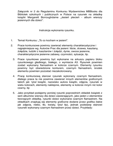 Załącznik nr 2 do Regulaminu Konkursu Wydawnictwa MBBooks dla Bibliotek szkolnych i publicznych w Polsce na rysunek na okładkę książki Margarett Borroughdame „Jesień plecień - album wierszy jesiennych dla dzieci”. Instrukcja wykonania rysunku. 1. Temat Konkursu: „To co kocham w jesieni”. 2. Prace konkursowe powinny zawierać elementy charakterystyczne i najpiękniejsze wg. Autorów Prac dla jesieni: liście, drzewa, kasztany, żołędzie, ludziki z kasztanów i żołędzi, dynie, owoce jesienne, charakterystyczne jesienne zabawy, czynności, sytuacje, itp. 3. Prace rysunkowe powinny być wykonane na arkuszu papieru bloku rysunkowego gładkiego, białego, o wymiarze A3. Rysunek powinien zostać wykonany flamastrem w kolorze czarnym. Elementy rysunku powinny być obwiedzione konturem, czarnym flamastrem, środek elementu powinien pozostać niezakolorowany. 4. Pracę konkursową stanowi rysunek wykonany czarnym flamastrem, dlatego praca ta nie powinna zawierać innych elementów graficznych takich jak: tytuł książki, nazwisko autora książki, zdjęcia, rysunek w wielu kolorach, elementy naklejone, elementy w kolorze innym niż kolor czarny, itp 5. Jako przykład podajemy poniżej rysunki poprzednich okładek książek z serii albumów wierszy dla dzieci zawierających, jako jeden z elementów tworzących okładkę, rysunki dzieci wykonane czarnym flamastrem. Na okładkach znajdują się elementy graficzne dodane przez grafika (takie jak zdjęcia, niebo, tło, kwiaty, tytuł itp), jednak podstawę stanowi rysunek wykonany czarnym flamastrem przez dzieci. Przykłady: