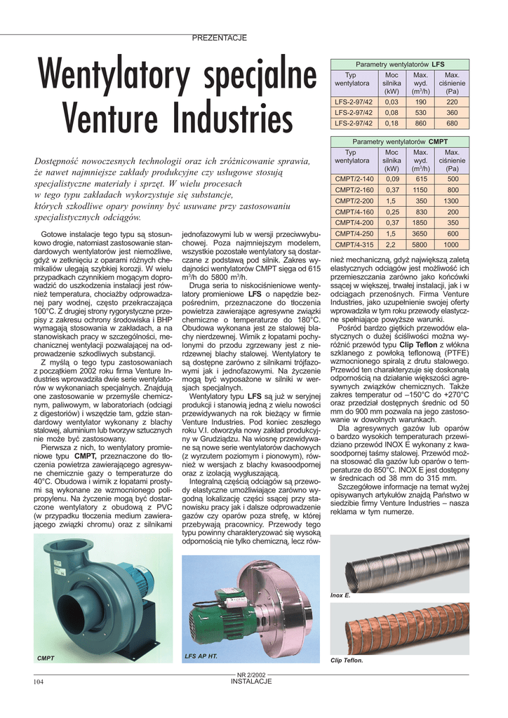 PREZENTACJE Wentylatory specjalne Venture Industries Dostêpnoæ nowoczesnych technologii oraz ich zró¿nicowanie sprawia, ¿e nawet najmniejsze zak³ady produkcyjne czy us³ugowe stosuj¹ specjalistyczne materia³y i sprzêt. W wielu procesach w tego typu zak³adach wykorzystuje siê substancje, których szkodliwe opary powinny byæ usuwane przy zastosowaniu specjalistycznych odci¹gów. Gotowe instalacje tego typu s¹ stosunkowo drogie, natomiast zastosowanie standardowych wentylatorów jest niemo¿liwe, gdy¿ w zetkniêciu z oparami ró¿nych chemikaliów ulegaj¹ szybkiej korozji. W wielu przypadkach czynnikiem mog¹cym doprowadziæ do uszkodzenia instalacji jest równie¿ temperatura, chocia¿by odprowadzanej pary wodnej, czêsto przekraczaj¹ca 100°C. Z drugiej strony rygorystyczne przepisy z zakresu ochrony rodowiska i BHP wymagaj¹ stosowania w zak³adach, a na stanowiskach pracy w szczególnoci, mechanicznej wentylacji pozwalaj¹cej na odprowadzenie szkodliwych substancji. Z myl¹ o tego typu zastosowaniach z pocz¹tkiem 2002 roku firma Venture Industries wprowadzi³a dwie serie wentylatorów w wykonaniach specjalnych. Znajduj¹ one zastosowanie w przemyle chemicznym, paliwowym, w laboratoriach (odci¹gi z digestoriów) i wszêdzie tam, gdzie standardowy wentylator wykonany z blachy stalowej, aluminium lub tworzyw sztucznych nie mo¿e byæ zastosowany. Pierwsza z nich, to wentylatory promieniowe typu CMPT, przeznaczone do t³oczenia powietrza zawieraj¹cego agresywne chemicznie gazy o temperaturze do 40°C. Obudowa i wirnik z ³opatami prostymi s¹ wykonane ze wzmocnionego polipropylenu. Na ¿yczenie mog¹ byæ dostarczone wentylatory z obudow¹ z PVC (w przypadku t³oczenia medium zawieraj¹cego zwi¹zki chromu) oraz z silnikami jednofazowymi lub w wersji przeciwwybuchowej. Poza najmniejszym modelem, wszystkie pozosta³e wentylatory s¹ dostarczane z podstaw¹ pod silnik. Zakres wydajnoci wentylatorów CMPT siêga od 615 m3/h do 5800 m3/h. Druga seria to niskocinieniowe wentylatory promieniowe LFS o napêdzie bezporednim, przeznaczone do t³oczenia powietrza zawieraj¹ce agresywne zwi¹zki chemiczne o temperaturze do 180°C. Obudowa wykonana jest ze stalowej blachy nierdzewnej. Wirnik z ³opatami pochylonymi do przodu zgrzewany jest z nierdzewnej blachy stalowej. Wentylatory te s¹ dostêpne zarówno z silnikami trójfazowymi jak i jednofazowymi. Na ¿yczenie mog¹ byæ wyposa¿one w silniki w wersjach specjalnych. Wentylatory typu LFS s¹ ju¿ w seryjnej produkcji i stanowi¹ jedn¹ z wielu nowoci przewidywanych na rok bie¿¹cy w firmie Venture Industries. Pod koniec zesz³ego roku V.I. otworzy³a nowy zak³ad produkcyjny w Grudzi¹dzu. Na wiosnê przewidywane s¹ nowe serie wentylatorów dachowych (z wyrzutem poziomym i pionowym), równie¿ w wersjach z blachy kwasoodpornej oraz z izolacj¹ wyg³uszaj¹c¹. Integraln¹ czêci¹ odci¹gów s¹ przewody elastyczne umo¿liwiaj¹ce zarówno wygodn¹ lokalizacjê czêci ss¹cej przy stanowisku pracy jak i dalsze odprowadzenie gazów czy oparów poza strefê, w której przebywaj¹ pracownicy. Przewody tego typu powinny charakteryzowaæ siê wysok¹ odpornoci¹ nie tylko chemiczn¹, lecz rów- Parametry wentylatorów LFS Typ wentylatora Moc silnika (kW) Max. wyd. (m3/h) Max. cinienie (Pa) LFS-2-97/42 0,03 190 220 LFS-2-97/42 0,08 530 360 LFS-2-97/42 0,18 860 680 Parametry wentylatorów CMPT Typ wentylatora 104 LFS AP HT. NR 2/2002 Max. cinienie (Pa) 500 0,09 615 CMPT/2-160 0,37 1150 800 CMPT/2-200 1,5 350 1300 CMPT/4-160 0,25 830 200 CMPT/4-200 0,37 1850 350 CMPT/4-250 1,5 3650 600 CMPT/4-315 2,2 5800 1000 nie¿ mechaniczn¹, gdy¿ najwiêksz¹ zalet¹ elastycznych odci¹gów jest mo¿liwoæ ich przemieszczania zarówno jako koñcówki ss¹cej w wiêkszej, trwa³ej instalacji, jak i w odci¹gach przenonych. Firma Venture Industries, jako uzupe³nienie swojej oferty wprowadzi³a w tym roku przewody elastyczne spe³niaj¹ce powy¿sze warunki. Poród bardzo giêtkich przewodów elastycznych o du¿ej ciliwoci mo¿na wyró¿niæ przewód typu Clip Teflon z w³ókna szklanego z pow³ok¹ teflonow¹ (PTFE) wzmocnionego spiral¹ z drutu stalowego. Przewód ten charakteryzuje siê doskona³¹ odpornoci¹ na dzia³anie wiêkszoci agresywnych zwi¹zków chemicznych. Tak¿e zakres temperatur od 150°C do +270°C oraz przedzia³ dostêpnych rednic od 50 mm do 900 mm pozwala na jego zastosowanie w dowolnych warunkach. Dla agresywnych gazów lub oparów o bardzo wysokich temperaturach przewidziano przewód INOX E wykonany z kwasoodpornej tamy stalowej. Przewód mo¿na stosowaæ dla gazów lub oparów o temperaturze do 850°C. INOX E jest dostêpny w rednicach od 38 mm do 315 mm. Szczegó³owe informacje na temat wy¿ej opisywanych artyku³ów znajd¹ Pañstwo w siedzibie firmy Venture Industries nasza reklama w tym numerze. Clip Teflon. INSTALACJE Max. wyd. (m3/h) CMPT/2-140 Inox E. CMPT Moc silnika (kW)