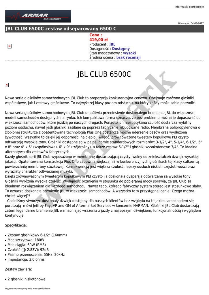 Informacje o produkcie Utworzono 04-03-2017 JBL CLUB 6500C zestaw odseparowany 6500 C Cena : 419,00 zł Producent : JBL Dostępność : Dostępny Stan magazynowy : wysoki Średnia ocena : brak recenzji er m ar k JBL CLUB 6500C Nowa seria głośników samochodowych JBL Club to propozycja konkurencyjna cenowo. Obejmuje zarówno głośniki współosiowe, jak i zestawy głośnikowe. To najwyższej klasy poziom odsłuchu, na który każdy może sobie pozwolić. w at Nowa seria głośników samochodowych JBL Club umożliwia przeniesienie doskonałego brzmienia JBL do większości modeli samochodów dostępnych na rynku. Ich kompaktowa forma oznacza, że bez problemu można je dopasować do większości samochodów, które jeżdżą po naszych drogach. Ponadto ich niespotykana czułość dostarcza wybitny poziom odsłuchu, nawet jeśli głośniki zasilane są poprzez fabrycznie wbudowane radio. Membrana polipropylenowa o żłobionej strukturze z opatentowaną technologią Plus One dostarcza mocne uderzenie basów oraz wydłużoną żywotność. Wszystko to dzięki jej odporności na ciepło i wilgoć. Zrównoważone tweetery kopułkowe PEI czysto odtwarzają wysokie tony. Głośniki dostępne są w pełnej gamie standardowych rozmiarów: 3-1/2", 4", 5-1/4", 6-1/2", 6" x 8" oraz 4" x 6" (współosiowe), 6" x 9" (trójdrożny), a także zestaw 6-1/2" i głośniki wysokotonowe 3/4". To idealna alternatywa dla zestawów fabrycznych. Każdy głośnik serii JBL Club wyposażono w membranę dostarczającą czysty, wolny od zniekształceń dźwięk wysokiej jakości. Opatentowana konstrukcja Plus One zapewnia większą niż w konkurencyjnych głośnikach tej klasy całkowitą powierzchnię membrany stożkowej. Konsekwencją jest większa czułość, lepszy odsłuch niskich częstotliwości oraz wyrazisty charakter odtwarzanej muzyki. Dzięki zrównoważonym tweeterom kopułkowym PEI czysto i z doskonałą dyspersją odtwarzane są wysokie tony. Głośniki wyróżnia wysoka czułość. Wydajność brzmienia w stosunku do pobieranej mocy sprawia, że JBL Club są idealnym rozwiązaniem dla każdego samochodu. Nawet tego, którego fabryczny system stereo jest stosunkowo słaby. To oznacza doskonałe brzmienie JBL w większości samochodów. A wszystko to w przystępnej cenie! Czego można chcieć więcej?! - Chcieliśmy stworzyć doskonały dźwięk dostępny dla naszych klientów bez względu na to jakim samochodem się poruszają mówi Jeffrey Fay, VP and GM of Aftermarket Services w koncernie HARMAN. Głośniki JBL Club dostarczają zatem legendarne brzmienie JBL wzmacniając wrażenia z jazdy z najlepszym dźwiękiem, funkcjonalnością i wyglądem kontynuuje. Specyfikacja: ■ ■ ■ ■ ■ ■ Zestaw głośnikowy 6-1/2" (160mm) Moc szczytowa: 180W Moc ciągła: 60W (RMS) Czułość (@ 2.83V): 92dB Pasmo przenoszenia: 55Hz 20kHz Impedancja: 3.0 ohms Zestaw zawiera: ■ 2 głośniki niskotonowe Wygenerowano w programie www.oscGold.com er m ar k ■ 2 głośniki wysokotonowe 2 zwrotnice 2 maskownice at ■ w ■