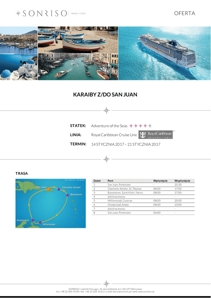 OFERTA KARAIBY Z/DO SAN JUAN STATEK: Adventure of the Seas LINIA: Royal Caribbean Cruise Line TERMIN: 14 STYCZNIA 2017 – 21 STYCZNIA 2017 TRASA Dzień 1 2 3 4 5 6 7 8 Port San Juan, Portoryko Charlotte Amalie, St. Thomas Basseterre, Saint Kitts i Nevis dzień na morzu Willemstad, Curacao Oranjestad, Aruba dzień na morzu San Juan, Portoryko Wpłynięcie 08:00 08:00 08:00 08:00 06:00 SONRISO | Lipiński Passage | Al. Jero zo limskie 61 | 00-697 Warszawa tel. +48 22 206 45 00 | fax. +48 22 100 14 61 | e-mail: biuro @so nriso .pl | web: www.so nriso .pl Wypłynięcie 20:30 17:00 17:00 20:00 23:00 - OFERTA CENA Typ kabiny Kabina wewnętrzna Kabina z oknem Kabina z balkonem Cena z osobę od 643 EUR od 699 EUR od 1 105 EUR CENA ZAWIERA DOTATKOWE OPŁATY zakwaterowanie w 2 - os. kabinie wybranej kategorii pełne wyżywienie: 3 posiłki, przekąski między posiłakmi, bufet o północy napoje do posiłków: woda stołowa, kawa, herbata oraz sok do śniadania serwis bagażowy podczas wejścia i zejścia ze statku 24 godzinny serwis kabinowy korzystanie z urządzeń sportowo - rekreacyjnych dostępnych na pokładzie (baseny, jacuzzi, boiska sportowe, kluby dla dzieci i młodzieży itp.) udział we wszystkich imprezach organizowanych na pokładzie (przedstawienia, pokazy, aukcje, animacje i inne) obowiązkowe opłaty portowe obowiązkową opłatę serwisową (napiwki) dla obsługi statku dojazd/przelot do portu rozpoczęcia i zakończenia rejsu transfery (lotnisko - port - lotnisko) ewentualne noclegi przed lub po rejsie wycieczki fakultatywne napoje: bezalkoholowe, alkoholowe, woda mineralna dostępne w restauracjach i barach (istnieje możliwość wykupienia pakietów napojów, o szczegóły zapytaj w biurze) korzystanie z mini baru w kabinie korzystanie z usług typu: SPA, salon piękności, pralnia itp. wydatki osobiste tj. zakupy w butikach, internet, kasyno itp. obowiązkowe ubezpieczenie turystyczne koszt wymaganych wiz ewentualna opłata paliwowa (linia w momencie wzrotu cen ropy zastrzega sobie prawo do dodania oplaty paliwowej do każdej rezerwacji) Na życzenie świadczymy dodatkowo usługi: rezerwacje hotelowe na całym świecie, rezerwacje biletów lotniczych, trasferów oraz parkingu w porcie, rezerwacje wycieczek fakultatywnych i innych atrakcji SONRISO | Lipiński Passage | Al. Jero zo limskie 61 | 00-697 Warszawa tel. +48 22 206 45 00 | fax. +48 22 100 14 61 | e-mail: biuro @so nriso .pl | web: www.so nriso .pl