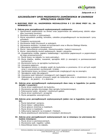Załącznik nr 2 SZCZEGÓŁOWY OPIS PRZEDMIOTU ZAMÓWIENIA W ZAKRESIE SPRZĄTANIA OBIEKTÓW A. BUDYNKI PRZY UL. KAZIMIERZA MICHALCZYKA 9 I 23 ORAZ PRZY UL. JANOWSKIEJ 51 I. Zakres prac porządkowych wykonywanych codziennie: 1. Opróżnianie pojemników na śmieci oraz pojemników do selektywnej zbiórki odpadów (wymiana worków). 2. Wymiana worków w niszczarkach. 3. Mycie wszystkich podłóg, schodów, cokołów przypodłogowych na korytarzach i przy schodach. 4. Trzepanie wycieraczek. 5. Wycieranie mebli biurowych w pokojach. 6. Wycieranie stolików i krzeseł na korytarzach oraz w Biurze Obsługi Klienta. 7. Odkurzanie wykładzin dywanowych. 8. Mycie i dezynfekcja umywalek, zlewozmywaków i baterii kranowych. 9. Mycie i dezynfekcja muszli sedesowych, desek i pisuarów. 10. Uzupełnianie mydła, papieru toaletowego i ręczników papierowych w pojemnikach do tego przeznaczonych. 11. Mycie koszy na odpady (w razie potrzeby). 12. Mycie blatów, stołów, suszarek, sprzętów AGD (z zewnątrz) w pomieszczeniach kuchennych. 13. Wycieranie kurzu ze sprzętów kuchennych. 14. Usuwanie pajęczyn. 15. Sprzątanie terenu w obrębie wejść do budynków w promieniu 10 m od tych wejść wraz z czyszczeniem wycieraczek i kratek. 16. Opróżnianie koszy na śmieci i popielniczek znajdujących się na zewnątrz. 17. Sprzątanie wiaty dla palących. 18. Usuwanie sopli lodowych zwisających nad ciągami pieszymi. 19. Odśnieżanie w okresie zimowym wejść do budynków wraz z chodnikiem (na całej długości - do jezdni) – 4 x dziennie. II. Zakres prac porządkowych wykonywanych dwa razy w tygodniu (w poniedziałki i czwartki): 1. Mycie drzwi wejściowych do budynku. 2. Wycieranie sprzętu biurowego (bez sprzętu komputerowego). 3. Polerowanie luster, obrazów i oszklonych gablot. 4. Mycie drzwi oszklonych i przegród. 5. Mycie parapetów wewnętrznych. III. Zakres prac porządkowych wykonywanych jeden raz w tygodniu (we wtorki): 1. Mycie balustrad i poręczy. 2. Mycie listew i odbojników. 3. Mycie glazury ściennej w toaletach. 4. Mycie drzwi w toaletach. 5. Odkurzanie tapicerki na krzesłach i fotelach. 6. Mycie plastikowych elementów w krzesłach obrotowych. IV. Zakres prac porządkowych wykonywanych raz w miesiącu (w pierwszej dekadzie miesiąca): 1. Mycie drzwi w pomieszczeniach. 2. Wycieranie szaf, regałów i półek. 3. Dezynfekcja koszy na odpady. Ochrona obiektów oraz sprzątanie pomieszczeń biurowych i gospodarczych w obiektach użytkowanych przez Ekosystem Sp. z o.o. we Wrocławiu 25/2014 Strona 1 z 2 4. Mycie kaloryferów. 5. Mycie parapetów zewnętrznych. V. Zakres prac porządkowych wykonywanych cztery razy w roku: 1. Czyszczenie rynien (na zlecenie Zamawiającego). VI. Zakres prac porządkowych wykonywanych trzy razy w roku (na zlecenie Zamawiającego – przewidywane terminy: marzec/kwiecień, lipiec/sierpień, październik/listopad): 1. Mycie wszystkich okien wraz z odsunięciem i odłożeniem na miejsce rzeczy uniemożliwiających prace. 2. Mycie listew komputerowych i oświetlenia wraz demontażem i montażem opraw. VII. Zakres prac porządkowych wykonywanych raz w roku (na zlecenie Zamawiającego): 1. Pranie żaluzji pionowych wraz z demontażem i montażem (ok. 200 mb). 2. Pranie wykładzin dywanowych (ok. 50 m2). VIII. Zakres prac porządkowych wykonywanych dwa razy w roku (na zlecenie Zamawiającego): 1. Mycie elewacji z płyt ceramicznych, schodów i podjazdu przy wejściu głównym do budynku (marzec i wrzesień). 2. Akrylowanie posadzki i wykładziny typu tarket wraz z odsunięciem i odłożeniem na miejsce rzeczy uniemożliwiających prace (marzec i wrzesień). 3. Czyszczenie rynien (na wiosnę i po opadzie wszystkich liści z drzew). IX. Zakres prac porządkowych wykonywanych według potrzeb: 1. Wymiana kostek dezynfekujących w spłuczkach (nie rzadziej niż raz w miesiącu). 2. Usuwanie śniegu z dachów. X. Zapewnienie osoby sprzątającej będącej w dyspozycji w godzinach 1100 – 1200 we wszystkie dni robocze Zamawiającego, wykonującej bieżące prace porządkowe i gospodarcze (dot. budynków przy ul. Kazimierza Michalczyka). B. BUDYNKI PRZY UL. KOZIEJ Zakres prac porządkowych wykonywanych jeden raz w tygodniu (w środy): 1. Mycie podłóg. 2. Mycie umywalki i baterii. 3. Mycie i dezynfekcja muszli sedesowej. 4. Uzupełnianie mydła, ręczników i papieru toaletowego. 5. Mycie drzwi. 6. Opróżnianie pojemników na odpady. 7. Mycie parapetów. 8. Mycie okien (3 szt. o pow. 3,6 m2) – 2 razy w roku (na Zlecenie Zamawiającego – przewidywane terminy: marzec i wrzesień). Ochrona obiektów oraz sprzątanie pomieszczeń biurowych i gospodarczych w obiektach użytkowanych przez Ekosystem Sp. z o.o. we Wrocławiu 25/2014 Strona 2 z 2