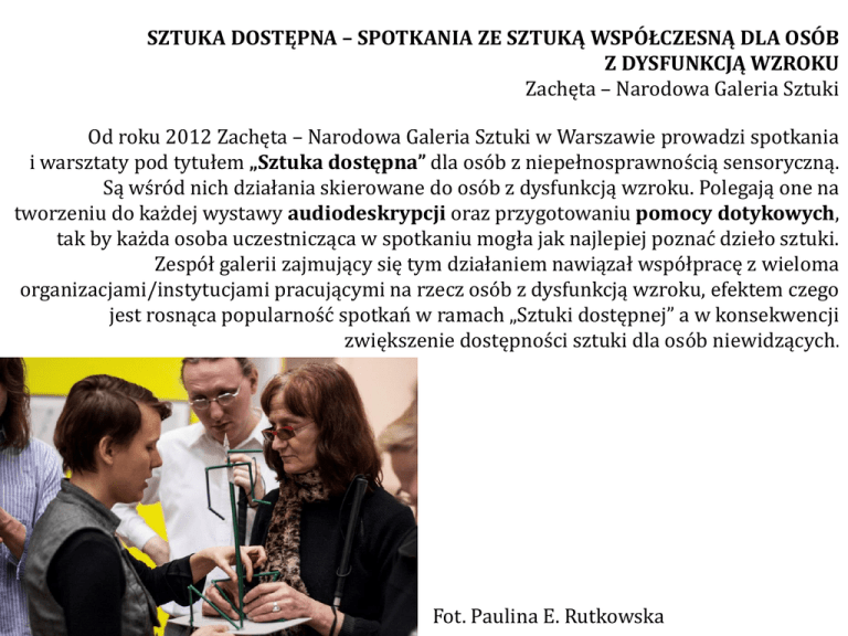 SZTUKA DOSTĘPNA – SPOTKANIA ZE SZTUKĄ WSPÓŁCZESNĄ DLA OSÓB Z DYSFUNKCJĄ WZROKU Zachęta – Narodowa Galeria Sztuki Od roku 2012 Zachęta – Narodowa Galeria Sztuki w Warszawie prowadzi spotkania i warsztaty pod tytułem „Sztuka dostępna” dla osób z niepełnosprawnością sensoryczną. Są wśród nich działania skierowane do osób z dysfunkcją wzroku. Polegają one na tworzeniu do każdej wystawy audiodeskrypcji oraz przygotowaniu pomocy dotykowych, tak by każda osoba uczestnicząca w spotkaniu mogła jak najlepiej poznać dzieło sztuki. Zespół galerii zajmujący się tym działaniem nawiązał współpracę z wieloma organizacjami/instytucjami pracującymi na rzecz osób z dysfunkcją wzroku, efektem czego jest rosnąca popularność spotkań w ramach „Sztuki dostępnej” a w konsekwencji zwiększenie dostępności sztuki dla osób niewidzących. Fot. Paulina E. Rutkowska Grupą docelową działań są osoby dorosłe z dysfunkcją wzroku. Zachęta w swoich działaniach stara się być otwarta na wszystkie grupy i ich integrację podczas spotkań. Galeria nawiązuje współpracę oraz ją zacieśnia z organizacjami, które na co dzień pracują na różnych polach z osobami z dysfunkcją wzroku. To te organizacje rozprzestrzeniają informację o możliwościach udziału w spotkaniach „Sztuka dostępna”. Sama Zachęta również prowadzi działania komunikacyjne, których celem jest dotarcie do jak największej liczby odbiorców: strona internetowa, wydarzenia na Facebooku, newsletter, mailing z informacjami do wciąż poszerzającego się grona odbiorców. “Sztuka dostępna” jest stałym działaniem Zachęty, realizowanym od lipca 2012 r. i poprzedzonym solidnym przygotowaniem, począwszy od nawiązania kontaktu z Fundacją Kultury Bez Barier, zajmującą się udostępnianiem kultury oraz edukacją. Podjęto przygotowania mające na celu zniesienie barier architektonicznych, poprawienie dostępności strony internetowej galerii, szkolenia antydyskryminacyjne oraz szkolenia z audiodeskrypcji, podstaw języka migowego. W szkoleniach brały udział nie tylko osoby z zespołu zajmującego się udostępnianiem sztuki dla osób z niepełnosprawnościami, ale też z innych działów galerii. Nad organizacją spotkań czuwa zespół, który zajmuje się koordynacją prac edukatorów, którzy oprowadzają grupy po wystawach i prowadzą warsztaty, planowaniem tych prac, ich dokumentacją, współpracą z organizacjami pozarządowymi i innymi instytucjami kultury oraz opieką merytoryczną nad spotkaniami. Zespół wyznacza sobie ponad to inne cele i wyzwania: sukcesywne opracowywanie w audiodeskrypcji dzieł z kolekcji Zachęty (w tym prac wideo, do których opracowywane są również napisy dla niesłyszących), stworzenie listy dzieł sztuki, które osoby niewidome mogą dotykać (w porozumieniu z kuratorami i konserwatorami sztuki) oraz tworzenie encyklopedii sztuki dla osób niesłyszących. Fot. Zachęta „Sztuka Dostępna” Spotkania „Sztuka dostępna” dla osób z dysfunkcją wzroku realizowane są raz w miesiącu i dotyczą aktualnych wystaw w Zachęcie, w której nie ma ekspozycji stałej. Oznacza to, że do każdej wystawy należy osobno i specjalnie przygotować audiodeskrypcję oraz pomoce dotykowe. Opis spotkań Każde spotkanie prowadzą dwie osoby. Jedna jest odpowiedzialna za audiodeskrypcję (omówienie, opowiedzenie tego czego dotyczą poszczególne dzieła sztuki) a druga osoba przygotowuje materiały dotykowe, najczęściej jest to student albo absolwent Akademii Sztuk Pięknych. W tej pracy trzeba pomysłowości i umiejętności by przedstawić w mniejszej, wypukłej formie dzieło sztuki. Zachęta współpracuje z wolontariuszami, którzy pomagają osobom z dysfunkcją wzroku dotrzeć do galerii z domu bądź przystanku autobusowego. Fot. A. Zdzieborska Fot. Paulina E. Rutkowska Istnieje także strona internetowa z zasobami galerii udostępnianymi na wolnych licencjach, na której można znaleźć dokumentację spotkań, oraz materiały dotyczące poszczególnych wystaw w formie audiodeskrypcji: www.otwartazacheta.art.pl Do tej pory Zachęta organizowała spotkania koncentrujące się na przybliżaniu sztuki w ramach wystaw oraz dzieł z kolekcji stałej. W planach jest organizacja spotkań z artystami, które umożliwią jeszcze bliższy kontakt osobom z dysfunkcją wzroku ze sztuką i jej twórcami. W ocenie zespołu realizującego spotkania w ramach „Sztuki dostępnej”, osoby które przychodzą po raz pierwszy są bardzo zainteresowane działaniami Zachęty i pojawiają się na kolejnych organizowanych przez Zachętę spotkaniach/ warsztatach. Szczególny nacisk kładziony jest na bardzo dobre przygotowanie osób prowadzących spotkania do pracy z osobami z dysfunkcją wzroku, szczególnie wiedza o tego rodzaju niepełnosprawności, umiejętność audiodeskrypcji oraz otwartość na potrzeby grupy. Fot. Dominika Kucner „Sztuka Dostępna” Rady dla tych, którzy chcieliby podjąć podobne działania: • słuchanie potrzeb odbiorców i reagowanie na nie. Najczęściej pojawiające się: niedostateczne informacje na stronie www są na bieżąco uzupełniane. Kiedy ktoś nie ma możliwości dotarcia do galerii, wolontariusze starają się pomóc tej osobie w przyjeździe do galerii. Są to działania, które nie muszą wiązać się z dużymi kosztami czy nakładem pracy, a ich realizacja przyczynia się do zwiększenia dostępności wystaw oraz popularności tego typu spotkań. • Bardzo ważne jest przygotowanie przemyślanego scenariusza, z dobrym rozplanowaniem czasowym zajęć oraz przygotowanie pomocy dotykowych oraz umiejętność audiodeskrypcji. • Współpraca z instytucjami, które działają na podobnym polu i z którymi można liczyć na wzajemność w działaniach, pomoc w przygotowaniu materiałów, korzystanie ze sprzętu – np. Muzeum w Wilanowie. Organizacja otwartych spotkań, dla szerokiej publiczności ,z uw