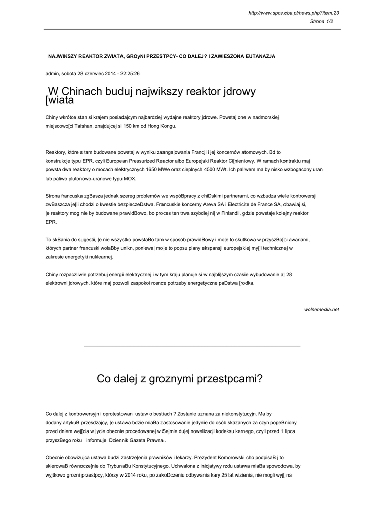 http://www.spcs.cba.pl/news.php?item.23 Strona 1/2 NAJWIKSZY REAKTOR ZWIATA, GROyNI PRZESTPCY- CO DALEJ? I ZAWIESZONA EUTANAZJA admin, sobota 28 czerwiec 2014 - 22:25:26 W Chinach buduj najwikszy reaktor jdrowy [wiata Chiny wkrótce stan si krajem posiadajcym najbardziej wydajne reaktory jdrowe. Powstaj one w nadmorskiej miejscowo[ci Taishan, znajdujcej si 150 km od Hong Kongu. Reaktory, które s tam budowane powstaj w wyniku zaanga|owania Francji i jej koncernów atomowych. Bd to konstrukcje typu EPR, czyli European Pressurized Reactor albo Europejski Reaktor Ci[nieniowy. W ramach kontraktu maj powsta dwa reaktory o mocach elektrycznych 1650 MWe oraz cieplnych 4500 MWt. Ich paliwem ma by nisko wzbogacony uran lub paliwo plutonowo-uranowe typu MOX. Strona francuska zgBasza jednak szereg problemów we wspóBpracy z chiDskimi partnerami, co wzbudza wiele kontrowersji zwBaszcza je[li chodzi o kwestie bezpieczeDstwa. Francuskie koncerny Areva SA i Electricite de France SA, obawiaj si, |e reaktory mog nie by budowane prawidBowo, bo proces ten trwa szybciej ni| w Finlandii, gdzie powstaje kolejny reaktor EPR. To skBania do sugestii, |e nie wszystko powstaBo tam w sposób prawidBowy i mo|e to skutkowa w przyszBo[ci awariami, których partner francuski wolaBby unikn, poniewa| mo|e to popsu plany ekspansji europejskiej my[li technicznej w zakresie energetyki nuklearnej. Chiny rozpaczliwie potrzebuj energii elektrycznej i w tym kraju planuje si w najbli|szym czasie wybudowanie a| 28 elektrowni jdrowych, które maj pozwoli zaspokoi rosnce potrzeby energetyczne paDstwa [rodka. wolnemedia.net _______________________________________________________________________________ Co dalej z groznymi przestpcami? Co dalej z kontrowersyjn i oprotestowan ustaw o bestiach ? Zostanie uznana za niekonstytucyjn. Ma by dodany artykuB przesdzajcy, |e ustawa bdzie miaBa zastosowanie jedynie do osób skazanych za czyn popeBniony przed dniem wej[cia w |ycie obecnie procedowanej w Sejmie du|ej nowelizacji kodeksu karnego, czyli przed 1 lipca przyszBego roku informuje Dziennik Gazeta Prawna . Obecnie obowizujca ustawa budzi zastrze|enia prawników i lekarzy. Prezydent Komorowski cho podpisaB j to skierowaB równocze[nie do TrybunaBu Konstytucyjnego. Uchwalona z inicjatywy rzdu ustawa miaBa spowodowa, by wyjtkowo grozni przestpcy, którzy w 2014 roku, po zakoDczeniu odbywania kary 25 lat wizienia, nie mogli wyj[ na http://www.spcs.cba.pl/news.php?item.23 Strona 2/2 wolno[. Teraz wobec skazanych przed 1 lipca 2015 r. nie bdzie si stosowa [rodków leczniczo-terapeutycznych orzekanych przez sd cywilny, lecz [rodki zabezpieczajce, orzekane ju| przez sd w postpowaniu karnym. wolnemedia.net _______________________________________________________________________________ ETPC zawiesiB eutanazj we Francji Europejski TrybunaB Praw CzBowieka zdecydowaB si nadal wspiera przy |yciu 39 letniego Vincenta Lambert, który od przeszBo sze[ciu lat jest w stanie wegetatywnym. Sd uchyliB postanowienie Sdu Najwy|szego z Francji, który daB eutanazji zielone [wiatBo , ale pod warunkiem zaakceptowania jej przez ww. TrybunaB pisze Le Figaro. Lambert byB na granicy |ycia i [mierci po wypadku samochodowym. Jego |ona i lekarze chc odBczy pacjenta od urzdzeD podtrzymujcych |ycie, ale jego pobo|ni katoliccy rodzice wysBali petycj do Europejskiego TrybunaBu Praw CzBowieka z pro[b o zachowanie |ycia ich syna. Sprawa jest bezprecedensowa we Francji, gdzie eutanazja jest zabroniona, cho w niektórych przypadkach, lekarze mog odBczy czBowieka od aparatury podtrzymujcej |ycie. Prezydent Francois Hollande zamierza w przyszBym roku zmieni prawo, aby umo|liwi godne |egnanie si z |yciem . wolnemedia.net