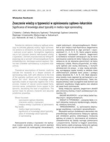 ARCH. MED. SĄD. KRYMINOL., 2011, LXI, 16-19 ARTYKUŁY JUBILEUSZOWE / JUBILLEE PAPERS Władysław Nasiłowski Znaczenie wiedzy o typowości w opiniowaniu sądowo-lekarskim Significance of knowledge about typicality in medico-legal opinionating Z Katedry i Zakładu Medycyny Sądowej i Toksykologii Sądowo-Lekarskiej Śląskiego Uniwersytetu Medycznego w Katowicach p.o. Kierownik: dr med. C. Chowaniec Teoretyczne założenia medycyny sądowej wskazują na potrzebę głębszej analizy reguł opiniowania zarówno w odniesieniu do okresu jej syntezy jak i realizacji przed sądem. Szczególnie negatywną rolę w tym procesie stwarza nadużywanie wiedzy o typowości. Zamiast przyrodoznawczej faktografii pojawiają się w opiniach zdroworozsądkowe formy probabilistyczne, obniżające poziom aspiracji. Opinia traci charakter opiniodawczy a przybiera orzeczniczy. Theoretical assumptions of forensic medicine indicate the necessity of a deeper analysis of opinionating rules, both with reference to the time of the specialty synthesis and its implementation before the court. Misuse of knowledge about typicality creates an especially negative role in this process. Instead of natural science-based facts, common-sense, probabilistic forms appear in the opinions, decreasing the level of aspirations. The opinion loses its advisory character and assumes jurisdictive properties. Słowa kluczowe: opiniowanie sądowo-lekarskie, znaczenie wiedzy o typowości, miejsce wiedzy o typowości w opiniowaniu Key words: medico-legal opinionating, significance of knowledge about typicality, place of knowledge about typicality in opinionating Nadużywanie wiedzy o typowości nie wytrzymuje krytyki racjonalnej, obniża poziom aspiracji opinii i prowadzi do rozstrzygnięć nienaukowych, często spłyconych, zdroworozsądkowych. Streściłem w tym miejscu myśl Kazimierza Jaegermanna wyrażoną wielokrotnie w Jego pismach i wypowiedziach [1, 2, 3, 4, 5]. Samo pojęcie wiedzy o typowości wprowadził właśnie Jaegermann w kontekście rozważań odnoszących się do teorii opiniowania a szerzej do istoty medycyny sądowej, zwłaszcza do jej obszarów granicznych na styku medycyny i prawa. Można przypomnieć, że medycyna sądowa jest nauką stosowaną, z licznymi odniesieniami do prawa – a więc nauką pomostową, wymagającą częstej korekty w zakresie nowo zdefiniowanych podstaw teorii prawa i postępu wiedzy lekarskiej [6, 7, 8, 9, 10]. Brak odpowiedniej korekty może zagrażać jej zachwianiem a nawet stopniową utratą samodzielności. Takie niebezpieczeństwo rodzi szczególnie brak kontroli nad zakresem współpracy biegły-sędzia oraz odejście od zasad teorii opiniowania. Istotę medycyny sądowej Jaegermann określił jako dziedzinę złożoną z trzech podstawowych elementów [4]: - BADAŃ WŁASNYCH – w tym także badań teoretycznych i eksperymentalnych, - WIEDZY O TYPOWOŚCI – czerpanej także z innych obszarów medycyny (epidemiologia, statystyka, dziedziny kliniczne), - WNIOSKOWANIA – tj. opiniowania obejmującego współpracę z wymiarem sprawiedliwości. Niezwykle ważnym dodatkowym elementem dla prawidłowego funkcjonowania medycyny sądowej jest określenie granicy oddzielającej medycynę sądową od prawa tj. opiniowania od orzekania. Uświadomienie tej zasady wymaga powtarzania i przypomnienia, również w kręgach prawników, którzy bardzo często przypisują medycynie sądowej rolę orzeczniczą a nie opiniodawczą [8, 10]. 2011 © by Polskie Towarzystwo Medycyny Sądowej i Kryminologii, ISSN 0324-8267 Nr 1 ZNACZENIE WIEDZY O TYPOWOŚCI W OPINIOWANIU SĄDOWO-LEKARSKIM Przypominając w zarysie założenia teorii opiniowania autorstwa Kazimierza Jaegermanna wskazałbym na kilka wprowadzonych przez Niego pojęć: 1. Określenie poziomu aspiracji opinii – wyrażonej alternatywnie, tj. albo kategorycznie, albo probabilistycznie, a więc nie kategorycznie. Poziom ten w zasadniczym stopniu uzależniony jest od doświadczenia i fachowej, specjalistycznej wiedzy medyka sądowego (eksperta) oraz od umiejętności wykorzystania posiadanej przez niego wiedzy przed sądem. 2. Umiejętność oceny ryzyka niepowodzenia opinii. 3. Ograniczenie stosowania w opinii wiedzy o typowości. 4. Ograniczenie tzw. opiniowania adekwatnego. W ocenie związków przyczynowych określających skutki konieczne utrzymany powinien być rygor biologiczny (ocena skutków realnych, a nie domniemanych). Przedstawione powyżej tezy, a zwłaszcza ograniczenie w stosowaniu w opiniach wiedzy o typowości, powoduje i powodować może, liczne następstwa zarówno w przestrzeni praktycznej jak i teoretycznej. Dotyczy to w znacznej mierze wymiaru prawa. Odnosi się to szczególnie do różnicy pomiędzy rozpoznaniem prawa w zakresie określającym odpowiedzialność a realizmem poznania skutkowego, reprezentowanego przez medycynę sądową. Wg omawianej teorii Jaegermanna poznanie opiniodawcze w medycynie sądowej jest procesem o charakterze porządkowania naukowo-teoretycznego przebiegającego w kilku fazach [1, 4, 11]. Pierwsza faza poznawczo-faktograficzna obejmuje metodologię badawczą ukierunkowaną na systematyzację i porządkowanie uwzględniające przede wszystkim wymogi wiedzy sądowo-lekarskiej. Dopiero w następnej fazie i w trakcie dalszego porządkowania następuje zbliżenie realizacji opinii dla potrzeb prawa. Drogi teorii i praktyki mogą w tym miejscu rozchodzić się. Trzeba wyraźnie podkreślić, iż mimo upraktycznienia, połączonego często z pewnym naciskiem sądu, opinia nie może wkroczyć na obszar uległości wobec wymiaru prawa, gdzie dominuje problematyka odpowiedzialności, winy a nieraz elementów społecznych i wpływów opinii społecznej (społeczne odczucie sprawiedliwości). Wejście na tę drogę groziłoby odejściem od realizmu sądowo-lekarskiego i naruszeniem obszaru skutkowego, reprezentującego podstawową domenę medycyny sądowej. 17 W praktyce naruszenie a nawet złamanie zasady reali
