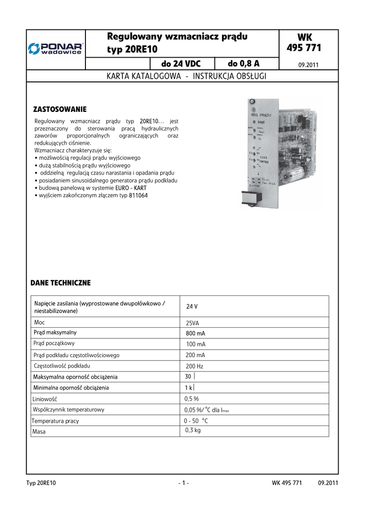 Regulowany wzmacniacz prądu typ 20RE10 do 0,8 A do 24 VDC KARTA KATALOGOWA - INSTRUKCJA OBSŁUGI WK 495 771 09.2011 ZASTOSOWANIE Regulowany wzmacniacz prądu typ 20RE10… jest przeznaczony do sterowania pracą hydraulicznych zaworów proporcjonalnych ograniczających oraz redukujących ciśnienie. Wzmacniacz charakteryzuje się: • możliwością regulacji prądu wyjściowego • dużą stabilnością prądu wyjściowego • oddzielną regulacją czasu narastania i opadania prądu • posiadaniem sinusoidalnego generatora prądu podkładu • budową panelową w systemie EURO - KART • wyjściem zakończonym złączem typ 811064 DANE TECHNICZNE Napięcie zasilania (wyprostowane dwupołówkowo / niestabilizowane) 24 V Moc 25VA Prąd maksymalny 800 mA Prąd początkowy 100 mA Prąd podkładu częstotliwościowego 200 mA Częstotliwość podkładu 200 Hz Maksymalna oporność obciążenia 30 Ω Minimalna oporność obciążenia 1 kΩ Liniowość 0,5 % Współczynnik temperaturowy 0,05 %/ C dla Imax Temperatura pracy 0 - 50 o C 0,3 kg Masa Typ 20RE10 o -1- WK 495 771 09.2011 OPIS DZIAŁANIA Regulowany wzmacniacz prądu typ 20RE10 należy zasilić napięciem 24 V wyprostowanym dwupołówkowo do styków: biegun /+/ do styku 24ab; /0/ do styku 18ab. Poprzez stabilizator napięcia z napięcia zasilania otrzymujemy stabilizowane napięcie +/- 9V: na stykach: 10ab (+9V); 16ab (-9V) do zasilania potencjometru zewnętrznego Pzew, który służy do zadawania wartości prądu wyjściowego. Ślizgacz tego potencjometru należy podłączyć do zacisku 12ab. Elektromagnes zaworu należy podłączyć do zacisków 20ab i 22ab. Po podłączeniu wzmacniacza typ 20RE10 należy jeszcze przeprowadzić regulacje: - prądu początkowego (potencjometr Io) - pradu maksymalnego (potencjometr Ireg) - czasu narastania prądu (potencjometr ) - czasu opadania prądu (potencjometr ) Jeżeli sterowany układ nie wymaga stosowania regulacji czasów narastania i opadania prądu należy zewrzeć zaciski 4 ab i 2 ab. Potencjometry Io, Ireg, , znajdują się na płycie czołowej wzmacniacza. Prąd podkładu jest ustawiony fabrycznie i nie powinien być zmieniony ( jego poziom wynosi I=200mA). SCHEMAT BLOKOWY - prąd początkowy Io Ireg - prąd maksymalny - czas narastania prądu 0,1 ÷ 6 s - czas opadania prądu 0,1 ÷ 6 s WK 495 771 09.2011 Pzew - potencjometr zadający Uzad - pomiar nap. zadającego Iwy - pomiar prądu wyjściowego Błąd - sygnalizacja błędu -2- Typ 20RE10 WYMIARY GABARYTOWE 100 170 89 128 40 CHARAKTERYSTYKA Typ 20RE10 -3- WK 495 771 09.2011 SPOSÓB ZAMAWIANIA 20RE10 Rodzaj wykonania Płyta eurokarty oparta na złączu typ 811064 * =W Numer serii (10 -19) - niezmienne wymiary przyłącza i zabudowy seria 10 = 10 Ewentualne dodatkowe wymagania określone w sposób opisowy (uzgodnione z producentem) UWAGI : Wzmacniacz prądu należy zamawiać wg kodu, ustalonego wg symboli z powyższej tabeli. Przykład kodu wzmacniacza prądu w zamówieniu: 20RE10 W 10 PONAR Wadowice S.A. ul. Wojska Polskiego 29 34-100 Wadowice tel. +48 33 488 21 00 fax.+48 33 488 21 03 www.ponar-wadowice.pl WK 495 771 09.2011 -4- Typ 20RE10