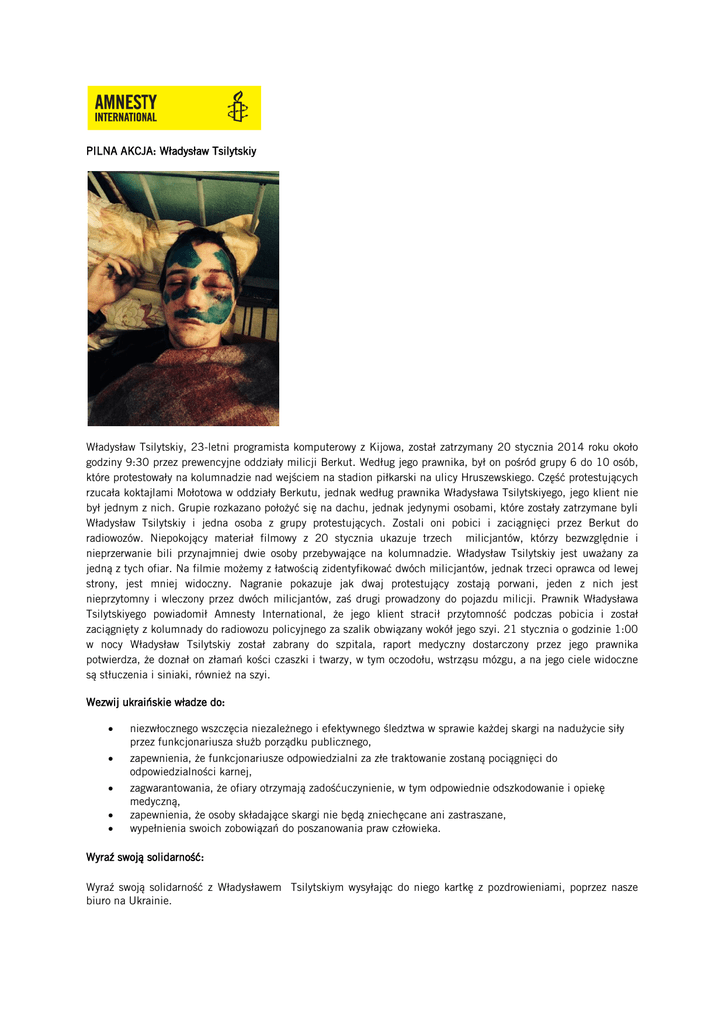 PILNA AKCJA: Władysław Tsilytskiy Władysław Tsilytskiy, 23-letni programista komputerowy z Kijowa, został zatrzymany 20 stycznia 2014 roku około godziny 9:30 przez prewencyjne oddziały milicji Berkut. Według jego prawnika, był on pośród grupy 6 do 10 osób, które protestowały na kolumnadzie nad wejściem na stadion piłkarski na ulicy Hruszewskiego. Część protestujących rzucała koktajlami Mołotowa w oddziały Berkutu, jednak według prawnika Władysława Tsilytskiyego, jego klient nie był jednym z nich. Grupie rozkazano położyć się na dachu, jednak jedynymi osobami, które zostały zatrzymane byli Władysław Tsilytskiy i jedna osoba z grupy protestujących. Zostali oni pobici i zaciągnięci przez Berkut do radiowozów. Niepokojący materiał filmowy z 20 stycznia ukazuje trzech milicjantów, którzy bezwzględnie i nieprzerwanie bili przynajmniej dwie osoby przebywające na kolumnadzie. Władysław Tsilytskiy jest uważany za jedną z tych ofiar. Na filmie możemy z łatwością zidentyfikować dwóch milicjantów, jednak trzeci oprawca od lewej strony, jest mniej widoczny. Nagranie pokazuje jak dwaj protestujący zostają porwani, jeden z nich jest nieprzytomny i wleczony przez dwóch milicjantów, zaś drugi prowadzony do pojazdu milicji. Prawnik Władysława Tsilytskiyego powiadomił Amnesty International, że jego klient stracił przytomność podczas pobicia i został zaciągnięty z kolumnady do radiowozu policyjnego za szalik obwiązany wokół jego szyi. 21 stycznia o godzinie 1:00 w nocy Władysław Tsilytskiy został zabrany do szpitala, raport medyczny dostarczony przez jego prawnika potwierdza, że doznał on złamań kości czaszki i twarzy, w tym oczodołu, wstrząsu mózgu, a na jego ciele widoczne są stłuczenia i siniaki, również na szyi. Wezwij ukraińskie władze do: niezwłocznego wszczęcia niezależnego i efektywnego śledztwa w sprawie każdej skargi na nadużycie siły przez funkcjonariusza służb porządku publicznego, zapewnienia, że funkcjonariusze odpowiedzialni za złe traktowanie zostaną pociągnięci do odpowiedzialności karnej, zagwarantowania, że ofiary otrzymają zadośćuczynienie, w tym odpowiednie odszkodowanie i opiekę medyczną, zapewnienia, że osoby składające skargi nie będą zniechęcane ani zastraszane, wypełnienia swoich zobowiązań do poszanowania praw człowieka. Wyraź swoją solidarność: Wyraź swoją solidarność z Władysławem Tsilytskiym wysyłając do niego kartkę z pozdrowieniami, poprzez nasze biuro na Ukrainie. Adres ukraińskiego biura Amnesty International: Amnesty International Ukraine 3-A vul. Dehtyarivska, Kyiv 04050 Ukraine Możesz wykorzystać poniższe zwroty w języku ukraińskim: Życzę Ci jak najlepiej: Я бажаю тобі всього найкращого, Życzymy Ci jak najlepiej: Ми бажаємо тобі всього найкращого Życzę powrotu do zdrowia: Я сподіваюсь на твоє швидке одужання Życzymy powrotu do zdrowia: Ми сподіваємось на твоє швидке одужання ADRESY: Markijan Malskyj Ambasador Nadzwyczajny i Pełnomocny Ukrainy w Rzeczypospolitej Polskiej Ambasada Ukrainy w Rzeczypospolitej Polskiej Al. J. Ch. Szucha 7 00-580 Warszawa Polska PRESIDENT VICTOR YANUKOVYCH VUL. BANKOVAYA 11 01220 KYIV UKRAINE TEL: +380 44 255 78 00 (INFO PHONE FOR THE CITIZENS) PRESIDENTIAL ADMINISTRATION: +380 44 255 68 51 FAX: +38 44 255 61 61 EMAIL: INFORM@АPU.GOV.UA SALUTATION: DEAR PRESIDENT PROSECUTOR GENERAL VIKTOR PAVLOVICH PSHONKA VUL. RIZNITSKA 13/15 01601 KYIV UKRAINE TEL: +380 44 200 7574 FAX: + 380 44 280 2603 EMAIL: [email protected] SALUTATION: DEAR PROSECUTOR GENERAL MINISTER OF INTERNAL AFFAIRS VITALIY ZAKHARCHENKO VUL. AKADEMIKA BOGOMOLTSA 10 01024 KYIV UKRAINE TEL: + 380 44 256 03 33 FAX: +380 44 253 97 96 EMAIL: [email protected] SALUTATION: DEAR MINISTER THE UKRAINIAN PARLIAMENTARY COMMISSIONER FOR HUMAN RIGHTS VALERIA LUTKOVSKA VUL. INSTITUTSKA 21/8 01008 KYIV UKRAINE TEL: +380 44 253 2091 FAX: +380 44 226 3427 EMAIL: [email protected] [email protected]