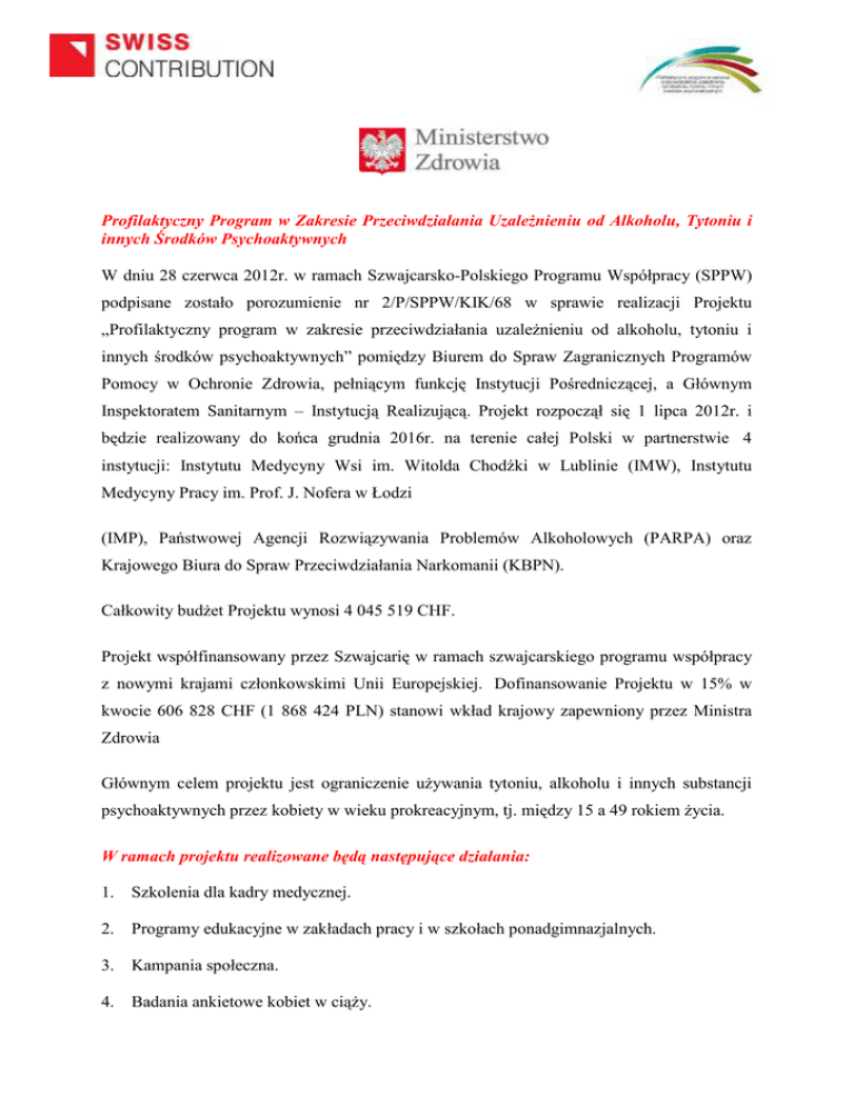 Profilaktyczny Program w Zakresie Przeciwdziałania UzaleŜnieniu od Alkoholu, Tytoniu i innych Środków Psychoaktywnych W dniu 28 czerwca 2012r. w ramach Szwajcarsko-Polskiego Programu Współpracy (SPPW) podpisane zostało porozumienie nr 2/P/SPPW/KIK/68 w sprawie realizacji Projektu „Profilaktyczny program w zakresie przeciwdziałania uzaleŜnieniu od alkoholu, tytoniu i innych środków psychoaktywnych” pomiędzy Biurem do Spraw Zagranicznych Programów Pomocy w Ochronie Zdrowia, pełniącym funkcję Instytucji Pośredniczącej, a Głównym Inspektoratem Sanitarnym – Instytucją Realizującą. Projekt rozpoczął się 1 lipca 2012r. i będzie realizowany do końca grudnia 2016r. na terenie całej Polski w partnerstwie 4 instytucji: Instytutu Medycyny Wsi im. Witolda Chodźki w Lublinie (IMW), Instytutu Medycyny Pracy im. Prof. J. Nofera w Łodzi (IMP), Państwowej Agencji Rozwiązywania Problemów Alkoholowych (PARPA) oraz Krajowego Biura do Spraw Przeciwdziałania Narkomanii (KBPN). Całkowity budŜet Projektu wynosi 4 045 519 CHF. Projekt współfinansowany przez Szwajcarię w ramach szwajcarskiego programu współpracy z nowymi krajami członkowskimi Unii Europejskiej. Dofinansowanie Projektu w 15% w kwocie 606 828 CHF (1 868 424 PLN) stanowi wkład krajowy zapewniony przez Ministra Zdrowia Głównym celem projektu jest ograniczenie uŜywania tytoniu, alkoholu i innych substancji psychoaktywnych przez kobiety w wieku prokreacyjnym, tj. między 15 a 49 rokiem Ŝycia. W ramach projektu realizowane będą następujące działania: 1. Szkolenia dla kadry medycznej. 2. Programy edukacyjne w zakładach pracy i w szkołach ponadgimnazjalnych. 3. Kampania społeczna. 4. Badania ankietowe kobiet w ciąŜy. 5. Przygotowanie platformy internetowej – Systemu Elektronicznego Monitorowania i Promocji Zdrowia. Więcej o Szwajcarsko-Polskim Programie Współpracy: www.programszwajcarski.gov.pl www.swiss-contribution.admin.ch/poland