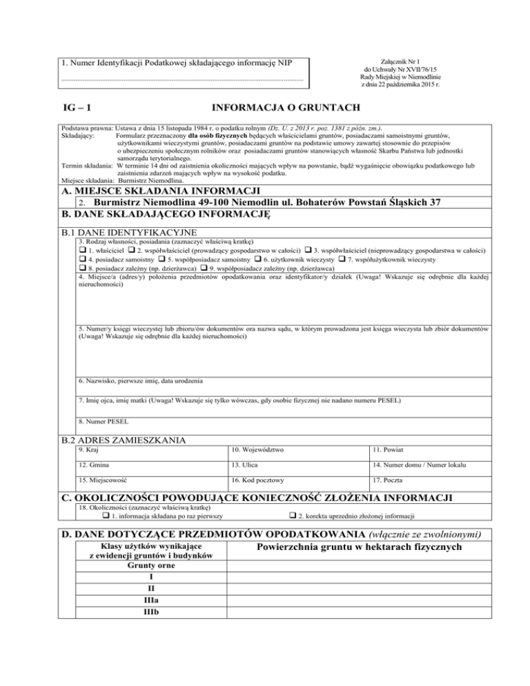 1. Numer Identyfikacji Podatkowej składającego informację NIP ........................................................................................................................................ IG – 1 Załącznik Nr 1 do Uchwały Nr XVII/76/15 Rady Miejskiej w Niemodlinie z dnia 22 października 2015 r. INFORMACJA O GRUNTACH Podstawa prawna: Ustawa z dnia 15 listopada 1984 r. o podatku rolnym (Dz. U. z 2013 r. poz. 1381 z późn. zm.). Składający: Formularz przeznaczony dla osób fizycznych będących właścicielami gruntów, posiadaczami samoistnymi gruntów, użytkownikami wieczystymi gruntów, posiadaczami gruntów na podstawie umowy zawartej stosownie do przepisów o ubezpieczeniu społecznym rolników oraz posiadaczami gruntów stanowiących własność Skarbu Państwa lub jednostki samorządu terytorialnego. Termin składania: W terminie 14 dni od zaistnienia okoliczności mających wpływ na powstanie, bądź wygaśnięcie obowiązku podatkowego lub zaistnienia zdarzeń mających wpływ na wysokość podatku. Miejsce składania: Burmistrz Niemodlina. A. MIEJSCE SKŁADANIA INFORMACJI 2. Burmistrz Niemodlina 49-100 Niemodlin ul. Bohaterów Powstań Śląskich 37 B. DANE SKŁADAJĄCEGO INFORMACJĘ B.1 DANE IDENTYFIKACYJNE 3. Rodzaj własności, posiadania (zaznaczyć właściwą kratkę) 1. właściciel 2. współwłaściciel (prowadzący gospodarstwo w całości) 3. współwłaściciel (nieprowadzący gospodarstwa w całości) 4. posiadacz samoistny 5. współposiadacz samoistny 6. użytkownik wieczysty 7. współużytkownik wieczysty 8. posiadacz zależny (np. dzierżawca) 9. współposiadacz zależny (np. dzierżawca) 4. Miejsce/a (adres/y) położenia przedmiotów opodatkowania oraz identyfikator/y działek (Uwaga! Wskazuje się odrębnie dla każdej nieruchomości) 5. Numer/y księgi wieczystej lub zbioru/ów dokumentów ora nazwa sądu, w którym prowadzona jest księga wieczysta lub zbiór dokumentów (Uwaga! Wskazuje się odrębnie dla każdej nieruchomości) 6. Nazwisko, pierwsze imię, data urodzenia 7. Imię ojca, imię matki (Uwaga! Wskazuje się tylko wówczas, gdy osobie fizycznej nie nadano numeru PESEL) 8. Numer PESEL B.2 ADRES ZAMIESZKANIA 9. Kraj 10. Województwo 11. Powiat 12. Gmina 13. Ulica 14. Numer domu / Numer lokalu 15. Miejscowość 16. Kod pocztowy 17. Poczta C. OKOLICZNOŚCI POWODUJĄCE KONIECZNOŚĆ ZŁOŻENIA INFORMACJI 18. Okoliczności (zaznaczyć właściwą kratkę) 1. informacja składana po raz pierwszy 2. korekta uprzednio złożonej informacji D. DANE DOTYCZĄCE PRZEDMIOTÓW OPODATKOWANIA (włącznie ze zwolnionymi) Klasy użytków wynikające Powierzchnia gruntu w hektarach fizycznych z ewidencji gruntów i budynków Grunty orne I II IIIa IIIb IVa IVb V VI VIz Sady I II IIIa IIIb IVa IVb V VI VIz Użytki zielone I II III IV V VI VIz Grunty rolne zabudowane I II IIIa III IIIb IVa IV IVb V VI VIz Grunty pod stawami a) zarybione, łososiem, trocią, głowacicą, palią i pstrągiem; grunty rolne zabudowane (bez oznaczenia klasy) b) zarybione innymi gatunkami ryb niż w poz. a); grunty pod stawami niezarybionymi; grunty zadrzewione i zakrzewione na użytkach rolnych oraz grunty pod rowami (bez oznaczenia klasy) Rowy Grunty zadrzewione i zakrzaczone położone na UR I II IIIa III IIIb IVa IV V VI VIz Razem E. INFORMACJA O UŻYTKACH ROLNYCH POŁOŻONYCH NA TERENIE INNYCH GMIN (MIASTA) RZECZPOSPOLITEJ POLSKIEJ (podać nazwę gminy, powiat, województwo oraz rodzaj, klasę i powierzchnię użytków rolnych) F. INFORMACJA O PRZEDMIOTACH ZWOLNIONYCH (podać rodzaj, klasę i powierzchnię gruntów zwolnionych oraz przepis prawa – z jakiego tytułu występuje zwolnienie) G. OŚWIADCZENIE I PODPIS SKŁADAJĄCEGO / OSOBY REPREZENTUJĄCEJ SKŁADAJĄCEGO Oświadczam, że podane przeze mnie dane są zgodne z prawdą 19. Imię i nazwisko 21. Data wypełnienia (dzień - miesiąc - rok) 20. Numer telefonu 22. Podpis (pieczęć) składającego / osoby reprezentującej składającego H. ADNOTACJE ORGANU PODATKOWEGO 23. Uwagi organu podatkowego 24. Identyfikator przyjmującego formularz 25. Data i podpis przyjmującego formularz