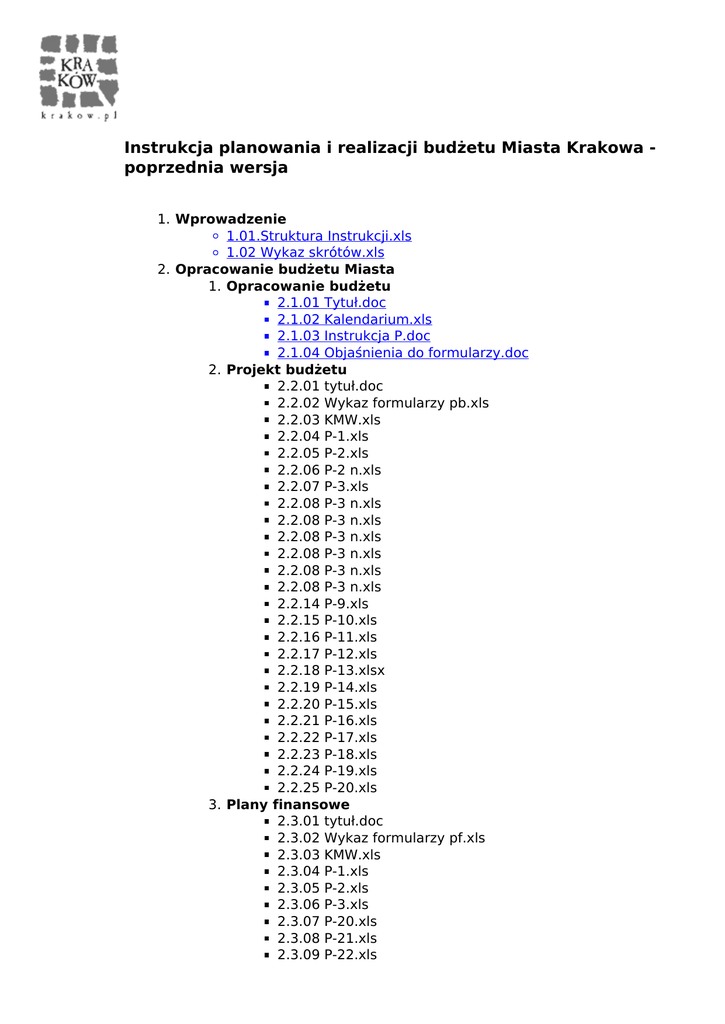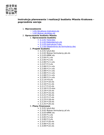 Instrukcja planowania i realizacji budżetu Miasta Krakowa poprzednia wersja 1. Wprowadzenie 1.01.Struktura Instrukcji.xls 1.02 Wykaz skrótów.xls 2. Opracowanie budżetu Miasta 1. Opracowanie budżetu 2.1.01 Tytuł.doc 2.1.02 Kalendarium.xls 2.1.03 Instrukcja P.doc 2.1.04 Objaśnienia do formularzy.doc 2. Projekt budżetu 2.2.01 tytuł.doc 2.2.02 Wykaz formularzy pb.xls 2.2.03 KMW.xls 2.2.04 P-1.xls 2.2.05 P-2.xls 2.2.06 P-2 n.xls 2.2.07 P-3.xls 2.2.08 P-3 n.xls 2.2.08 P-3 n.xls 2.2.08 P-3 n.xls 2.2.08 P-3 n.xls 2.2.08 P-3 n.xls 2.2.08 P-3 n.xls 2.2.14 P-9.xls 2.2.15 P-10.xls 2.2.16 P-11.xls 2.2.17 P-12.xls 2.2.18 P-13.xlsx 2.2.19 P-14.xls 2.2.20 P-15.xls 2.2.21 P-16.xls 2.2.22 P-17.xls 2.2.23 P-18.xls 2.2.24 P-19.xls 2.2.25 P-20.xls 3. Plany finansowe 2.3.01 tytuł.doc 2.3.02 Wykaz formularzy pf.xls 2.3.03 KMW.xls 2.3.04 P-1.xls 2.3.05 P-2.xls 2.3.06 P-3.xls 2.3.07 P-20.xls 2.3.08 P-21.xls 2.3.09 P-22.xls 2.3.10 P-23.xls 2.3.11 P-24.xls 2.3.12 P-25.xlsx 2.3.13 P-26.xls 2.3.14 P-27.xls 2.3.15 P-28.xls 2.3.16 P-29.xls 3. Wprowadzanie zmian w budżecie Miasta 1. Zmiany w budżecie 3.1.01 Tytuł.doc 3.1.02 Instrukcja Z.doc 3.1.03 Tytuł.doc 3.1.04 Wykaz formularzy zmiany.xls 3.1.05 Z-1.xls 3.1.06 Z-2.xls 3.1.07 Z-2u.xls 3.1.08 Z-3.xls 3.1.09 Z-4.xls 3.1.10.Z-5.xls 3.1.11 Z-6.xls 3.1.12 Z-7.xls 3.1.13 Z-8.xls 3.1.14 Z-9.xls 3.1.15 Z-10.xls 3.1.16 Z-11.xls 3.1.17 Z-12.xls 3.1.18 Z-13.xls 3.1.19 Z-14.xls 4. Informacja - Sprawozdanie z wykonania budżetu Miasta 1. Informacja - Sprawozdanie 4.1.01 tytuł.doc 4.1.02 Instrukcja S.doc 4.1.03 Objaśnienia do formularzy.doc 4.1.04 tytuł.doc 4.1.05 Wykaz formularzy spraw.xls 4.1.06 S-1.xls 4.1.07 S-2.xls 4.1.08 S-3.xls 4.1.09 S-4.xls 4.1.10 S-5.xls 4.1.11 S-6.xls 4.1.12 S-7.xls 4.1.13 S-8.xls 4.1.14 S-9.xls 4.1.15 S-10.xls 4.1.16 S-11.xls 4.1.17 S-12.xls 4.1.18 S-13.xls 4.1.19 S-14.xls 4.1.20 S-15.xls 4.1.21 S-16.xls 4.1.22 S-17.xls 4.1.23 S-18.xls 2. Plany finansowe 4.1.24 S-19.xlsx 4.1.25 S-20.xls 4.1.26 S-21.xls Powered by TCPDF (www.tcpdf.org)