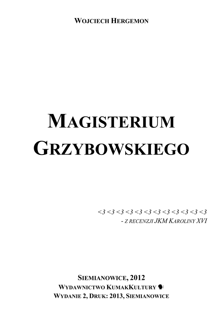 WOJCIECH HERGEMON MAGISTERIUM GRZYBOWSKIEGO <3 <3 <3 <3 <3 <3 <3 <3 <3 <3 <3 <3 - Z RECENZJI JKM KAROLINY XVI SIEMIANOWICE, 2012 WYDAWNICTWO KUMAKKULTURY WYDANIE 2, DRUK: 2013, SIEMIANOWICE 2|Strona 5 kwietnia 2012 Prometeusz Grzybowski, dla przyjaciół „Grzybek”, siedział z posępną miną w swoim obskurnym akademikowym pokoju. Zgromadzeni bali się spytać co znowu wymyślił jego promotor, profesor Bombina – wszyscy wiedzieli, że nie był on zbytnio skłonny do negocjacji ze studentami. Mózg Grzybka pracował na najwyższych obrotach, wielokrotnie odtwarzał od przodu do tyłu i wicewersacze przebieg rozmowy z profesorem. Kurwa, czemu znowu wszystko musiało się spierdolić, mimo że wchodząc do kanciapy gotowy był na wszystko, a na każde pytanie miał gotową, niemalże perfekcyjną odpowiedź. Nie zaskoczyło go to, że tuż zza uchylonych drzwi ulatniał się odór jakieś dziwacznej wódki, zapewne pędzonej przez studentów farmacji, nie robiło na nim również wrażenia, że w ciasnej kanciapie Bombiny, oprócz samego Bombiny i wiadra gromadzącego kapiącą z sufitu deszczówkę, siedział dziekan Manescu, paru egzotycznych profesorów z WzDWK oraz jakiś drant-przydupas, którego gustowny poliestrowy krawat jasno wskazywał czyim może być przydupasem, na pewno doktoryzował się na jakieś politologii albo innej europeistyce. Grzybek, zgodnie ze starodawnym uniwersyteckim rytuałem olał dranta, machnął ręką profesorom z Dupy Wysranych i skłonił się przed dziekanami. Oczywiście nie zaskoczyło go zachowanie dziekana Bombiny, który po chwili badania przejrzystości trunku w porwanej ze stołu butelce rzucił: - Panie Grzywacki, weź pan wódki nalej, a nie stój jak jakaś wandejska ciota z kijem od mietły w dupie. Prostowanie nazwiska nie miało sensu, za wpis z seminarki mógłby się dzisiaj nazywać nawet Lółtkowski. Rozlał wszystkim, oczywiście poza drantem, który sam sobie nalał, wypił razem z szacownym gronem. Wódka zawierała silne wspomnienie składników, o których zdecydowanie nie należało wspominać podczas produkcji jakichkolwiek produktów spożywczych. Bombina nadal, ku jego wielkiej radości jechał z dobrze znanego mu szablonu: - Grzywacki leniu, pewnie znowu nic nie masz i przychodzisz tu oczyma świecić za wpis? - Panie profesorze, mam już w sumie przemyślane wszystkie rozdziały, przeczytam jeszcze jedną książkę, i całe święta… - To zajebiście, że nic nie masz. W tym momencie Grzybek poczuł się dokładnie tak, jak kiedyś, gdy za młodu (ależ był wtedy nieodpowiedzialny) zaciągnął się srumuńskim papierosem. Siła Coriolisa zaczęła być odczuwalna, obraz lekko zaczął się zamazywać. Przecież powinien go 3|Strona zwyczajnie opierdolić, a nie wyskakiwać z jakimś „zajebiście” – co to w ogóle ma być? Powinien coś odpowiedzieć, udać że wie o co chodzi, ale nawet już przytępawy drant uśmiechał się szyderczo. Co za pech – pomyślał – po ponad 4 latach studiów połapali się nagle, że uczciwie zdałem jedynie propedeutykę do politologii. Patrzył na twarze z Dupy Wysranych profesorów, na ich oczy, w których skrzyły się iskierki wykształciuchowego triumfu, na dziekana Manescu, który zaciągał się samundzkim cygarem. Nie, nie mógł się teraz poddać bez walki, karty nadal jeszcze były w grze. - Panie profesorze, bo z tym egzaminem z Historii Ustroju… - Na łeb żeś z choinki spadł Grzywacki? Co mnie jakaś historia obchodzi, przecież te przedmioty są tylko po to, żeby odsiać największych idiotów. Projekt jest, jakiś durny ze środków federalnych, że mogę wysłać kogoś za granicę i zamiast pisać ten magisterski bełkot może się sprawdzić w praktyce. Pan żeś gówno napisał, to Pana wyślemy. Grzybek odzyskał oddech, znowu Mancalaga miała go w swojej opiece. W sumie, to znów mu się udało, zamiast męczyć się i pisać, pojedzie sobie pewnie do Austro-Węgier, pozwiedza tamtejsze sądy, wygłosi jakiś referacik i będzie cacy. - Idź Pan do pani Basi w sekretariacie, dostaniesz papierki delegacji i et cetere, a potem już z górki, polecisz do Sarmacji i przywieziesz nam do wydziału kamień art. 5. Drant wybuchnął chłopskim, głupkowatym śmiechem, dziekan Manescu udał, że niesamowicie zaintrygował go 17 tom „Erudycji” autorstwa Larka Mipy, Sosna przepił ogórka kresowego wodą z wiadra. No tak, pięknie kurwa, nawet mnie uczciwie wypierdolić nie chcą – pomyślał Grzybowski. - A, kamień masz przywieźć do 10 kwietnia. Najpoźniej. A w ogóle panie profesorze Sosna, ja rozumiem, że ten wasz drant wygląda jak osioł i ryczy jak prosie, ale na przyszłość zamiast siedzieć u mnie w kanciapie, niechże lepiej sprawdza czy nie ma go aby w toalecie. - No, tak to pokrótce było – skończył opowieść Grzybek. Wróciła znowu niezręczna cisza, słychać było jak mucha starannie wyciera nogi o masło. W końcu ciszę przerwał Siwy, uczelniana dusza towarzystwa, który studiował na Putrze już tak długo, że podobno pamiętał czasy kiedy to Nani był adiunktem. - O kurwa. 4|Strona 6 kwietnia 2012 Natura zdawała się krzyczeć wszystkimi siłami – Grzybowski nie jedź do Sarmacji! Słońce ukryte było głęboko w chmurach, niczym jedzenie na dworze Księcia Aleksandra za czasów BRC, deszcz walił z całych sił, nie oszczędzając skacowanego Grzybka, a psie gówna same pchały się pod podeszwę. Do tej pory o 5 rano, owszem, zdarzało mu się, ale nie wstawać tylko iść spać. Ale przynajmniej w końcu zrozumiał dla kogo kursują nocne pociągi, o tej porze wsiadała do nich chyba tylko cała ta szpiegowska hałastra i handlarze jajek. Tak czy siak, o 19 musiał być w Wiedniu – sekretariat wśród licznych świstków zapewnił mu austro-węgierski paszport wystawiony na Fryderyka Grzybowskiego. Kurwa, przynajmniej raz w życiu miał w miarę normalne imię. Skład Volkswagona, który z wielkim wysiłkie