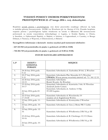 TYDZIEŃ POMOCY OSOBOM POKRZYWDZONYM PRZESTĘPSTWEM 22 -27 lutego 2016 r. woj. dolnośląskie Bezpłatne porady prawne i psychologiczne oraz dyżur pracownika socjalnego odbywać się będą w siedzibie głównej Stowarzyszenia INTRO we Wrocławiu (pl. św. Macieja 4/5/6). Ponadto bezpłatne wsparcie prawne i psychologiczne będzie świadczone na terenie w kilkunastu filii stowarzyszenia położonych na terenie województwa dolnośląskiego: w Legnicy, w Środzie Śląskiej, w Oławie, w Strzelinie, w Ząbkowicach Śląskich, w Miękini, w Sobótce, w Łagiewnikach, w Czernicy, w Brzegu Dolnym, w Niemczy, w Wiązowie, w Dzierżoniowie, w Bielawie Szczegółowe informacje o dyżurach można uzyskać pod numerami telefonów: - 667-323-965 (od poniedziałku do piątku w godzinach od 8.00 do 15:00) - 730-304-749 (od poniedziałku do piątku w godzinach od 15.00 do 19.00) DYŻURY KANCELARII ADWOKACKICH L.P 1. 2. 3. 4. 5. 6. 7. 8. DZIEŃ I GODZINA PORADY 24-26 luty 2016 godz. 9-14 22-27 luty 2016 godz. 9-15 22-26 luty 2016 godz. 12-15 23-24 luty 2016 godz. 10-17 26 luty 2016 godz.1015 22-23 luty 2016 godz. 17-19.30 22 luty 2016 godz. 1113 22 luty 2016 godz. 1014 22 luty 2016 godz. 1216 23-24 luty 2016 godz. 10-16 26 luty 2016 godz. 1016 MIEJSCE Kancelaria Adwokacka ul. Zachodnia 20 lok. 2, Wrocław Kancelaria Adwokacka Plac Muzealny 8/3, Wrocław UWAGA. Wizytę proszę wcześniej umówić tel. 71/ 341 12 33 Kancelaria Adwokacka Rynek 58, pok. 36, Wrocław Kancelaria Adwokacka ul. Krawiecka 3 lok. 81 Wrocław (budynek Justin Center) Kancelaria Adwokacka ul. Andersa 14 IIp. 59-220 Legnica Kancelaria Adwokacka ul. Wrocławska 10 (wejście od ul. Kąpielowej) Wołów Kancelaria Adwokacka ul. Kostrzyńska 2 Wrocław Kancelaria Adwokacka ul. Gen. J. Bema 9B/1 Lubin Kancelaria Adwokacka ul. Włodkowica 21B/18, p. III Kancelaria Adwokacka ul. B. Chrobrego 15/13 Oława Kancelaria Adwokacka ul. Włodkowica 21B/18, p. III DYŻURY W OKRĘGOWEJ IZBIE RADCÓW PRAWNYCH we Wrocławiu, ul. Włodkowica 8. Bezpłatne porady prawne udzielane są w poniedziałki w godzinach 16.30-18.00. NADODRZAŃSKI ODDZIAŁ STRAŻY GRANICZNEJ - Placówka Straży Granicznej we Wrocławiu-Strachowicach. Godziny przyjmowania interesantów w sprawach dot. cudzoziemców, w których właściwy jest Komendant PSG we Wrocławiu Strachowicach: od poniedziałku do piątku, w godz. 7.30-15.30 DYŻURY KANCELARII KOMORNICZYCH 1. Komornik Sądowy przy Sądzie Rejonowym w Lubinie ul. Odrodzenia 18/3, 59-300 Lubin, tel 076 841 51 00 2. Komornik Sądowy przy Sądzie Rejonowym w Świdnicy ul. Komunardów 4/1, 58-100 Świdnica, tel. 074 853 61 27 3. Komornik Sądowy przy Sądzie Rejonowym dla Wrocławia-Krzyków ul. Kościuszki 6/10, 50-038 Wrocław, tel. 071 344 70 19 4. Komornik Sądowy przy Sądzie Rejonowym w Kłodzku ul. Okrzei 11/3, 57-300 Kłodzko, tel.074 811 35 76 5. Komornik Sądowy przy Sądzie Rejonowym w Trzebnicy ul. Mostowa 4, 55-100 Trzebnica, tel. 071 711 15 16 6. Komornik Sądowy przy Sądzie Rejonowym w Oleśnicy ul. Kilińskiego 2, 56-400 Oleśnica, tel. 071 758 53 12 7. Komornik Sądowy przy Sądzie Rejonowym w Legnicy ul. Chojnowska 76, 59-220 Legnica, tel. 076 856 56 74 8. Komornik Sądowy przy Sądzie Rejonowym dla Wrocławia-Śródmieścia ul. Zielińskiego 39, 53-533 Wrocław, tel .071 795 66 78 9. Komornik Sądowy przy Sądzie Rejonowym w Dzierżoniowie ul. Świdnicka 38 bud 2A/2/II Dzierżoniów, tel. 074 831 51 95 10. Komornik Sądowy przy Sądzie Rejonowym w Wałbrzychu ul. Słowackiego 3/2, 58-300 Wałbrzych, tel. 074 842 12 10 11. Komornik Sądowy przy Sądzie Rejonowym dla Wrocławia-Fabrycznej pl. Legionów 17/4, 50-047 Wrocław, tel. 071 344 75 79 12. Komornik Sądowy przy Sądzie Rejonowym w Bolesławcu ul. Sądowa 7, 59-700 Bolesławiec, tel. 075 644 81 53 13. Komornik Sądowy przy Sądzie Rejonowym w Trzebnicy ul Rooseveleta 8, 55-100 Trzebnica, tel. 071 312 15 04 14. Komornik Sądowy przy Sądzie Rejonowym w Zgorzelcu ul. Warszawska 7/5, 59-900 Zgorzelec, tel. 075 771 72 57 15. Komornik Sądowy przy Sądzie Rejonowym w Głogowie ul. Grodzka 20, 67-200 Głogów, 076 831 29 97 DYŻURY I ZESPOŁU KURATORSKIEJ SŁUŻBY SĄDOWEJ DO WYKONYWANIA ORZECZEŃ W SPRAWACH KARNYCH, RODZINNYCH I NIELETNICH w Środzie Śląskiej ul. Św. Andrzeja 3 pok. 301, piętro III. Bezpłatne porady kuratorów odbywać się będą w dniach 22-23-24 lutego 2016 roku w godzinach od 07:30 do 15:30. DYŻURY PROKURATORÓW Prokuratura Rejonowa dla Wrocławia –Fabrycznej Prokuratura Rejonowa dla Wrocławia –Krzyki Wschód Prokuratura Rejonowa dla Wrocławia –Krzyki Zachód Prokuratura Rejonowa dla Wrocławia –Śródmieście Prokuratura Rejonowa dla Wrocławia –Stare Miasto Prokuratura Rejonowa dla Wrocławia – Psie Pole Prokuratura Rejonowa w Oleśnicy Prokuratura Rejonowa w Oleśnicy Prokuratura Rejonowa w Oławie Prokuratura Rejonowa w Miliczu Prokuratura Rejonowa w Strzelinie Prokuratura Rejonowa w Środzie Śląskiej Prokuratura Rejonowa w Trzebnicy Prokuratura Rejonowa w Wołowie