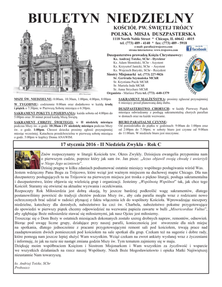 BIULETYN NIEDZIELNY KOĝCIÓà PW. ĝWIĉTEJ TRÓJCY POLSKA MISJA DUSZPASTERSKA 1118 North Noble Street * Chicago, IL 60642 - 4015 tel. (773) 489 - 4140 * fax: (773) 489 - 5918 e-mail: [email protected] strona internetowa: www.trojcowo.com Duszpasterstwo prowadzą KsiĊĪa Chrystusowcy: Ks. Andrzej Totzke, SChr - Dyrektor Ks. Adam SáomiĔski, SChr - Asystent Ks. Krzysztof Janicki, SChr - Asystent Ks. Wojciech Baryski, SChr - Rezydent Siostry Misjonarki tel. (773) 227-9826 Sr. Gertruda SzymaĔska MChR Sr. Krystiana Pucik MChR Sr. Mariola Inda MChR Sr. Anna Strycharz MChR Organista - Mariusz Pluta tel. (773) -640-1379 MSZE ĝW. NIEDZIELNE: 8:00am, 10:30am, 1:00pm, 4:00pm, 8:00pm W TYGODNIU: codziennie 8:00am oraz dodatkowo w kaĪdą ĞrodĊ i piątek o 7:30pm; w Pierwszą SobotĊ miesiąca o 6:30pm. SAKRAMENT POKUTY I POJEDNANIA: kaĪda sobota od 4:00pm do 5:00pm oraz 30 minut przed kaĪdą Mszą ĝwiĊtą. SAKRAMENT CHRZTU ĝWIĉTEGO: w II niedzielĊ miesiąca podczas Mszy Ğw. o godz. 10:30am i IV niedzielĊ miesiąca podczas Mszy Ğw. o godz. 1:00pm. Chrzest dziecka prosimy zgáosiü przynajmniej miesiąc wczeĞniej. Katacheza przedchrzcielna w pierwszą sobotĊ miesiąca o godz. 5:00pm w kaplicy Domu ANAWIM. SAKRAMENT MAàĩEēSTWA: prosimy zgáaszaü przynajmniej 6 miesiĊcy przed planowaną datą Ğlubu. DUSZPASTERSTWO CHORYCH: w kaĪdy Pierwszy Piątek miesiąca odwiedzamy z posáugą sakramentalną chorych parafian w domach oraz na kaĪde wezwanie. BIURO PARAFIALNE CZYNNE: Od poniedziaáku do piątku w godzinach: 9:00am do 1:00pm oraz od 2:00pm do 7:30pm; w soboty biuro jest czynne od 9:00am do 11:00am. W niedziele biuro jest nieczynne. 17 stycznia 2016 - II Niedziela Zwykáa - Rok C Znów rozpoczynamy w liturgii KoĞcioáa tzw. Okres Zwykáy. Dzisiejsza ewangelia przypomina nam o pierwszym cudzie, poprzez który jak sam Ğw. Jan pisze: „Jezus objawiá swoją chwaáĊ i uwierzyli w Niego Jego uczniowie”. Dzisiaj pragnĊ w kilku zdaniach podsumowaü ostatnie miesiĊcy wspólnego posáugiwania wĞród Was. Jestem wdziĊczny Panu Bogu za Trójcowo, które wciąĪ jest waĪnym miejscem na duchowej mapie Chicago. Dla nas duszpasterzy posáugujących tu na Trójcowie na pierwszym miejscu jest troska o piĊkno liturgii, posáuga sakramentalna i duszpasterstwo, które objawia siĊ wieloĞcią grup i organizacji. JesteĞmy „Wspólnotą Wspólnot” tak, jak chce tego KoĞcióá. Staramy siĊ otwieraü na aktualne wyzwania i oczekiwania. RozpoczĊty Rok Miáosierdzia jest dobrą okazją, by jeszcze bardziej podkreĞliü wagĊ sakramentów, dlatego postanowiliĞmy powróciü do tradycji chrztów podczas Mszy Ğw., aby caáa parafia mogáa wraz z rodzicami nowo ochrzczonych braü udziaá w radoĞci páynącej z faktu wáączenia ich do wspólnoty KoĞcioáa. Wprowadzając nieszpory niedzielne, katechezy dla dorosáych, naboĪeĔstwo ku czci Ğw. Charbela, naboĪeĔstwo pokutne przygotowujące do spowiedzi w pierwszy piątek chcemy odpowiedzieü na wezwanie papieĪa zawarte w bulli „Misericordiae Vultus”, aby zgáĊbiając BoĪe miáosierdzie stawaü siĊ miáosiernymi, jak nasz Ojciec jest miáosierny. Troszcząc siĊ o Dom BoĪy w ostatnich miesiącach dokonanych zostaáo szereg drobnych napraw, remontów, odnowieĔ. Biorąc pod uwagĊ liczne grupy, dziaáające przy naszej parafii, koniecznoĞcią jest stworzenie dla nich miejsc na spotkania, dlatego jednoczeĞnie z pracami przygotowującymi remont sali pod koĞcioáem, trwają prace nad zaadaptowaniem dwóch pomieszczeĔ pod koĞcioáem na sale spotkaĔ dla grup. Czekam teĪ na sugestie i dobre rady, które pomogą nam jeszcze lepiej sáuĪyü Wam wszystkim. WciąĪ czekam na zwrot ankiety wysáanej wraz z Īyczeniami i informujĊ, Īe jak na razie nie nastąpi zmiana godzin Mszy Ğw. Tym tematem zajmiemy siĊ w maju. DziĊkujĊ moim wspóábraciom KsiĊĪom i Siostrom Misjonarkom i Wam wszystkim za ĪyczliwoĞü i wsparcie we wszystkich dziaáaniach na rzecz naszej Wspólnoty. Niech BoĪe báogosáawieĔswto i opieka Matki NajĞwiĊtszej nieustannie Nam towarzyszą. ks. Andrzej Totzke, SChr Proboszcz INTENCJE MSZALNE 17 stycznia - II Niedziela, ĝwiatowy DzieĔ Migranta i UchodĨcy 8:00 O zdrowie i dary Ducha ĝw. na dalsze lata dla Natana Michalczuka z okazji 1 urodzin intencja od dziadka John 10:30 DziĊkczynna za otrzymane áaski z proĞbą o BoĪe báogosáawieĔstwo na dalsze lata dla Ireny i Jana Kandeferów z okazji 45 rocznicy Ğlubu 10:30 ++Tadeusz Kaganek, Stanisáaw i Józef Kowalewski, Serafino i Wacáaw ĩadziáko 1:00 O BoĪe báogosáawieĔstwo dla Roberta i BoĪeny Wasilewskich z okazji rocznicy Ğlubu 1:00 +Henryk Mocarski 3:30 NIESZPORY NIEDZIELNE 4:00 +Wanda Gago w 15 rocznicĊ Ğmierci 8:00 +ElĪbieta StĊpniewska 18 stycznia 2016 - Poniedziaáek 8:00 Za Īywych i zmaráych parafian 8:00 W Bogu znanej intencji 8:00 +Anna ĝleszyĔska 8:00 +Henryk Mocarski 19 stycznia 2016 - Wtorek, Ğw. Józefa Sebastiana Pelczara 8:00 +Stella Kursh 8:00 +Henryk Mocarski 8:00 W Bogu znanej intencji 20 stycznia 2016 - ĝroda 8:00 +Pamela Heider 8:00 +Henryk Mocarski 8:00 ++Maria, Bronisáaw Biáek, córka Anna 8:00 ++Leonia i Andrzej Pluta 7:30 INTENCJE ZBIOROWE 21 stycznia 2015 - Czwartek, Ğw. Agnieszki 8:00 Jan Skinderowicz z okazji urodzin 8:00 +Henryk Mocarski 8:00 +Czesáawa Judycka w 2 rocznicĊ Ğmierci 8:00 +Agnieszka Koperda 3:15 Msza dla Seniorów 22 stycznia 2016 - Piątek 8:00 Za dusze w czyĞücu cierpiące 8:00 +Henryk Mocarski 7:30 Intencja wolna 23 stycznia - Sobota 8:00 +Henryk Mocarski 8:00 ++Jadwiga GaliĔska w 1 rocznicĊ Ğmierci, Danuta JaĔczyk, Wiktoria Szymula 24 stycznia - II Niedziela, ĝwiąteczny Koncert KolĊd 8:00 +Henryk Mocarski 8:00 ++Zbigniew Czochara, Wáadysáaw, Edward, Tomasz Kiwior, ElĪbieta ĝpiewak, Maria i Karol Rej, Marcin Kozioá 10:30 ++Czesáaw Janik, Jan i Emilia Czuba 10:30 +Maria Wójcik 1:00 DziĊkczynna z proĞbą o BoĪe báogosáawieĔstwo dla Janiny i Antoniego z okazji 