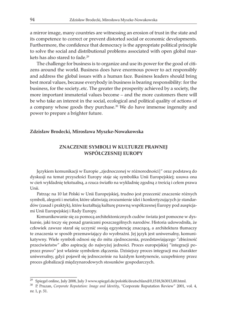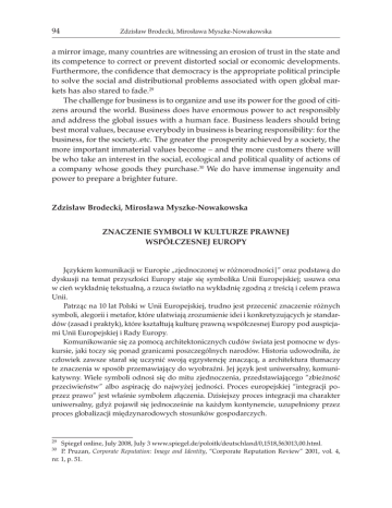 94 Zdzisław Brodecki, Mirosława Myszke-Nowakowska a mirror image, many countries are witnessing an erosion of trust in the state and its competence to correct or prevent distorted social or economic developments. Furthermore, the confidence that democracy is the appropriate political principle to solve the social and distributional problems associated with open global markets has also stared to fade.29 The challenge for business is to organize and use its power for the good of citizens around the world. Business does have enormous power to act responsibly and address the global issues with a human face. Business leaders should bring best moral values, because everybody in business is bearing responsibility: for the business, for the society..etc. The greater the prosperity achieved by a society, the more important immaterial values become – and the more customers there will be who take an interest in the social, ecological and political quality of actions of a company whose goods they purchase.30 We do have immense ingenuity and power to prepare a brighter future. Zdzisław Brodecki, Mirosława Myszke-Nowakowska Znaczenie symboli w kulturze prawnej współczesnej Europy Językiem komunikacji w Europie „zjednoczonej w różnorodności|” oraz podstawą do dyskusji na temat przyszłości Europy staje się symbolika Unii Europejskiej; usuwa ona w cień wykładnię tekstualną, a rzuca światło na wykładnię zgodną z treścią i celem prawa Unii. Patrząc na 10 lat Polski w Unii Europejskiej, trudno jest przecenić znaczenie różnych symboli, alegorii i metafor, które ułatwiają zrozumienie idei i konkretyzujących je standardów (zasad i praktyk), które kształtują kulturę prawną współczesnej Europy pod auspicjami Unii Europejskiej i Rady Europy. Komunikowanie się za pomocą architektonicznych cudów świata jest pomocne w dyskursie, jaki toczy się ponad granicami poszczególnych narodów. Historia udowodniła, że człowiek zawsze starał się uczynić swoją egzystencję znaczącą, a architektura tłumaczy te znaczenia w sposób przemawiający do wyobraźni. Jej język jest uniwersalny, komunikatywny. Wiele symboli odnosi się do mitu zjednoczenia, przedstawiającego “zbieżność przeciwieństw” albo aspirację do najwyżej jedności. Proces europejskiej “integracji poprzez prawo” jest właśnie symbolem złączenia. Dzisiejszy proces integracji ma charakter uniwersalny, gdyż pojawił się jednocześnie na każdym kontynencie, uzupełniony przez proces globalizacji międzynarodowych stosunków gospodarczych. 29 Spiegel online, July 2008, July 3 www.spiegel.de/poloitk/deutschland/0,1518,563013,00.html. P. Pruzan, Corporate Reputation: Image and Identity, “Corporate Reputation Review” 2001, vol. 4, nr. 1, p. 51. 30 The meaning of symbols in the legal culture of modern Europe 95 Jednym z przykładów cudów architektury jest katedra Gaudiego “Sagrada Familia”. Dostrzeżenie symboliki w katedrze pozwala zrozumieć, iż acquis communautaire znaczy nie tyle wiedzę, co „rodzenie się” czegoś nowego według oryginalnych założeń, pozwala dostrzec wartości kulturowe i symboliczny sens oraz kierunek, do którego Unia zmierza. Innym przykładem wspaniałej symboliki architektury jest Luwr. Wybór Luwru na symbol instytucji Unii Europejskiej był podyktowany jego znaczeniem w okresie Wielkiej Rewolucji Francuskiej. Podobnie jak Unia Europejska, pałac ten wzbudzał wiele kontrowersji już podczas budowy, a dziś jest uważany za arcydzieło architektury. Z drugiej strony, w odniesieniu do mitów, już tytuły książek wchodzących w skład tryptyku (Europa sędziów, Europa urzędników, Europa przedsiębiorców) sugerują personifikację całości, ukazującej głównych aktorów europejskiej sceny. Części ogólne książek symbolizuje człowiek, Leonardo da Vinci, z racji kulturowej więzi „człowieka o doskonałych proporcjach z problematyką tryptyku. Prawo materialne symbolizuje w tryptyku mit Prometeusza niosącego ogień. Uwolnienie Prometeusza przez Herkulesa wyraża bowiem skuteczność procesu sublimacyjnego i jego rezultat. W kontekście prawa można mówić o sublimacji „praw i wolności” jednostki i ochrony „dóbr wspólnych”. Natomiast symbolem prawa ustrojowego jest w tryptyku Atlas – człowiek silny, niosący na swych barkach cały glob. Z nim wiąże się status prawny jednostki wyemancypowanej w każdej sferze prawa, status prawny władz (racjonlanego prawodawcy i sprawnego rządu) i status prawny organów wymiaru sprawiedlowości. Relacje między tymi trzema podmiotami tworzy nowy obraz tzw. trójpodziału władz. Jest on wielowymiarowy, bowiem przedstawia relacje w układzie wertykalnym (władze krajowe, władze ponadnarodowe i władze światowe) i w układzie horyzontalnym (gdzie zaczyna występować w postaci zasady równoważenia władz, co uwidacznia się w Unii Europejskiej).