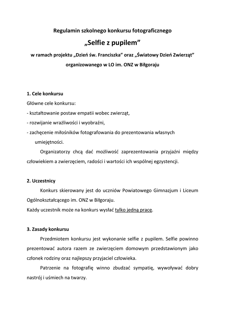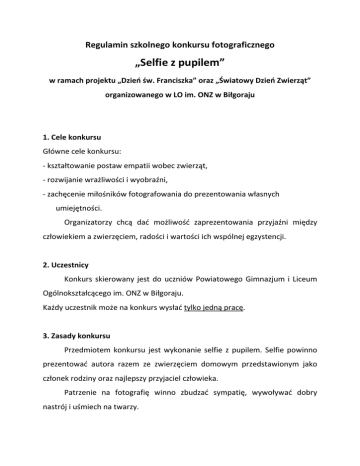 Regulamin szkolnego konkursu fotograficznego „Selfie z pupilem” w ramach projektu „Dzień św. Franciszka” oraz „Światowy Dzień Zwierząt” organizowanego w LO im. ONZ w Biłgoraju 1. Cele konkursu Główne cele konkursu: - kształtowanie postaw empatii wobec zwierząt, - rozwijanie wrażliwości i wyobraźni, - zachęcenie miłośników fotografowania do prezentowania własnych umiejętności. Organizatorzy chcą dać możliwość zaprezentowania przyjaźni między człowiekiem a zwierzęciem, radości i wartości ich wspólnej egzystencji. 2. Uczestnicy Konkurs skierowany jest do uczniów Powiatowego Gimnazjum i Liceum Ogólnokształcącego im. ONZ w Biłgoraju. Każdy uczestnik może na konkurs wysłać tylko jedną pracę. 3. Zasady konkursu Przedmiotem konkursu jest wykonanie selfie z pupilem. Selfie powinno prezentować autora razem ze zwierzęciem domowym przedstawionym jako członek rodziny oraz najlepszy przyjaciel człowieka. Patrzenie na fotografię winno zbudzać sympatię, wywoływać dobry nastrój i uśmiech na twarzy. 4. Zgłaszanie prac Plik z pracą należy przesłać na adres: [email protected] w terminie do 3 października 2016 roku do godziny 23:59. W temacie wpisujemy „konkurs fotograficzny”, a w wiadomości imię i nazwisko, klasę oraz imię pupila. Istnieje możliwość przyniesienia prac na pendriv’ie do pani Anny Dobraczyńskiej (biblioteka szkolna) lub pana Andrzeja Szatowskiego (gabinet 232). Wyniki konkursu zostaną ogłoszone do dnia 7 października 2016 roku na szkolnej stronie internetowej, szkolnym profilu FB oraz w szkolnej telewizji. 5. Zasady oceny prac konkursowych Jury oceniać będzie: - kreatywne podejście do tematu, - walory artystyczne pracy, - sposób zaprezentowania siebie i swojego pupila. 6. Nagrody W konkursie przewidziane są dyplomy i nagrody rzeczowe. 7. Uwagi dodatkowe Prace, które nie będą spełniały warunków regulaminu nie zostaną zakwalifikowane do konkursu. Serdecznie zapraszamy do udziału! Pochwal się swoim pupilem! Zdobądź nagrody!