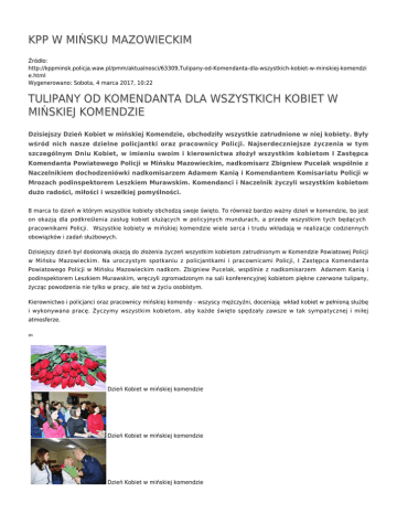 KPP W MIŃSKU MAZOWIECKIM Źródło: http://kppminsk.policja.waw.pl/pmm/aktualnosci/63309,Tulipany-od-Komendanta-dla-wszystkich-kobiet-w-minskiej-komendzi e.html Wygenerowano: Sobota, 4 marca 2017, 10:22 TULIPANY OD KOMENDANTA DLA WSZYSTKICH KOBIET W MIŃSKIEJ KOMENDZIE Dzisiejszy Dzień Kobiet w mińskiej Komendzie, obchodziły wszystkie zatrudnione w niej kobiety. Były wśród nich nasze dzielne policjantki oraz pracownicy Policji. Najserdeczniejsze życzenia w tym szczególnym Dniu Kobiet, w imieniu swoim i kierownictwa złożył wszystkim kobietom I Zastępca Komendanta Powiatowego Policji w Mińsku Mazowieckim, nadkomisarz Zbigniew Pucelak wspólnie z Naczelnikiem dochodzeniówki nadkomisarzem Adamem Kanią i Komendantem Komisariatu Policji w Mrozach podinspektorem Leszkiem Murawskim. Komendanci i Naczelnik życzyli wszystkim kobietom dużo radości, miłości i wszelkiej pomyślności. 8 marca to dzień w którym wszystkie kobiety obchodzą swoje święto. To również bardzo ważny dzień w komendzie, bo jest on okazją dla podkreślenia zasług kobiet służących w policyjnych mundurach, a przede wszystkim tych będących pracownikami Policji. Wszystkie kobiety w mińskiej komendzie wiele serca i trudu wkładają w realizacje codziennych obowiązków i zadań służbowych. Dzisiejszy dzień był doskonałą okazją do złożenia życzeń wszystkim kobietom zatrudnionym w Komendzie Powiatowej Policji w Mińsku Mazowieckim. Na uroczystym spotkaniu z policjantkami i pracownicami Policji, I Zastępca Komendanta Powiatowego Policji w Mińsku Mazowieckim nadkom. Zbigniew Pucelak, wspólnie z nadkomisarzem Adamem Kanią i podinspektorem Leszkiem Murawskim, wręczyli zgromadzonym na sali konferencyjnej kobietom piękne czerwone tulipany, życząc powodzenia nie tylko w pracy, ale też w życiu osobistym. Kierownictwo i policjanci oraz pracownicy mińskiej komendy - wszyscy mężczyźni, doceniają wkład kobiet w pełnioną służbę i wykonywana pracę. Życzymy wszystkim kobietom, aby każde święto spędzały zawsze w tak sympatycznej i miłej atmosferze. dn Dzień Kobiet w mińskiej komendzie Dzień Kobiet w mińskiej komendzie Dzień Kobiet w mińskiej komendzie Ocena: 0/5 (0) Tweetnij