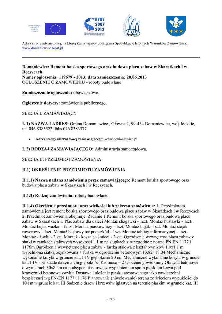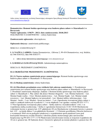 Adres strony internetowej, na której Zamawiający udostępnia Specyfikację Istotnych Warunków Zamówienia: www.domaniewice.bipst.pl Domaniewice: Remont boiska sportowego oraz budowa placu zabaw w Skaratkach i w Reczycach Numer ogłoszenia: 119679 - 2013; data zamieszczenia: 20.06.2013 OGŁOSZENIE O ZAMÓWIENIU - roboty budowlane Zamieszczanie ogłoszenia: obowiązkowe. Ogłoszenie dotyczy: zamówienia publicznego. SEKCJA I: ZAMAWIAJĄCY I. 1) NAZWA I ADRES: Gmina Domaniewice , Główna 2, 99-434 Domaniewice, woj. łódzkie, tel. 046 8383522, faks 046 8383377. Adres strony internetowej zamawiającego: www.domaniewice.pl I. 2) RODZAJ ZAMAWIAJĄCEGO: Administracja samorządowa. SEKCJA II: PRZEDMIOT ZAMÓWIENIA II.1) OKREŚLENIE PRZEDMIOTU ZAMÓWIENIA II.1.1) Nazwa nadana zamówieniu przez zamawiającego: Remont boiska sportowego oraz budowa placu zabaw w Skaratkach i w Reczycach. II.1.2) Rodzaj zamówienia: roboty budowlane. II.1.4) Określenie przedmiotu oraz wielkości lub zakresu zamówienia: 1. Przedmiotem zamówienia jest remont boiska sportowego oraz budowa placu zabaw w Skaratkach i w Reczycach 2. Przedmiot zamówienia obejmuje: Zadanie 1 Remont boiska sportowego oraz budowa placu zabaw w Skaratkach 1. Plac zabaw dla dzieci Montaż ślizgawki - 1szt. Montaż huśtawki - 1szt. Montaż bujak ważka - 12szt. Montaż piaskownicy - 1szt. Montaż bujak- 1szt. Montaż stojak rowerowy - 1szt. Montaż bajkowy tor przeszkód - 1szt. Montaż tablicy informacyjnej - 1szt. Montaż - ławki - 2 szt. Montaż - kosza na śmieci - 2 szt. Ogrodzenia wewnętrzne placu zabaw z siatki w ramkach stalowych wysokości 1.1 m na słupkach z rur zgodne z normą PN EN 1177 i 1176m Ogrodzenia wewnętrzne placu zabaw - furtka stalowa z kształtowników 1.0x1.1 m wypełniona siatką ocynkowaną + furtka w ogrodzeniu betonowym 13.82+18.04 Mechaniczne wykonanie koryta w gruncie kat. I-IV głębokości 20 cm Mechaniczne wykonanie koryta w gruncie kat. I-IV - za każde dalsze 5 cm głębokości Krotność = 2 Ułożenie gowłókniny Obrzeża betonowe o wymiarach 30x8 cm na podsypce piaskowej z wypełnieniem spoin piaskiem Ława pod krawężniki betonowa zwykła Dostawa i ułożenie piasku atestowanego jako nawierzchni bezpiecznej wg PN-EN 1177 i 1176 Plantowanie (niwelowanie) terenu ze ścięciem wypukłości do 10 cm w gruncie kat. III Sadzenie drzew i krzewów iglastych na terenie płaskim w gruncie kat. III - 1/39 - z zaprawą dołów; średnica/głębokość : 0.5 m sadzonki wysokości mini 85cm Uzupełnienie ogrodzenia cegłami klinkierowymi o grubości 1/2 ceg. wraz z dopasowaniem furtki nowoprojektowanej 2. Boisko piłkarskie płyta Roboty pomiarowe przy powierzchniowych robotach ziemnych Orka mechaniczna pługiem przyczepnym przy głębokości orania 18-20 cm kat. gruntu III Mechaniczne profilowanie i zagęszczenie podłoża pod warstwy konstrukcyjne nawierzchni w gruncie kat. I-IV Ręczne rozścielenie mieszanki z torfu, nawozów mineralnych i wapna rolniczego grubości 2 cm w terenie płaskim Wykonanie trawników dywanowych siewem na terenie płaskim przy uprawie mechanicznej na gruncie kat. III bez nawożenia Deszczowanie terenu po wysiewie nawozów Osadzenie tulei do słupków i stojaków obsady tylnej do piłki nożnej Ustawienie w gotowych otworach bramek do piłki nożnej - Bramka do piłki nożnej wym.7, 32x2,44 m aluminiowa/ stalowa profil owalny 120x100 mm, kolor biały PROFESJONALNA, z odciągami, tuleje i siatka Piłkochwyty z siatki polipropylenowej na słupkach stalowych malowanych proszkowo w rozstawie co 3.0m wysokości 6.0m ze stężeniami i linkami wraz z fundamentami 3. Teren przy placu zabaw i boisku Wykonanie trawników parkowych siewem na gruncie kat. III z nawożeniem Kultywatorowanie mechaniczne kat. gruntu III Montaż progów do skoku w dal i trójskoku Montaż skrzyni do skoków w dal wraz z nawierzchnią z piasku Mechaniczne wykonanie koryta na całej szerokości jezdni i chodników w gruncie kat. I-IV głębokości 20 cm Mechanicze zagęszczenie warstwy odsączającej na poszerzeniach - grubość warstwy po zag. 10 cm Nawierzchnie z kostki brukowej betonowej grubość 6 cm na podsypce cementowo-piaskowej Ława pod obrzeża betonowa zwykła Obrzeża betonowe o wymiarach 20x6 cm na podsypce piaskowej z wypełnieniem spoin piaskiem 4. Ogrodzenie terenu szkolnego Ogrodzenie z siatek zgrzewanych wyskości 1.50m w rozstawie słupków 2.50 Rowki pod krawężniki i ławy krawężnikowe o wymiarach 20x20 cm w gruncie kat.III-IV Obrzeża betonowe o wymiarach 20x6 cm na podsypce piaskowej z wypełnieniem spoin piaskiem Ława pod betonowa zwykła Zadanie 2 Remont boiska sportowego oraz budowa placu zabaw w Reczycach 1. Plac zabaw dla dzieci Montaż huśtawki - 1szt. Montaż równoważni wiszący mostek - 1szt. Montaż bujak ważka - 2 szt. Montaż bajkowy tor przeszkód - 1szt. Montaż karuzela - 1szt. Montaż lina do zjeżdżania ze stojakiem - 1szt. Montaż tablicy informacyjnej - 1szt. Montaż - ławki - 2 szt. Montaż - kosza na śmieci - 1 szt. Mechaniczne wykonanie koryta na całej szerokości jezdni i chodników w gruncie kat. I-IV Głębokości 20 cm Mechaniczne wykonanie koryta na całej szerokości jezdni i chodników w gruncie kat. I-IV - za każde dalsze 5 cm głębokości Ułożenie gowłókniny Obrzeża betonowe o wymiarach 30x8 cm na podsypce piaskowej z wypełnieniem spoin piaskiem Ława pod krawężniki betonowa zwykła Dostawa i ułożenie piasku atestowanego jako nawierzchni bezpiecznej wg PN-EN 11777 i 1176 Mechanicze zagęszczenie warstwy odsączającej w korycie lub na całej szer.drogi - za każdy dalszy 1 cm grubość warstwy po zag. Plantowanie (niwelowanie) terenu ze ścięciem wypukłości do 10 cm w gruncie kat. III 2. Boisko piłkarskie płyta Roboty pomiarowe przy powierzchniowych robotach ziemnych Roboty ziemne w zakresie niwelacji istniejącego terenu, rozplantowanie nasypów i hałd ziemi Orka mechaniczna pługiem przyczepnym przy głębokości orania 18-20 c