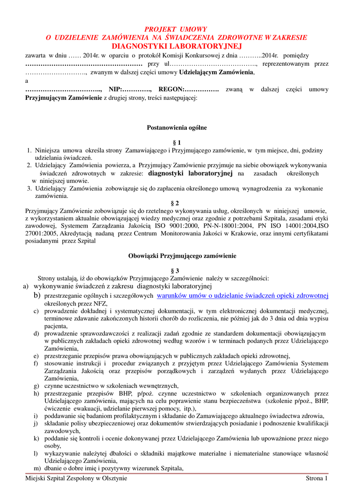 PROJEKT UMOWY O UDZIELENIE ZAMÓWIENIA NA ŚWIADCZENIA ZDROWOTNE W ZAKRESIE DIAGNOSTYKI LABORATORYJNEJ zawarta w dniu …… 2014r. w oparciu o protokół Komisji Konkursowej z dnia ………..2014r. pomiędzy ……………………………………………… przy ul…………………………………., reprezentowanym przez ………………………., zwanym w dalszej części umowy Udzielającym Zamówienia, a …………………………….., NIP:…………., REGON:……………. zwaną w dalszej części umowy Przyjmującym Zamówienie z drugiej strony, treści następującej: Postanowienia ogólne §1 1. Niniejsza umowa określa strony Zamawiającego i Przyjmującego zamówienie, w tym miejsce, dni, godziny udzielania świadczeń. 2. Udzielający Zamówienia powierza, a Przyjmujący Zamówienie przyjmuje na siebie obowiązek wykonywania świadczeń zdrowotnych w zakresie: diagnostyki laboratoryjnej na zasadach określonych w niniejszej umowie. 3. Udzielający Zamówienia zobowiązuje się do zapłacenia określonego umową wynagrodzenia za wykonanie zamówienia. §2 Przyjmujący Zamówienie zobowiązuje się do rzetelnego wykonywania usług, określonych w niniejszej umowie, z wykorzystaniem aktualnie obowiązującej wiedzy medycznej oraz zgodnie z potrzebami Szpitala, zasadami etyki zawodowej, Systemem Zarządzania Jakością ISO 9001:2000, PN-N-18001:2004, PN ISO 14001:2004,ISO 27001:2005, Akredytacją nadaną przez Centrum Monitorowania Jakości w Krakowie, oraz innymi certyfikatami posiadanymi przez Szpital Obowiązki Przyjmującego zamówienie §3 Strony ustalają, iż do obowiązków Przyjmującego Zamówienie należy w szczególności: a) wykonywanie świadczeń z zakresu diagnostyki laboratoryjnej b) przestrzeganie ogólnych i szczegółowych warunków umów o udzielanie świadczeń opieki zdrowotnej określonych przez NFZ, c) prowadzenie dokładnej i systematycznej dokumentacji, w tym elektronicznej dokumentacji medycznej, terminowe zdawanie zakończonych historii chorób do rozliczenia, nie później jak do 3 dnia od dnia wypisu pacjenta, d) prowadzenie sprawozdawczości z realizacji zadań zgodnie ze standardem dokumentacji obowiązującym w publicznych zakładach opieki zdrowotnej według wzorów i w terminach podanych przez Udzielającego Zamówienia, e) przestrzeganie przepisów prawa obowiązujących w publicznych zakładach opieki zdrowotnej, f) stosowanie instrukcji i procedur związanych z przyjętym przez Udzielającego Zamówienia Systemem Zarządzania Jakością oraz przepisów porządkowych i zarządzeń wydanych przez Udzielającego Zamówienia, g) czynne uczestnictwo w szkoleniach wewnętrznych, h) przestrzeganie przepisów BHP, p/poż. czynne uczestnictwo w szkoleniach organizowanych przez Udzielającego zamówienia, mających na celu poprawienie stanu bezpieczeństwa (szkolenie p/poż., BHP, ćwiczenie ewakuacji, udzielanie pierwszej pomocy, itp.), i) poddawanie się badaniom profilaktycznym i składanie do Zamawiającego aktualnego świadectwa zdrowia, j) składanie polisy ubezpieczeniowej oraz dokumentów stwierdzających posiadanie i podnoszenie kwalifikacji zawodowych, k) poddanie się kontroli i ocenie dokonywanej przez Udzielającego Zamówienia lub upoważnione przez niego osoby, l) wykazywanie należytej dbałości o składniki majątkowe materialne i niematerialne stanowiące własność Udzielającego Zamówienia, m) dbanie o dobre imię i pozytywny wizerunek Szpitala, Miejski Szpital Zespolony w Olsztynie Strona 1 n) realizacja misji Szpitala. Zasady świadczenia usług §4 1. Wykonywanie przez Przyjmującego zamówienie świadczeń, odbywa się zgodnie z potrzebami zabezpieczenia prawidłowego funkcjonowania Szpitala, 2. Przyjmujący zamówienie ustala harmonogram świadczeń zdrowotnych z Kierownikiem komórki organizacyjnej w ilości….., zatwierdzonego przez Dyrektora lub osobę upoważnioną, 3. Z wynagrodzenia płaconego przez Szpital wyłącza się godziny dydaktyczne świadczone na rzecz UWM. §5 1. Na czas nieobecności Przyjmujący Zamówienie zobowiązany jest ustanowić zastępstwo w osobie o odpowiednich kwalifikacjach zawodowych, prowadzącego działalność gospodarczą i posiadającego ubezpieczenie od odpowiedzialności cywilnej. Nie dotyczy to sytuacji losowych takich jak choroba, wypadek, śmierć w rodzinie tj. zdarzeń nagłych i krótkotrwałych. 2. Przyjmujący Zamówienie w przypadku, o którym mowa w ust. 1, jest zobowiązany powiadomić Kierownika komórki organizacyjnej o planowanej nieobecności i osobie, która będzie w jego zastępstwie wykonywać niniejszą umowę. Powiadomienie winno nastąpić co najmniej 7 dni przed planowaną nieobecnością. 3. W przypadku braku zgody Kierownika komórki organizacyjnej na osobę zaproponowaną przez Przyjmującego Zamówienie, przedstawi on inną osobę, która spełniać będzie wymogi postawione przez Kierownika komórki organizacyjnej. Odpowiedzialność 1. 2. 3. 4. §6 Przyjmujący Zamówienie za wykonywane czynności określone w niniejszej umowie ponosi odpowiedzialność zawodową, cywilną i karną zgodnie z odpowiednimi przepisami prawa. Udzielający Zamówienia i Przyjmujący Zamówienie ponoszą odpowiedzialność solidarną za wyrządzoną szkodę przy udzielaniu świadczeń zgodnie z art. 27 ust.7 Ustawy o działalności leczniczej. Strony ustalają, iż Przyjmujący Zamówienie obowiązany jest określić kwotę obowiązkowego ubezpieczenia od odpowiedzialności cywilnej na co najmniej ……. euro na wszystkie zdarzenia i ……... euro na jedno zdarzenie. Przyjmujący Zamówienie z tytułu realizacji niniejszej umowy ponosi ryzyko gospodarcze. Przyjmujący Zamówienie samodzielnie rozlicza się z Urzędem Skarbowym i ZUS zgodnie z obowiązującymi przepisami dotyczącymi osób prowadzących działalność gospodarczą. Kontrola udzielanych świadczeń §7 1. Udzielający Zamówienia oraz osoby przez niego upoważnione mają prawo do przeprowa