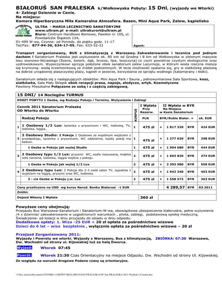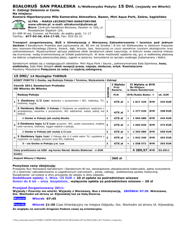 BIAŁORUŚ SAN PRALESKA k/Wołkowyska Pobyty: 15 Dni, (wyjazdy we Wtorki) 4- Zabiegi Dziennie w Cenie. Na miejscu: Komora Hiperbaryczna Miła Kameralna Atmosfera. Basen, Mini Aqua Park, Zalew, kąpielisko ULTRA - MARIA LECZNICTWO SANATORYJNE www.ultram.pl e-mail: [email protected] Biuro: Centrum Handlowo Bemowo, Pawilon nr 105, ul. Powstańców Śląskich 124, 01-499 W-wa, Czynne: od Poniedz. do piątku godz. 11-17 Tel/Fax: 877-94-36, 634-17-05, Fax: 633-52-21 Agent: Transport zorganizowany, BUS z klimatyzacją z Warszawy. Zakwaterowanie i lecznica pod jednym dachem ! Sanatorium Praleska jest usytuowane ok. 80 km od Grodna i 8 km od Wołkowyska w zielonym masywie lasu sosnowo-liściastego (Sosna, świerk, dąb, brzoza, lipa, leszczyna) co czyni powietrze czystym ekologicznie oraz uzdrowiskowym. Wypoczynkowi sprzyja położone obok sanatorium zalew Lazurnoje, w którym woda rzeczna miesza się kryniczną- wodą krzemionkową ze źródeł podziemnych. W lecie możliwość opalania się, gry w siatkówkę plażową na dobrze urządzonej piaszczystej plaży, kąpieli w jeziorze, korzystania ze sprzętu wodnego (katamarany i łódki). Sanatorium składa się z następujących obiektów: Mini Aqua Park i Sauna , pełnowymiarowa Sala Sportowa, kosz, siatkówka, Sala Mały Sklepik obok recepcji prasa, napoje, słodycze, artyk. Kosmetyczne Pawilony Mieszkalne Połączone ze sobą i z częścią zabiegową. 15 DNI/ 14 Noclegów TURNUS KOSZT POBYTU 1 Osoba, wg Rodzaju Pokoju i Terminu, Wyżywienie i Zabiegi Rodzaj Pokoju I Wpłata KORPUS Cennik 2011 Sanatorium Praleska OD Wtorku do Wtorku Przy Rezerw. II Wpłata w BYR Na Miejscu w Kasie Sanatorium PLN BYR/Ruble Białor. = 1 Osobowy 1/2 Lux: łazienka z prysznicem i WC, lodówkę, TV, 1 475 zł + 1 817 320 BYR 424 EUR 2 Osobowy Studio: 2 Pokoje 2 Osobowe ze wspólnym wejściem z 2 przedpokoju, łazienka z prysznicem, WC oddzielnie, każdy pokój ma 1 balkon. 475 zł + 1 277 620 BYR 298 EUR 1 lodówka, loggia, 1 475 zł + 1 904 680 BYR 444 EUR 2 Osobowy typu 1/2 Lux: prysznic WC, szafa rozsuwana, miękka 2 sofa narożna, lodówka, loggia wejście z pokoju. 475 zł + 1 603 820 BYR 374 EUR 2 475 zł + 2 393 980 BYR 558 EUR 2 Osobowy typu Lux: 2 Pokoje dla 2-3 osób salon TV, sypialnia z 2 wyjściem na loggię, prysznic oraz WC, lodówka. 475 zł + 1 942 340 BYR 453 EUR 475 zł + 1 558 572 BYR 363 EUR 4 289,57 BYR 1 Osoba w Pokoju jak wyżej Studio 3 1 Osoba w Pokoju jak wyżej 1/2 Lux 4 ok. EUR 3 - cia Osoba w Pokoju j.w. Lux 2 Ceny przeliczono na USD wg kursu Narod. Banku Białorusi -1 EUR 03.2011 Zniżki: Dojazd Własny I Wpłata 360 zł Powyższe ceny obejmują: Przejazdy Bus Warszawa-Sanatorium i Sanatorium-W-wa, obowiązkowe ubezpieczenie białoruskie, pełne wyżywienie /4 x dziennie/ zakwaterowanie w uzgodnionych warunkach , pilota, zabiegi, podstawową opiekę medyczną. Świadczenia- od kolacji w dniu przyjazdu do obiadu w dniu odjazdu. Dodatkowe opłaty: 1. Wiza -25 EUR + 20 zł opłata za pośrednictwo wizowe Dzieci do 6 lat – wiza bezpłatnie , wyłącznie opłata za pośrednictwo wizowe – 20 zł Przejazd Zorganizowany 2011: Wyjazdy i Powroty we wtorki. Wyjazdy z Warszawy, Bus z klimatyzacją, Dw. Wschodni od strony ul. Kijowskiej tuż za halą Dworca. ZBIÓRKA: 07:30 Warszawa, Wyjazd: Wtorek 07:45 Powrót: Wtorek 21:30 Czas Orientacyjny na miejsce Odjazdu. Dw. Wschodni od strony Ul. Kijowskiej. Ze względu na warunki drogowe Podane czasy są orientacyjne. \\Ultra_maria\ultra maria\CENNIKI i UMOWY\BIALORUS\SAN PRALESKA\OF San PRALESKA 2011 Wydruk z Cenami.doc