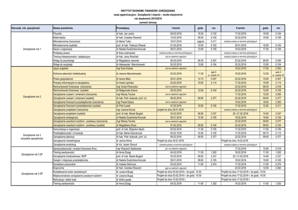 INSTYTUT EKONOMII, FINANSÓW I ZARZĄDZANIA sesja egzaminacyjna - Zarządzanie I stopnia – studia stacjonarne rok akademicki 2015/2016 semestr zimowy Kierunek, rok, specjalność Zarządzanie rok 1 Zarządzanie rok 2 Zarządzanie rok 3 wszystkie specjalności Zarządzanie rok 3 ZF Zarządzanie rok 3 ZP Nazwa przedmiotu Prowadzący Filozofia Matematyka Mikroekonomia (ćwiczenia) Mikroekonomia (wykład) Nauki o organizacji Podstawy prawa Trening interpersonalny i adaptacyjny Wstęp do psychologii Wstęp do socjologii Język angielski dr hab. Jan Jacko dr hab. Czesław Noworol dr Marta Tutko prof. dr hab. Tadeusz Wawak dr Natalia Dudzińska-Korczak dr Ewa Laskowska dr hab. Jerzy Rosiński dr Magdalena Jaworek dr Aleksander Marcinkowski mgr Ewa Kubala Ochrona własności intelektualnej dr Joanna Marcinkowska Prawo gospodarcze Procesy informacyjne w zarządzaniu Rachunkowość finansowa (ćwiczenia) Rachunkowość finansowa (wykład) Zarządzanie czasem i zmianami (ćwiczenia) Zarządzanie czasem i zmianami (wykład) Zarządzanie finansami przedsiębiorstw (ćwiczenia) Zarządzanie finansami przedsiębiorstw (wykład) Zarządzanie projektami (ćwiczenia) Zarządzanie projektami (wykład) Zarządzanie strategiczne Zarządzanie zasobami ludzkimi - podstawy (ćwiczenia) Zarządzanie zasobami ludzkimi - podstawy (wykład) Komunikacja w organizacji Przedsiębiorczość i innowacje Zarządzanie jakością Zarządzanie marketingowe Zarządzanie produkcją Sprawozdawczość i analiza finansowa firmy Trening asertywności Zarządzanie środowiskowe i BHP Związki i integracje przedsiębiorstw Doradztwo personalne Ergonomia Kształtowanie karier zawodowych Międzynarodowe zarządzanie zasobami ludzkimi Rekrutacja i dobór kadr Trening asertywności dr Iwona Mika dr Aneta Lipińska mgr Aneta Pastuszka dr Małgorzata Kutera mgr Maciej Teczke dr hab. Piotr Jedynak, prof. UJ mgr Paweł Dykas dr Piotr Łasak mgr Joanna Kozub prof. dr hab. Marek Bugdol dr Natalia Dudzińska-Korczak mgr Maciej Teczke dr Magdalena Stuss prof. dr hab. Zbigniew Nęcki dr hab. Marta Gancarczyk dr hab. Piotr Jedynak, prof. UJ dr Janina Klima dr inż. Jacek Obrzud mgr Wojciech Sadkowski dr Anna Dyląg prof. dr hab. Marek Bugdol dr Natalia Dudzińska-Korczak dr Izabela Stańczyk dr hab. Czesław Noworol dr Justyna Bugaj dr Justyna Bugaj dr Zofia Łącała dr Anna Dyląg I termin godz. sala II termin godz. sala 08.02.2016 10.02.2016 19.01.2016 01.02.2016 29.01.2016 15:30 09:45 zajęcia 12:00 12:00 0.102 0.102 0.311 0.102 0.105 17.02.2016 22.02.2016 15:00 10:00 0.104 0.105 15:00 17:30 0.104 0.105 23.02.2016 23.02.2016 18.02.2016 09:00 13:00 17:00 0.305 0.104 2.363 18.02.2016 12:30 sala 5 ul. Józefa 19 22.02.2016 17.02.2016 22.02.2016 22.02.2016 17.02.2016 22.02.2016 19.02.2016 17.02.2016 10:00 10:00 08:30 12:00 12:00 09:00 18:00 12:00 0.307 2.114 2.316 0.105 2.365 2.377 2.363 0.311 14:00 16:00 09:00 08:00 11:30 09:15 09:00 2.337 0.105 2.377 0.104 0.105 2.113 2.377 17.02.2016 10:00 18.02.2016 11:30 20 i 21.02.2016 14:00 19.02.2016 19:00 17.02.2016 11:00 22.02.2016 12:00 Projekt do dnia 17.02.2016 r. do godz. 10:30 Projekt do dnia 17.02.2016 r. do godz. 10:30 Projekt do dnia 17.02.2016 r. 18.02.2016 11:00 2.316 1.202 2.337 0.105 2.374 2.364 zostanie podany w terminie późniejszym zostanie podany w terminie późniejszym 09:30 13:00 0.307 0.104 03.02.2016 11:30 sala 5 ul. Józefa 19 29.01.2016 03.02.2016 12:15 10:00 0.307 2.114 12:00 0.104 09:00 2.377 15:00 0.105 08:00 10:30 2.337 0.105 08:00 11:30 14:45 09:00 0.104 0.105 0.102 2.377 zal.na ostatnich zajęciach zal.na ostatnich zajęciach 08.02.2016 zal.na ostatnich zajęciach 08.02.2016 zal.na ostatnich zajęciach 01.02.2016 projekt do dnia 29.01.2016 03.02.2016 29.01.2016 zostanie podany w terminie późniejszym zal.na ostatnich zajęciach 01.02.2016 03.02.2016 02.02.1016 08.02.2016 Projekt do dnia 29.01.2016 zostanie podany w terminie późniejszym 20 i 21.02.2016 19.02.2016 22.02.2016 22.02.2016 17.02.2016 17.02.2016 22.02.2016 Projekt do dnia 19.02.2016 zostanie podany w terminie późniejszym zal. na ostatnich zajęciach 04.02.2016 03.02.2016 29.01.2016 03.02.2016 20.01.2016 19.02.2016 zostanie podany w terminie późniejszym zal.na ostatnich zajęciach 05.02.2016 02.02.2016 zostanie podany w terminie późniejszym 11:30 08:00 09:00 11:00 1.202 2.337 0.105 2.374 Projekt do dnia 03.02.2016 r. do godz. 10:30 Projekt do dnia 03.02.2016 r. do godz. 10:30 Projekt do dnia 10.02.2016 r. 04.02.2016 11:00 1.202 egz.na ostatnich zajęciach 1.202