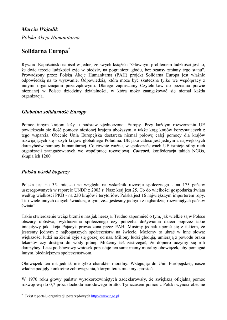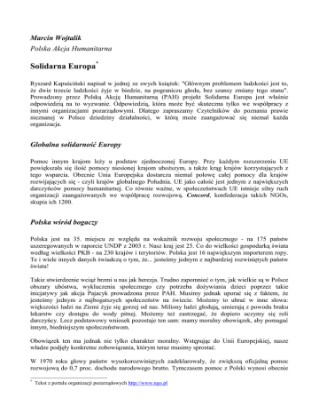 Marcin Wojtalik Polska Akcja Humanitarna Solidarna Europa* Ryszard Kapu ci ski napisał w jednej ze swych ksi ek: "Głównym problemem ludzko ci jest to, e dwie trzecie ludzko ci yje w biedzie, na pograniczu głodu, bez szansy zmiany tego stanu". Prowadzony przez Polsk Akcj Humanitarn (PAH) projekt Solidarna Europa jest wła nie odpowiedzi na to wyzwanie. Odpowiedzi , która mo e by skuteczna tylko we współpracy z innymi organizacjami pozarz dowymi. Dlatego zapraszamy Czytelników do poznania prawie nieznanej w Polsce dziedziny działalno ci, w któr mo e zaanga owa si niemal ka da organizacja. Globalna solidarno Europy Pomoc innym krajom le y u podstaw zjednoczonej Europy. Przy ka dym rozszerzeniu UE powi kszała si ilo pomocy niesionej krajom ubo szym, a tak e kr g krajów korzystaj cych z tego wsparcia. Obecnie Unia Europejska dostarcza niemal połow całej pomocy dla krajów rozwijaj cych si - czyli krajów globalnego Południa. UE jako cało jest jednym z najwi kszych darczy ców pomocy humanitarnej. Co równie wa ne, w społecze stwach UE istnieje silny ruch organizacji zaanga owanych we współprac rozwojow . Concord, konfederacja takich NGOs, skupia ich 1200. Polska w ród bogaczy Polska jest na 35. miejscu ze wzgl du na wska nik rozwoju społecznego - na 175 pa stw uszeregowanych w raporcie UNDP z 2003 r. Nasz kraj jest 25. Co do wielko ci gospodark wiata według wielko ci PKB - na 230 krajów i terytoriów. Polska jest 16 najwi kszym importerem ropy. Te i wiele innych danych wiadcz o tym, e... jeste my jednym z najbardziej rozwini tych pa stw wiata! Takie stwierdzenie wci brzmi u nas jak herezja. Trudno zapomnie o tym, jak wielkie s w Polsce obszary ubóstwa, wykluczenia społecznego czy potrzeba do ywiania dzieci poprzez takie inicjatywy jak akcja Pajacyk prowadzona przez PAH. Musimy jednak upora si z faktem, e jeste my jednym z najbogatszych społecze stw na wiecie. Mo emy to ubra w inne słowa: wi kszo ci ludzi na Ziemi yje si gorzej od nas. Miliony ludzi głoduj , umieraj z powodu braku lekarstw czy dost pu do wody pitnej. Mo emy te zastrzega , e dopiero uczymy si roli darczy cy. Lecz podstawowy wniosek pozostaje ten sam: mamy moralny obowi zek, aby pomaga innym, biedniejszym społecze stwom. Obowi zek ten ma jednak nie tylko charakter moralny. Wst puj c do Unii Europejskiej, nasze władze podj ły konkretne zobowi zania, którym teraz musimy sprosta . W 1970 roku głowy pa stw wysokorozwini tych zadeklarowały, e zwi ksz oficjaln pomoc rozwojow do 0,7 proc. dochodu narodowego brutto. Tymczasem pomoc z Polski wynosi obecnie * Tekst z portalu organizacji pozarz dowych http://www.ngo.pl niewiele ponad 0,02 proc. Jak przypomniał ostatnio Poul Nielsen, ust puj cy unijny komisarz ds. rozwoju i pomocy humanitarnej, "Byłoby nierozs dne, aby oczekiwa , e nowe kraje członkowskie osi gn 0,39 proc. w 2006 roku. (...) Lecz nie jest to jedynie sprawa priorytetów geograficznych pomocy rozwojowej UE czy kwot w euro. To równie kwestia woli politycznej, aby bra pod uwag interesy krajów rozwijaj cych si , gdy rozmawiamy o sprawach Wspólnoty". Jest jeszcze inne ródło naszych zobowi za . Otó przyznaj c si do kultury Zachodu, przył czamy si do zobowi za do zado uczynienia krzywdom, które - poprzez kolonializm - Zachód wyrz dził krajom rozwijaj cym si . Nie zwalnia nas z tego obowi zku fakt, e Polska kolonii nie miała. Przykład innych krajów zachodnich pokazuje, e historia nie jest tu wytłumaczeniem. Pa stwa takie jak Finlandia czy Irlandia, niegdy co najmniej równie biedne jak Polska, teraz s powa nie zaanga owane we współprac z krajami rozwijaj cymi. Tym bardziej, e zdaj sobie spraw z tego, e wiele obecnie obowi zuj cych reguł w stosunkach Północ-Południe, szczególnie dotycz cych handlu, wci ma niekorzystny wpływ na kraje słabsze, nie mog ce pozwoli sobie na armie negocjatorów podczas spotka , na których reguły te s ustalane, np. na spotkaniach ministerialnych wiatowej Organizacji Handlu (WTO). Współzale no a nie egzotyka Cz trudno ci, jakie mamy z zauwa eniem globalnego Południa - czyli wi kszo ci wiata wynika z tego, e cz sto traktujemy zainteresowanie innymi kulturami, społecze stwami jako ciekawostk , egzotyk lub niegro ne hobby. Tymczasem nasze zwi zki z krajami rozwijaj cymi si s du e, ró norodne i dotycz ka dego z nas. Nie chodzi nawet o to, e bez kontaktów z Południem nie mieliby my wielu produktów pochodz cych głównie z tych krajów: czekolady, kawy czy bananów. Zwi zki te s gł bsze i dotykaj prawdopodobnie wi kszo dziedzin naszego ycia nawet je li zazwyczaj tego nie dostrzegamy. Pierwszy przykład: nasze zaanga owanie w obron ludzi prze ladowanych, marginalizowanych i poni anych w krajach rozwijaj cych si mogłoby przyczyni si do rozwi zania problemów... w Europie. Zaczynamy je skutecznie rozwi zywa , gdy zdajemy sobie spraw z tego, e problemy takie jak wiatowy terroryzm czy zamykanie granic przed uchod cami, (którym przecie przysługuje mi dzynarodowa ochrona!) to wyzwania, które maj swoje ródło równie w działaniach lub zaniechaniach krajów wysoko rozwini tych. Je li nasze poparcie dla praw człowieka ograniczałoby si do uroczystych deklaracji, nikogo nie mo e dziwi , e za skutki ogromnych pogwałce godno ci ludzkiej płacimy równie my, w krajach rozwini tych. Oczywi cie najbardziej pokrzywdzonymi b d zawsze ci, których bezpo rednio dotyka skrajne ubóstwo, brak dost pu do edukacji - cho by na poziomie podstawowym - czy skutki u ycia broni wyprodukowanej w krajach wysoko rozwini tych i sprzedanej - bez skrupułów - do krajów, których władze znane s z łamania podstawowych praw człowieka. Niemniej jednak równie i my wiele tracimy na krótkowzrocznej polityce, gdy nie my limy o wpływie naszych działa na ludzi w krajach Południa. Dlatego tak wiele organizacji z krajów UE nawołuje m.in. do: wsparcia edukacji podstawowej w Trzecim wiecie, umorzenia długów tym krajom, wyra nego wkładu w zwalczanie AIDS czy do poparcia d