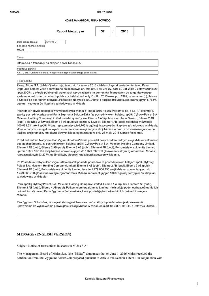 MIDAS RB 37 2016 KOMISJA NADZORU FINANSOWEGO Raport bieżący nr Data sporządzenia: 37 / 2016 2016-06-01 Skróc ona nazwa emitenta MIDAS Temat Informacja o transakcji na akcjach spółki Midas S.A. Podstawa prawna Art. 70 pkt 1 Ustawy o oferc ie - nabyc ie lub zbycie znac znego pakietu akcji Treść raportu: Zarząd Midas S.A. („Midas”) informuje, że w dniu 1 czerwca 2016 r. Midas otrzymał zawiadomienie od Pana Zygmunta Solorza-Żaka sporządzone na podstawie art. 69a ust. 1 pkt 3 w zw. z art. 69 ust. 2 pkt 2 ustawy z dnia 29 lipca 2005 r. o ofercie publicznej i warunkach wprowadzania instrumentów finansowych do zorganizowanego systemu obrotu oraz o spółkach publicznych (tekst jednolity: Dz. U. z 2013 roku, poz. 1382, ze zmianami) („Ustawa o Ofercie”) o pośrednim nabyciu („Pośrednie Nabycie”) 100.069.611 akcji spółki Midas, reprezentujących 6,763% ogólnej liczby głosów i kapitału zakładowego w Midasie. Pośrednie Nabycie nastąpiło w wyniku nabycia w dniu 31 maja 2016 r. przez Polkomtel sp. z o.o. („Polkomtel”), spółkę pośrednio zależną od Pana Zygmunta Solorza-Żaka (za pośrednictwem kolejno: spółki Cyfrowy Polsat S.A., Metelem Holding Company Limited z siedzibą na Cyprze, Eileme 1 AB (publ) z siedzibą w Szwecji, Eileme 2 AB (publ) z siedzibą w Szwecji, Eileme 3 AB (publ) z siedzibą w Szwecji, Eileme 4 AB (publ) z siedzibą w Szwecji), 100.069.611 akcji spółki Midas, reprezentujących 6,763% ogólnej liczby głosów i kapitału zakładowego w Midasie, które to nabycie nastąpiło w wyniku rozliczenia transakcji nabycia akcji Midasa w drodze przymusowego wykupu akcji od akcjonariuszy mniejszościowych Midas ogłoszonego w dniu 25 maja 2016 r. przez Polkomtel. Przed Pośrednim Nabyciem Pan Zygmunt Solorz-Żak nie posiadał bezpośrednio żadnych akcji Midasa, natomiast posiadał pośrednio, za pośrednictwem kolejno: spółki Cyfrowy Polsat S.A., Metelem Holding Company Limited, Eileme 1 AB (publ), Eileme 2 AB (publ), Eileme 3 AB (publ), Eileme 4 AB (publ), Polkomtela oraz Litenite Limited łącznie 1.379.597.139 akcji Midasa uprawniających do 1.379.597.139 głosów na walnym zgromadzeniu Midasa, reprezentujących 93,237% ogólnej liczby głosów i kapitału zakładowego w Midasie. Po Pośrednim Nabyciu Pan Zygmunt Solorz-Żak posiada pośrednio za pośrednictwem kolejno: spółki Cyfrowy Polsat S.A., Metelem Holding Company Limited, Eileme 1 AB (publ), Eileme 2 AB (publ), Eileme 3 AB (publ), Eileme 4 AB (publ), Polkomtela oraz Litenite Limited łącznie 1.479.666.750 akcji Midasa, uprawniających do 1.479.666.750 głosów na walnym zgromadzeniu Midasa, reprezentujących 100% ogólnej liczby głosów i kapitału zakładowego w Midasie. Poza spółką Cyfrowy Polsat S.A., Metelem Holding Company Limited, Eileme 1 AB (publ), Eileme 2 AB (publ), Eileme 3 AB (publ), Eileme 4 AB (publ), Polkomtelem oraz Litenite Limited, nie istnieją podmioty bezpośrednio lub pośrednio zależne od Pana Zygmunta Solorza-Żaka, które posiadają bezpośrednio lub pośrednio akcje w Midasie. Pan Zygmunt Solorz-Żak, że nie jest stroną jakichkolwiek umów, których przedmiotem jest przekazanie uprawnienia do wykonywania prawa głosu z akcji Midasa w rozumieniu art. 87 ust. 1 pkt 3 lit. c Ustawy o Ofercie. MESSAGE (ENGLISH VERSION) Subject: Notice of transactions in shares in Midas S.A. The Management Board of Midas S.A. (the “Midas”) announces that on June 1, 2016 Midas received the notification from Mr. Zygmunt Solorz-Żak prepared pursuant to Article 69a Section 1 Item 3 in conjunction with Article 69 Section 2 Item 2 of the Act on Public Offering, Conditions Governing the Introduction of Financial Komisja Nadzoru Finansowego 1 MIDAS RB 37 2016 Article 69 Section 2 Item 2 of the Act on Public Offering, Conditions Governing the Introduction of Financial Instruments to Organized Trading, and Public Companies of July 29, 2005 (consolidated text: Dz. U. of 2013, item 1382, as amended) (the “Public Offering Act”) of indirect acquisition (“Indirect Acquisition”) 100,069,611 shares in Midas, accounting for 6.763% of the total number of votes and of the share capital of Midas. The Indirect Acquisition occurred as a result of the acquisition by Polkomtel sp. z o.o. on May 31, 2016 (“Polkomtel”), an indirect subsidiary of Mr. Zygmunt Solorz-Żak (via, successively: Cyfrowy Polsat S.A., Metelem Holding Company Limited with its registered office in Cyprus, Eileme 1 AB (publ) with its registered office in Sweden, Eileme 2 AB (publ) with its registered office in Sweden, Eileme 3 AB (publ) with its registered office in Sweden, Eileme 4 AB (publ) with its registered office in Sweden), of 100,069,611 Midas shares, representing 6.763% of the total number of votes and the share capital of Midas, which acquisition occurred as a result of settling the acquisition of Midas shares in a squeeze-out announced by Polkomtel on May 25, 2016. Prior to the Indirect Acquisition, Mr. Zygmunt Solorz-Żak had not directly held any Midas shares, but had indirectly held through successively: Cyfrowy Polsat S.A., Metelem Holding Company Limited, Eileme 1 AB (publ), Eileme 2 AB (publ), Eileme 3 AB (publ), Eileme 4 AB (publ), Polkomtel and Litenite Limited, jointly 1,379,597,139 shares in Midas, which carry the right to 1,379,597,139 votes at the general meeting of Midas and represent 93.237% of the total number of votes and the share capital of Midas. After the Indirect Acquisition, Mr. Zygmunt Solorz-Żak indirectly holds, via, successively: Cyfrowy Polsat S.A., Metelem Holding Company Limited, Eileme 1 AB (publ), Eileme 2 AB (publ), Eileme 3 AB (publ), Eileme 4 AB (publ), Polkomtel and Litenite Limited, jointly 1,479,666,750 shares in Midas, which carry the right to 1,479,666,750 votes at the general meeting of Midas and represent 100% of the total number of votes and the share capital of Midas. Other than Cyfrowy Polsat S.A., Metelem Holding Company Limited, Eileme 1 AB (publ)