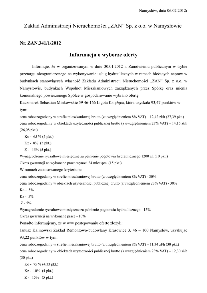 Namysłów, dnia 06.02.2012r Zakład Administracji Nieruchomości „ZAN” Sp. z o.o. w Namysłowie Nr. ZAN.341/1/2012 Informacja o wyborze oferty Informuje, że w organizowanym w dniu 30.01.2012 r. Zamówieniu publicznym w trybie przetargu nieograniczonego na wykonywanie usług hydraulicznych w ramach bieżących napraw w budynkach stanowiących własność Zakładu Administracji Nieruchomości „ZAN” Sp. z o.o. w Namysłowie, budynkach Wspólnot Mieszkaniowych zarządzanych przez Spółkę oraz mienia komunalnego powierzonego Spółce w gospodarowanie wybrano ofertę: Kaczmarek Sebastian Minkowskie 59 46-166 Ligota Książęca, która uzyskała 93,47 punktów w tym: cena roboczogodziny w strefie mieszkaniowej brutto (z uwzględnieniem 8% VAT) – 12,42 zł/h (27,39 pkt.) cena roboczogodziny w obiektach użyteczności publicznej brutto (z uwzględnieniem 23% VAT) – 14,15 zł/h (26,08 pkt.) Ko - 65 % (5 pkt.) Kz - 8% (5 pkt.) Z - 15% (5 pkt.) Wynagrodzenie ryczałtowe miesięczne za pełnienie pogotowia hydraulicznego 1200 zł. (10 pkt.) Okres gwarancji na wykonane prace wynosi 24 miesiące. (15 pkt.) W ramach zastosowanego kryterium: cena roboczogodziny w strefie mieszkaniowej brutto (z uwzględnieniem 8% VAT) - 30% cena roboczogodziny w obiektach użyteczności publicznej brutto (z uwzględnieniem 23% VAT) - 30% Ko - 5% Kz - 5% Z - 5% Wynagrodzenie ryczałtowe miesięczne za pełnienie pogotowia hydraulicznego - 15% Okres gwarancji na wykonane prace - 10% Ponadto informujemy, że w w/w postępowaniu ofertę złożyli: Janusz Kalinowski Zakład Remontowo-budowlany Krasowice 3, 46 – 100 Namysłów, uzyskując 93,22 punktów w tym: cena roboczogodziny w strefie mieszkaniowej brutto (z uwzględnieniem 8% VAT) – 11,34 zł/h (30 pkt.) cena roboczogodziny w obiektach użyteczności publicznej brutto (z uwzględnieniem 23% VAT) – 12,30 zł/h (30 pkt.) Ko - 75 % (4,33 pkt.) Kz - 10% (4 pkt.) Z - 15% (5 pkt.) Wynagrodzenie ryczałtowe miesięczne za pełnienie pogotowia hydraulicznego 1280 zł. (5,83 pkt.) Okres gwarancji na wykonane prace wynosi 14 miesiące. (14,06 pkt.) W ramach zastosowanego kryterium: cena roboczogodziny w strefie mieszkaniowej brutto (z uwzględnieniem 8% VAT) - 30% cena roboczogodziny w obiektach użyteczności publicznej brutto (z uwzględnieniem 23% VAT) - 30% Ko - 5% Kz - 5% Z – 5% Wynagrodzenie ryczałtowe miesięczne za pełnienie pogotowia hydraulicznego - 15% Okres gwarancji na wykonane prace - 10% Jednocześnie informuje, że oferta Pana Grzegorz Maras Zakład Remontowo - Budowlany Strzelce 43 46-134 Domaszowice, została odrzucona na podstawie art. 89 ust. 1 pkt. 2 ustawy Prawo Zamówień Publicznych tj. Treść oferty nie odpowiada Specyfikacji Istotnych Warunków Zamówienia. Wykonawca nie podał stawki roboczogodziny z uwzględnieniem strefy mieszkaniowej oraz obiektów użyteczności publicznej. ul. Stanisława Dubois 5, 46-100 Namysłów, tel. 77 410-72-65, fax 77 410-72-70 http://www.zan-namyslow.pl e-mail: [email protected]