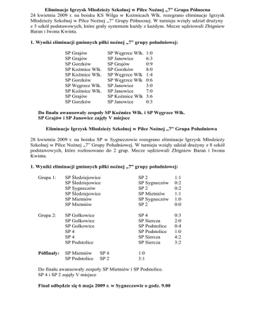 Eliminacje Igrzysk Młodzieży Szkolnej w Piłce Nożnej „7” Grupa Północna 24 kwietnia 2009 r. na boisku KS Wilga w Koźmicach Wlk. rozegrano eliminacje Igrzysk Młodzieży Szkolnej w Piłce Nożnej „7” Grupy Północnej. W turnieju wzięły udział drużyny z 5 szkół podstawowych, które grały systemem każdy z każdym. Mecze sędziowali Zbigniew Baran i Iwona Kwinta. 1. Wyniki eliminacji gminnych piłki nożnej „7” grupy południowej: SP Grajów SP Grajów SP Gorzków SP Koźmice Wlk. SP Koźmice Wlk. SP Gorzków SP Węgrzce Wlk. SP Koźmice Wlk. SP Grajów SP Gorzków SP Węgrzce Wlk. SP Janowice SP Grajów SP Gorzków SP Węgrzce Wlk SP Węgrzce Wlk SP Janowice SP Janowice SP Koźmice Wlk SP Janowice 1:0 6:3 0:9 8:0 1:4 0:6 3:0 7:0 3:6 0:3 Do finału awansowały zespoły SP Koźmice Wlk. i SP Węgrzce Wlk. SP Grajów i SP Janowice zajęły V miejsce Eliminacje Igrzysk Młodzieży Szkolnej w Piłce Nożnej „7” Grupa Południowa 28 kwietnia 2009 r. na boisku SP w Sygneczowie rozegrano eliminacje Igrzysk Młodzieży Szkolnej w Piłce Nożnej „7” Grupy Południowej. W turnieju wzięły udział drużyny z 8 szkół podstawowych, które rozlosowano do 2 grup. Mecze sędziowali Zbigniew Baran i Iwona Kwinta. 1. Wyniki eliminacji gminnych piłki nożnej „7” grupy południowej: Grupa 1: SP Śledziejowice SP Śledziejowice SP Sygneczów SP Śledziejowice SP Mietniów SP Mietniów SP 2 SP Sygneczów SP 2 SP Mietniów SP Sygneczów SP 2 1:1 0:2 0:2 1:1 1:0 0:0 Grupa 2: SP Golkowice SP Golkowice SP Golkowice SP 4 SP 4 SP Podstolice SP 4 SP Siercza SP Podstolice SP Podstolice SP Siercza SP Siercza 0:3 2:0 0:4 1:0 4:2 3:2 Półfinały: SP Mietniów SP Podstolice SP 4 SP 2 1:0 3:1 Do finału awansowały zespoły SP Mietniów i SP Podstolice. SP 4 i SP 2 zajęły V miejsce Finał odbędzie się 6 maja 2009 r. w Sygneczowie o godz. 9.00