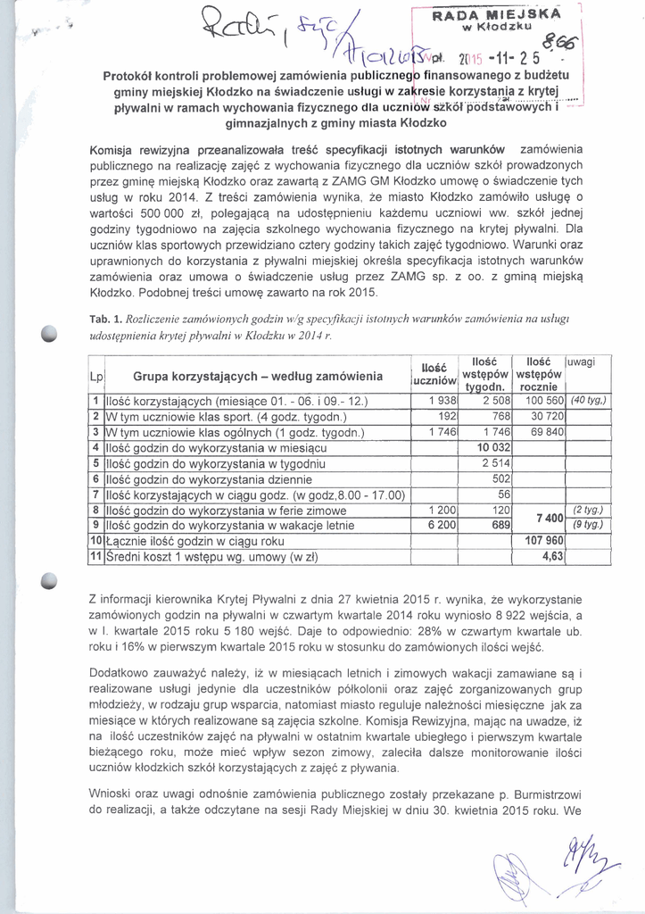 Q& , R ~ D A MIEJSKA w KtodskU . 2i -11- 2 5 8~ - nansowanego z budzetu Protokol kontroli problemowej zamowienia p ie korzystania z krytej grniny miejskiej Klodzko na swiadczenie u /a .. . .. . .... zkoi'podstawowych i plywalni w ramach wychowania fizyczneg gimnazjalnych z gminy miasta Klodzko ..a. ' Komisja rewizyjna przeanalizowala tresc specyfikacji istotnych warunkow zamowienia publicznego na realizacje zajec z wychowania fizycznego dla uczniow szkol prowadzonych przez gmine miejskq Klodzko oraz zawartq z ZAMG GM Klodzko umowq o swiadczenie tych uslug w roku 2014. Z tresci zamowienia wynika, ze miasto Klodzko zamowilo usluge o wartosci 500 000 zl, polegajqcq na udostqpnieniu kazdemu uczniowi ww. szkol jednej godziny tygodniowo na zajecia szkolnego wychowania fizycznego na krytej plywalni. Dla uczniow klas sportowych przewidziano cztery godziny takich zajqc tygodniowo. Warunki oraz uprawnionych do korzystania z plywalni miejskiej okresla specyfikacja istotnych warunkow zamowienia oraz umowa o swiadczenie uslug przez ZAMG sp. z oo. z gminq miejskq Klodzko. Podobnej tresci umowq zawarto na rok 2015. Tab. 1. Rozliczenie zumdwionych godzin w/g specyJikncji istotr~ychwarunkdw zntndwienia na uslug1 udostcpnieniu krytej pIywalni w Ki'odzku w 2013 r. LP Grupa korzystajqcych - wedlug zamowienia 1 Ilosc korzystajqcych (miesiqce 01. - 06. i 09.- 12.) 2 W tym uczniowie klas sport. (4 godz. tygodn.) 3 W tym uczniowie klas ogolnych (1 godz. tygodn.) 4 llosc godzin do wykorzystania w miesiqcu 5 llosc godzin do wykorzystania w tygodniu 6 llosc godzin do wykorzystania dziennie 7 llosc korzystajqcych w ciqgu godz. (w godz,8.00 - 17.00) 8 llosc godzin do wykorzystania w ferie zimowe 9 Ilosc godzin do wykorzystania w wakacje letnie 10 tqcznie ilosc godzin w ciqgu roku 11 ~ r e d nkoszt i 1 wstqpu wg. umowy (w zl) llosc llosc uwagi llosc uczni6w wstgpow wstgpow tygodn. rocznie 1 938 192 1 746 1 200 6 200 2 508 768 1 746 10 032 2 514 502 56 120 689 100 560 (40 tyg,) 30 720 69 840 400 (2 tyg.) (9 tyg.) 107 960 4,63 Z informacji kierownika Krytej Plywalni z dnia 27 kwietnia 2015 r. wynika, ze wykorzystanie zamowionych godzin na plywalni w czwartym kwartale 2014 roku wynioslo 8 922 wejscia, a w I. kwartale 2015 roku 5 180 wejsc. Daje to odpowiednio: 28% w czwartym kwartale ub. roku i 16% w pierwszym kwartale 2015 roku w stosunku do zamowionych ilosci wejsc. Dodatkowo zauwazyc nalezy, iz w miesiqcach letnich i zimowych wakacji zamawiane sq i realizowane uslugi jedynie dla uczestnikow polkolonii oraz zajqc zorganizowanych grup mlodziezy, w rodzaju grup wsparcia, natomiast miasto reguluje naleznosci miesiqczne jak za miesiqce w ktorych realizowane sq zajecia szkolne. Komisja Rewizyjna, majqc na uwadze, iz na ilosc uczestnikow zajqc na plywalni w ostatnim kwartale ubieglego i pierwszym kwartale biezqcego roku, moze miec wplyw sezon zimowy, zalecila dalsze monitorowanie ilosci uczniow klodzkich szkol korzystajqcych z zajqc z plywania. Wnioski oraz uwagi odnosnie zamowienia publicznego zostaty przekazane p. Burmistrzowi do realizacji, a takze odczytane na sesji Rady Miejskiej w dniu 30. kwietnia 2015 roku. We wnioskach Komisja Rewizyjna zalecila m.in. rozwazenie przedluzenia godzin otwarcia plywalni o godziny poranne, przeprowadzenie ankiety w celu rozeznania preferencji klientow plywalni dla optymalnego rozplanowania i wykorzystania tego obiektu dla celow dydaktycznych w czasie, kiedy nie korzystajq z niego klienci komercyjni, w szczegolnosci w godzinach od 8,00 do 17.00. W m-cu listopadzie Komisja uzyskala rozliczenie wykorzystania zamowionych godzin na plywalni, ktore wahajq siq od maksymalnych tj. 2 316 wejsc w miesiqcu kwietniu b.r. do 2900 w miesiqcu pazdzierniku b.r do najmniej licznych w czerwcu 2015 r (ok. 1400 wejsc). Komisja porownala zamowione ilosci wedlug specyfikacji istotnych warunkow zamowienia publicznego z 2014 roku do faktycznie wykorzystanych przez szkoly wstqpow (dane na podstawie informacji Kierownika krytej plywalni) w okresie od pazdziernika 2014 do pazdziernika roku 2015. Faktycznie wykorzystana w stosunku do zamowionej przez miasto Klodzko ilosC godzin wyniosla co najwyzej 27 % (przy najwyzszej frekwencji 2 900 osob miesiqcznie). Cena za jednorazowy wstqp wyniosla (wg. zamowienia) 4,63 zl. Z dalszych ustalen wynika, i t frekwencja podczas zajqc na plywalni zalety od odlegloSci szkdy od obiektu (koniecznoSC dowozu uczniow Zespolu Szkbl lntegracyjnych i Miejskiego Zespolu Szkbl na plywalniq), tradycji, zasobow kadrowych oraz rozkladu zajqc szkdy, ktbrego niejednokrotnie nie moina dostosowaC do harmonogramu zajqc na plywalni. ZauwatyC naleiy i t program szkolnego wychowania fizycznego uwzglqdniac musi obowiqzek realizacji przez nauczycieli podstawy programowej z tego przedmiotu, ktbra obejmuje zajqcia nie tylko na plywalni, ale wymaga szerokiego stosowania wszechstronnych z a j ~ cruchowych. Wykorzystanie zambwionych ilosci wstqpow przez szkoiy wykazuje znaczne wahania w cyklu rocznym, w zmniejszajqc siq w szczegolnosci w miesiqcach wiosenno-letnich (czerwiec, wrzesien), a takie w okresie zimowym (styczen, luty). Z rozliczenia zamowionych wstqpow (zgodnie z umowq na realizacjq zamowienia publicznego) wynika, iz rygorystyczna realizacja zapisow umowy wymagalaby udostqpnienia plywalni dla 56 osob na godzinq w czasie miqdzy 8.00 a 17.00. W tym stanie rzeczy niemozliwe wrqcz, lub bardzo utrudnione byloby korzystanie z obiektu przez mieszkancow Klodzka, w tym osoby niepelnosprawne, a zatem Spolka nie mialaby mozliwosci uzyskania przychodow z dzialalnosci komercyjnej. Komisja, po analizie przedstawionych danych oraz dyskusji, z udzialem zastqpcy Burmistrza Miasta Klodzka sformulowala koncowe wnioski: I.Komisja podtrzymuje wniosek z 30 kwietnia 2015 dotyczqcy przedluzenia godzin otwarcia krytej plywalni o godziny poranne, tj. od godziny 6.00. 2. Komisja wnosi o przeznaczenie w roku 2016 kwoty 300 000 zlotych na realizacjq zamowienia publicznego w zakresie udostqpnienia krytej plywalni na zajqcia sz