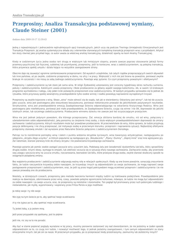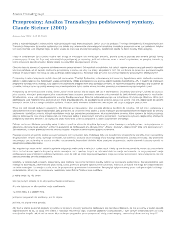 Analiza Transakcyjna.pl Przeprosiny; Analiza Transakcyjna podstawowej wymiany, Claude Steiner (2001) dodano dnia 2009-10-17 12:59:43 Jedną z najważniejszych i jednocześnie najtrudniejszych opcji transakcyjnych, jakich uczy się podczas Treningu Umiejętności Emocjonalnych jest Transakcja Przeprosin. Jej analiza systematyczna składa się z elementów stanowiących kompletną transakcję przeprosin wraz z przykładami. Artykuł ten służy również jako przykład tego, co autor uważa za właściwą analizę transakcyjną, działalność opartą na teorii Analizy Transakcyjnej. Kiedy w codziennym życiu jedna osoba rani drugą w większym lub mniejszym stopniu, prawie zawsze poprzez stosowanie jakiejś formy przemocy-psychicznej lub fizycznej, subtelnej lub prymitywnej, przeprosiny, jeśli to konieczne, wraz z zadośćuczynieniem, są potężną transakcją, która przywraca spokój umysłu i działa kojąco na wszystkie zaangażowane strony. Obecnie daje się zauważyć ogromne zainteresowanie przeprosinami. Od wysokich urzędników, lub całych rządów przepraszających swoich obywateli lub inne państwa, aż po zwykłe, codzienne przeprosiny w domu, na ulicy i w pracy. Większość z nich nie jest brana na poważnie, ponieważ zwykle brakuje im szczerości i nie niosą za sobą żadnego zadośćuczynienia. Powstaje więc pytanie: Co czyni przeprosiny poważnymi i efektywnymi? Przeprosiny i zadośćuczynienie są tak stare jak sama wina. W religii Żydowskiej ustanowiony jest coroczny tygodniowy okres rachunku sumienia, pokuty i zadośćuczynienia. Katolicyzm uważa przeprosiny i Boże przebaczenie za główny aspekt swojego katechizmu. AA, w swoim 12-krokowym programie wychodzenia z nałogu, cały jeden krok poświęciło przeprosinom oraz zadośćuczynieniu. W każdym przypadku sprowadza się to jednak do rytuałów, które przynoszą spokój wewnętrzny prawdopodobnie tylko osobie winnej i rzadko powodują naprawienie wyrządzonych krzywd. Przeprosiny są zwykle kojarzone z winą. Słowo „wina” może odnosić się do osądu, tak jak w stwierdzeniu: Oskarżony jest winny!", lub też do uczucia. Jako uczucie, wina jest postrzegana jako stosunkowo bezużyteczna, ponieważ niekoniecznie prowadzi do jakichkolwiek pozytywnych rezultatów. Strukturalnie, wina jest prawdopodobnie emocją Zaadaptowanego Dziecka odpowiadającego na oskarżenia Krytycznego Rodzica. Wina jest postrzegana jako nieefektywna, ponieważ jest mało prawdopodobne, że Zaadaptowane Dziecko, czując się winne i nie OK, doprowadzi do jakichś istotnych zmian, lub szczerego zadośćuczynienia. Przebaczenie winnemu dziecku nie zawsze jest też oczyszczającym przeżyciem. Wina nie jest jednak jedynym powodem, dla którego przepraszamy. Żal, emocja zbliżona bardziej do smutku, niż od winy, połączony z uświadomieniem sobie odpowiedzialności, jaką ponosimy za cierpienie innej osoby, z dużo większym prawdopodobieństwem doprowadzi do zmiany zachowania i zadośćuczynienia, których rezultatem może być prawdziwe przebaczenie. W przeciwieństwie do winy, która sprawia, że ludzie przyjmują pozycje defensywną i nie chcą przepraszać, żal motywuje osobę w przeciwnym kierunku: przeprosin i naprawienia sytuacji. Najbardziej efektywne przeprosiny stanowią smutek i żal wyrażane przez Naturalne Dziecko połączone z zadośćuczynieniem Dorosłego. Patrząc na to rozróżnienie pomiędzy winą i żalem z punktu widzenia skryptów życiowych, wina towarzyszy antyskryptowi, następującemu po odegraniu „skryptu złego uczynku”, w którym popularne są następujące gry „Nieudacznik,” „Pijany i Dumny”, „Kopnij mnie” oraz inne agresywne gry. Żal natomiast, stanowi pierwszy krok do zmiany skryptu i nie powtarzania krzywdzącego zachowania. Powstaje pytanie jak pomóc osobie zastąpić poczucie winy uczuciem żalu. Podstawą żalu jest świadomość dyskomfortu lub bólu, który sprawiliśmy drugiej osobie. Innymi słowy, wymaga to empatii, lub zdolności wczucia się w sytuację ofiary naszego zachowania. Zachęcanie osoby, aby przeniosła swą uwagę z poczucia winy na uczucia smutku, rozczarowania, beznadziei lub bólu, które przeżywa druga osoba, zwykle stanowi skuteczny sposób na osiągnięcie pożądanej zmiany. Bez wątpienia przebaczenie i zadośćuczynienie odgrywają ważną rolę w relacjach społecznych. Kiedy są one brane poważnie, oznaczają zrozumienie faktu, że ludzie rzeczywiście krzywdzą siebie nawzajem, że krzywdząc innych są odpowiedzialni za swoje zachowanie, że mogą naprawić swoje postępowanie przeprosinami i zadośćuczynieniem, oraz, że jeśli są przez kogoś pokrzywdzeni mogą oczekiwać przeprosin i zadośćuczynienia i że nie zawsze prowadzą one do przebaczenia. Niestety, w dzisiejszych czasach, przeprosiny jako metoda tworzenia harmonii między ludźmi są traktowane podejrzliwie. Prawdopodobnie jako reakcja na dawniejsze, zdominowane przez winę, czasy, powstało potężne ograniczenie kulturowe, mówiące, że ludzie nie mogą być odpowiedzialni za siebie nawzajem i za swoje uczucia, oraz, że przeprosiny są nieistotne i staromodne. Ten pogląd był promowany przez ruch potencjału ludzkiego i nieświadomie, jak myślę, wypromowany i wspierany przez Fritza Persla w jego modlitwie: Ja robię swoje i ty rób swoje Nie żyję na tym świecie po to, aby spełniać twoje oczekiwania A ty nie żyjesz po to, aby spełniać moje oczekiwania. Ty jesteś tobą, a ja jestem mną. Jeśli przez przypadek się spotkamy, jest to piękne Jeśli nie, nic się na to nie poradzi. Aby być w stanie popierać poglądy wyrażone w tej pracy, musimy ponownie zastanowić się nad stwierdzeniem, że nie jesteśmy w żaden sposób odpowiedzialni za to, co czują inni ludzie, i rozważyć możliwość tego, iż jednak jesteśmy zaangażowani, i tym samym odpowiedzialni za stany emocjonalne innych, tak jak oni za nasze. W przeciwnym przypadku, po co przepraszać kiedy pr
