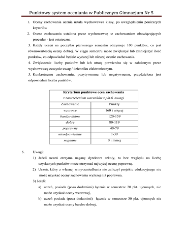 Punktowy system oceniania w Publicznym Gimnazjum Nr 5 1. Oceny zachowania ucznia ustala wychowawca klasy, po uwzględnieniu poniższych kryteriów 2. Ocena zachowania ustalona przez wychowawcę -z zachowaniem obowiązujących procedur - jest ostateczna. 3. Każdy uczeń na początku pierwszego semestru otrzymuje 100 punktów, co jest równowartością oceny dobrej. W ciągu semestru może zwiększyć lub zmniejszyć ilość punktów, co odpowiadać będzie wyższej lub niższej ocenie zachowania. 4. Zwiększenie liczby punktów lub ich utratę potwierdza się w założonym przez wychowawcę zeszycie uwag / dzienniku elektronicznym. 5. Konkretnemu zachowaniu, pozytywnemu lub negatywnemu, przydzielona jest odpowiednia liczba punktów. Kryterium punktowe ocen zachowania z zastrzeżeniem warunków z pkt.6 -uwagi 6. Zachowanie Punkty wzorowe 160 i więcej bardzo dobre 120-159 dobre 80-119 poprawne 40-79 nieodpowiednie 1-39 naganne 0 i mniej Uwagi: 1) Jeżeli uczeń otrzyma naganę dyrektora szkoły, to bez względu na liczbę uzyskanych punktów może otrzymać najwyżej ocenę poprawną. 2) Uczeń, który z własnej winy-zaniedbania nie zaliczył projektu edukacyjnego nie może uzyskać oceny zachowania wyższej niż poprawna. 3) Jeżeli: a) uczeń, posiada (poza dodatnimi) łącznie w semestrze 20 pkt. ujemnych, nie może uzyskać oceny wzorowej, b) uczeń posiada (poza dodatnimi) łącznie w semestrze 30 pkt. ujemnych nie może uzyskać oceny bardzo dobrej, Punktowy system oceniania w Publicznym Gimnazjum Nr 5 c) uczeń posiada (poza dodatnimi) łącznie w semestrze 50 pkt. nie może uzyskać oceny dobrej. d) uczeń posiada (poza dodatnimi) łącznie w semestrze 70 pkt. nie może uzyskać oceny poprawnej. e) Uczeń który posiada 70 punktów ujemnych i więcej oraz zachowanie nieodpowiednie lub naganne nie może reprezentować szkoły w zawodach sportowych i konkursach przedmiotowych a także kandydować do Samorządu Uczniowskiego. 4) W drugim półroczu wyjściowa punktacja (100pkt) jest modyfikowana w zależności od oceny z zachowania uzyskanej w pierwszym półroczu i tak: wzorowe: +20pkt bardzo dobre: +10pkt dobre: + 0pkt. poprawne: -10pkt nieodpowiednie: -20pkt naganne: - 30pkt 7. Zasady przyznawania punktów: 1) zajęcie miejsc 1-3 w konkursie organizowanych przez Kuratora Oświaty, zawodach sportowych na szczeblu: ogólnopolskim/wojewódzkim +30pkt. rejonowym +20 pkt. (powiat, gmina) szkolnym +10 pkt. wpisuje nauczyciel przygotowujący ucznia do konkursu, zawodów lub wychowawca w na podstawie odpowiedniego zaświadczenia, jeżeli nie była to impreza, podczas której opiekunem ucznia był nauczyciel PG5 2) udział (bez zajęcia miejsca 1-3) w konkursie, zawodach sportowych: 0 – 10 pkt. wpisuje nauczyciel przygotowujący ucznia do konkursu, zawodów lub wychowawca w na podstawie odpowiedniego zaświadczenia, jeżeli nie była to impreza, podczas której opiekunem ucznia był nauczyciel PG5 3) Udział w projekcie edukacyjnym 0-20pkt. wpisuje nauczyciel opiekun projektu raz w roku-trwania projektu na jego zakończenie. 4) regularna (cały semestr) praca na rzecz szkoły lub społeczności lokalnej realizowana pod kierunkiem nauczyciela, instruktora, opiekuna (samorząd uczniowski, chór, koło teatralne, szkolne koło Caritas, ZHP, ZHR itd. ): 0 – 20 pkt. Punktowy system oceniania w Publicznym Gimnazjum Nr 5 jednorazowo pod koniec semestru, wpisuje nauczyciel-opiekun grupy lub wychowawca na podstawie odpowiedniego zaświadczenia. 4a) jednorazowe akcje charytatywne 0-10 pkt. 5) regularny udział w szkolnych zajęciach pozalekcyjnych: frekwencja na zajęciach: poniżej 70%: 0pkt. od 70% do 80%: 5pkt. od 81% do 90%: 10 pkt. od 91 do 100%: 15 pkt. jednorazowo pod koniec semestru, wpisuje nauczyciel prowadzący zajęcia dodatkowe 6) zachowanie na terenie szkoły oraz poza nią: +/- 0 - 5pkt. wpisuje każdorazowo nauczyciel, +/- 0 - 10 pkt. wpisuje każdorazowo wychowawca, +/- 0 - 20 pkt. wpisuje każdorazowo Dyrektor szkoły, -50 pkt. nagana dyrektora szkoły. 7) frekwencja semestralna: + 10pkt. za brak spóźnień w semestrze, + 20 pkt. za brak nieobecności w semestrze, + 10pkt. za brak nieusprawiedliwionych nieobecności w semestrze, - 2 pkt. za każde nieusprawiedliwione spóźnienie powyżej trzech, - 3 pkt. za każdą nieusprawiedliwioną godzinę, jednorazowo pod koniec semestru wpisuje wychowawca klasy 8) inne zachowania negatywne: brak identyfikatora: -3pkt. (jeden raz w ciągu dnia, wpisuje nauczyciel) niestosowny wygląd: -1pkt., -5pkt., -10pkt. jeden raz w ciągu dnia, jeżeli nie jest możliwa zmiana wyglądu (np. farbowane włosy), w pozostałych przypadkach podczas każdych zajęć na terenie szkoły (np. makijaż), samowolne opuszczenie terenu szkoły podczas lekcji/przerwy: 5 pkt. wpisuje nauczyciel lub wychowawca, Punktowy system oceniania w Publicznym Gimnazjum Nr 5 stosowanie używek (papierosy, alkohol i inne): -10 pkt. –pierwsze dwa razy, wpisuje nauczyciel lub wychowawca, każde kolejne: wpisuje Dyrektor (maksymalnie -20 pkt.) niestosowne zachowanie w stosunku do pracowników szkoły lub osób spoza szkoły: od -5pkt. do -20 pkt. (wpisuje nauczyciel, wychowawca lub Dyrektor zgodnie z uprawnieniami określonymi w punkcie 6) wszelkie przejawy agresji (rękoczyny, cyberprzemoc, agresja słowna- wpisuje wychowawca w porozumieniu z pedagogiem i Dyrektorem szkoły maksymalnie:-20 pkt. bierna postawa wobec niestosownego zachowania innych uczniów – maksymalnie: -15 8. Dyrektor szkoły (również na umotywowany wniosek rodziców, ucznia) może zobowiązać wychowawcę do ponownego ustalenia oceny zachowania jeżeli stwierdzi, że nie zostały zachowane obowiązujące procedury.
