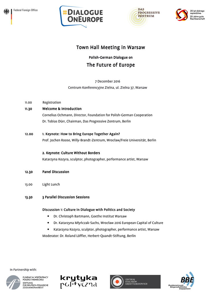 Town Hall Meeting in Warsaw PolishPolish-German Dialogue on The Future of Europe 7 December 2016 Centrum Konferencyjne Zielna, ul. Zielna 37, Warsaw 11.00 Registration 11.30 Welcome & Introduction Cornelius Ochmann, Director, Foundation for Polish-German Cooperation Dr. Tobias Dürr, Chairman, Das Progressive Zentrum, Berlin 12.00 1. Keynote: How to Bring Europe Together Again? Prof. Jochen Roose, Willy-Brandt-Zentrum, Wrocław/Freie Universität, Berlin 2. Keynote: Culture Without Borders Katarzyna Kozyra, sculptor, photographer, performance artist, Warsaw 12.30 Panel Discussion 13.00 Light Lunch 13.30 3 Parallel Discussion Sessions Discussion 1: Culture in Dialogue with Politics and Society • Dr. Christoph Bartmann, Goethe Institut Warsaw • Dr. Katarzyna Młyńczak-Sachs, Wrocław 2016 European Capital of Culture • Katarzyna Kozyra, sculptor, photographer, performance artist, Warsaw Moderator: Dr. Roland Löffler, Herbert-Quandt-Stiftung, Berlin In Partnership with: Discussion 2: Future Organisation of Europe: Do We Need Game Changers? • Barbara Nowacka, Inicjatywa Polska, Warsaw • Prof. Gavin Rae, Koźmiński University, Warsaw • Dr. Marcin Kędzierski, Cracow University of Economics/Centre of Analyses of the Jagiellonian Club, Cracow Moderator: Dr. Małgorzata Bonikowska, Think Tank Centre For Dialogue and Analysis, Warsaw Discussion 3: The Future of PolishPolish-German Relations • Piotr Buras, European Council for Foreign Relations, Warsaw • Irene Hahn-Fuhr, Heinrich-Böll-Stiftung, Warsaw • Dr. hab. Sebastian Płóciennik, Polish Institute of International Affairs, Warsaw • Dr. Kai-Olaf Lang, Stiftung Wissenschaft und Politik, Berlin Moderator: Dr. Maria Skóra, Das Progressive Zentrum, Berlin 15:00 Coffee Break 15.30 Public Debate with: with: • Michael Roth, Minister of State for Europe, German Federal Foreign Office • Konrad Szymański, Secretary of State for European, Legal and Treaty Affairs, Ministry of Foreign Affairs of the Republic of Poland Moderator: Kaja Puto, Journalist/Writer, Korporacja Ha!Art, Cracow 17.00 Conclusions: onclusions: The Way Forward Janusz Reiter, Founder, Centre for International Relationships, Warsaw (TBC) 17.15 Closing Dr. Ansgar Klein, Managing Director, Bundesnetzwerk Bürgerschaftliches Engagement, Berlin Dr. Tobias Dürr, Chairman, Das Progressive Zentrum, Berlin 17:30 In Partnership with: R eception
