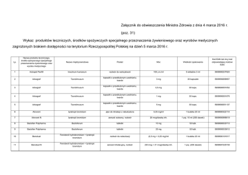 Załącznik do obwieszczenia Ministra Zdrowia z dnia 4 marca 2016 r. (poz. 31) Wykaz produktów leczniczych, środków spożywczych specjalnego przeznaczenia żywieniowego oraz wyrobów medycznych zagrożonych brakiem dostępności na terytorium Rzeczypospolitej Polskiej na dzień 5 marca 2016 r. Lp. Nazwa produktu leczniczego, środka spożywczego specjalnego przeznaczenia żywieniowego oraz wyrobu medycznego Nazwa międzynarodowa Postać Moc Wielkość opakowania Kod EAN lub inny kod odpowiadający kodowi EAN 1 Actrapid Penfill Insulinum humanum roztwór do wstrzykiwań 100 j.m./ml 5 wkładów 3 ml 5909990237920 2 Advagraf Tacrolimusum kapsułki o przedłużonym uwalnianiu, twarde 3 mg 30 kapsułek 5909990699957 3 Advagraf Tacrolimusum kapsułki o przedłużonym uwalnianiu, twarde 0,5 mg 30 kaps. 5909990051052 4 Advagraf Tacrolimusum kapsułki o przedłużonym uwalnianiu, twarde 1 mg 30 kaps. 5909990051076 5 Advagraf Tacrolimusum kapsułki o przedłużonym uwalnianiu, twarde 5 mg 30 kaps. 5909990051137 6 Atrovent Ipratropii bromidum płyn do inhalacji z nebulizatora 0,25 mg/ml 1 butelka 20 ml 5909990322114 7 Atrovent N Ipratropii bromidum aerozol wziewny, roztwór 20 mcg/dawkę inh. 1 poj. 10 ml (200 dawek) 5909990999019 8 Baclofen Polpharma Baclofenum tabletki 10 mg 50 tabl. 5909990033713 9 Baclofen Polpharma Baclofenum tabletki 25 mg 50 tabl. 5909990033812 10 Berodual Fenoteroli hydrobromidum + Ipratropii bromidum roztwór do nebulizacji (0,5 mg + 0,25 mg)/ml 1 butelka 20 ml 5909990101917 11 Berodual N Fenoteroli hydrobromidum + Ipratropii bromidum aerozol inhalacyjny, roztwór (50 mcg + 21 mcg)/dawkę inh. 1 poj. (200 dawek) 5909997225739 12 Berodual N Fenoteroli hydrobromidum + Ipratropii bromidum aerozol inhalacyjny, roztwór (50 mcg + 21 mcg)/dawkę inh. 1 poj. (200 dawek) 5909990917815 13 Cardura XL Doxazosinum tabl. o zmodyfikowanym uwalnianiu 4 mg 30 tabl. 5909990431410 14 Clexane Enoxaparinum natricum roztwór do wstrzykiwań 100 mg/ml 10 amp.-strzyk. 0,8 ml 5909990774920 15 Clexane Enoxaparinum natricum roztwór do wstrzykiwań 20 mg/0,2 ml 10 amp.-strzyk. 0,2 ml 5909990048328 16 Clexane Enoxaparinum natricum roztwór do wstrzykiwań 40 mg/0,4 ml 10 amp.-strzyk. 0,4 ml 5909990048427 17 Clexane Enoxaparinum natricum roztwór do wstrzykiwań 60 mg/0,6 ml 10 amp.-strzyk. 0,6 ml 5909990774821 18 Clexane Enoxaparinum natricum roztwór do wstrzykiwań 80 mg/0,8 ml 10 amp.-strzyk. 0,8 ml 5909990775026 19 Clexane forte Enoxaparinum natricum roztwór do wstrzykiwań 120 mg/0,8 ml 10 amp.-strzyk. 0,8 ml 5909990891429 20 Clexane forte Enoxaparinum natricum roztwór do wstrzykiwań 150 mg/ml 10 amp.-strzyk. 1 ml 5909990891528 21 Concerta Methylphenidati hydrochloridum tabletki o przedłużonym uwalnianiu 18 mg 30 tabl. 5909990655021 22 Concerta Methylphenidati hydrochloridum tabletki o przedłużonym uwalnianiu 36 mg 30 tabl. 5909990655038 23 Convulex Acidum valproicum kapsułki miękkie 500 mg 100 kaps. 5909990023813 24 Convulex 150 Acidum valproicum kapsułki miękkie 150 mg 100 kaps. 5909990244317 25 Convulex 300 Acidum valproicum kapsułki miękkie 300 mg 100 kaps. 5909990244416 26 Ebetrexat Methotrexatum roztwór do wstrzykiwań w ampułkostrzykawce 20 mg/ml 1 amp.-strzyk. 1,25 ml 5909990735266 27 Ebetrexat Methotrexatum roztwór do wstrzykiwań w ampułkostrzykawce 20 mg/ml 1 amp.-strzyk. 1 ml 5909990735235 28 Ebetrexat Methotrexatum roztwór do wstrzykiwań w ampułkostrzykawce 20 mg/ml 1 amp.-strzyk. 1,5 ml 5909990735297 29 Ebetrexat Methotrexatum roztwór do wstrzykiwań w ampułkostrzykawce 20 mg/ml 4 amp.-strzyk. 1,25 ml 5909990735273 30 Eligard 22,5 mg Leuprorelinum proszek i rozpuszczalnik do sporządzania roztworu do wstrzykiwań 22,5 mg 1 zestaw 5909990075751 31 Eligard 45 mg Leuprorelinum proszek i rozpuszczalnik do sporządzania roztworu do wstrzykiwań 45 mg 1 zestaw 5909990634057 32 Ezetrol Ezetimibum tabletki 10 mg 28 sztuk 5909990221066 33 Fostex Beclometasoni dipropionas + Formoteroli fumaras dihydricus aerozol inhalacyjny, roztwór (100 mcg + 6 mcg)/dawkę 1 poj. 180 dawek 5909990054152 34 Fragmin Dalteparinum natricum roztwór do wstrzykiwań 10 000 j.m. a.Xa/0,4 ml 5 amp.-strzyk. 0,4 ml 5909990958818 35 Fragmin Dalteparinum natricum roztwór do wstrzykiwań 10 000 j.m. a.Xa/4 ml 10 amp. 4 ml 5909990776719 36 Fragmin Dalteparinum natricum roztwór do wstrzykiwań 10 000 j.m. a.Xa/ml 10 amp. 1 ml 5909990776610 37 Fragmin Dalteparinum natricum roztwór do wstrzykiwań 12 500 j.m. a.Xa/0,5 ml 5 amp.-strzyk. 0,5 ml 5909990949519 38 Fragmin Dalteparinum natricum roztwór do wstrzykiwań 15 000 j.m. a.Xa/0,6 ml 5 amp.-strzyk. 0,6 ml 5909990949618 39 Fragmin Dalteparinum natricum roztwór do wstrzykiwań 18 000 j.m. a.Xa/0,72 ml 5 amp.-strzyk. 0,72 ml 5909990949717 40 Fragmin Dalteparinum natricum roztwór do wstrzykiwań 2500 j.m. a.Xa/0,2 ml 10 amp.-strzyk. 0,2 ml 5909990776412 41 Fragmin Dalteparinum natricum roztwór do wstrzykiwań 5000 j.m. a.Xa/0,2 ml 10 amp.-strzyk. 0,2 ml 5909990776511 42 Fragmin Dalteparinum natricum roztwór do wstrzykiwań 7 500 j.m. a.Xa/0,3 ml 10 amp.-strzyk. 0,3 ml 5909990949410 43 Fraxiparine Nadroparinum calcicum roztwór do wstrzykiwań 2850 j.m. a.Xa/0,3 ml 10 amp.-strzyk. 0,3 ml 5909990075621 44 Fraxiparine Nadroparinum calcicum roztwór do wstrzykiwań 3800 j.m. a.Xa/0,4 ml 10 amp.-strzyk. 0,4 ml 5909990716821 45 Fraxiparine Nadroparinum calcicum roztwór do wstrzykiwań 5700 j.m.a.Xa/0,6 ml 10 amp.-strzyk. 0,6 ml 5909990075720 46 Fraxiparine Nadroparinum calcicum roztwór do wstrzykiwań 7600 j.m. a.Xa/0,8 ml 10 amp.-strzyk. 0,8 ml 5909990716920 47 Fraxiparine Nadroparinum calcicum roztwór do wstrzykiwań 9500 j.m. a.Xa/ml 10 amp.-strzyk. 1,0 ml 5909990075829 48 Fraxodi Nadroparinum calcicum roztwór do wstrzykiwań 11 400 j.m. AXa/0,6 ml 10 amp.-strzyk. 0,6 ml 5909990836932 49 Fraxodi Nadroparinum calcicum roztwór do wstrzykiwań 15 200 j.m. AXa/0,8 ml 10 amp.-strzyk. 0,8 ml 5909990837038 50 Fraxodi Nadroparinum calcicum roztwó