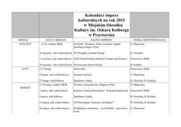 Kalendarz imprez kulturalnych na rok 2015 w Miejskim Ośrodku Kultury im. Oskara Kolberga w Przeworsku MIESIĄC STYCZEŃ LUTY DATA I MIEJSCE – 12.01, Galeria MOK NAZWA IMPREZY & PJAM - Wystawa „Prace rozmaite”-digital painting-Grzegorz Zych OSOBA ODPOWIEDZIALNA G. Manowiec 24 stycznia, sala widowiskowa XX Przegląd „Godnie Święta” B. Siwiecka 11 stycznia, sala widowiskowa XXII Finał Wielkiej Orkiestry Świątecznej Pomocy Pracownicy MOK 18 stycznia, sala widowiskowa Noworoczny koncert kolęd B. Kolejko 2-13 lutego Zimowisko Pracownicy MOK 9 lutego, sala widowiskowa Koncert rockowy G. Manowiec 22 lutego, sala klubowa Spotkanie z bajką B. Siwiecka, B. Kolejko 2 -20 marca, Galeria MOK Wystawa fotograficzna- Zbigniew Polit G. Manowiec 7 marca. sala widowiskowa Koncert z okazji Dnia Kobiet - Wojciech Bardowski Pracownicy MOK 8 marca, sala klubowa Spotkanie z bajką B. Siwiecka, B. Kolejko 12 marca, sala widowiskowa VII Prezentacje Taneczne „Solodance” B. Siwiecka, B. Kolejko 18 marca, sala widowiskowa Profilaktyka uzależnień – Lech Dyblik – opowieść o życiu G. Manowiec MARZEC KWIECIEŃ 19 marca, sala widowiskowa Kabaret pod Wyrwigroszem Pracownicy MOK 23 marca, sala widowiskowa XX Konkurs wokalny „Wygraj sukces” – eliminacje wstępne B. Siwiecka, B. Kolejko 7 kwietnia – 27 kwietnia Galeria MOK wystawa plastyczna G. Manowiec 12 kwietnia, sala klubowa Spotkanie z bajką B. Siwiecka, B. Kolejko 26 kwietnia, sala widowiskowa Taneczny Krąg Pracownicy MOK 29 kwietnia, sala widowiskowa Międzynarodowy Dzień Ziemi i Zdrowia 2015 MOK G. Manowiec 10 maja, sala klubowa Spotkanie z bajką B. Siwiecka, B. Kolejko, 25 maja, sala widowiskowa Dzień Matki – koncert B. Kolejko 18 maja, sala widowiskowa XVIII Konkurs Piosenki"I ty możesz zaśpiewać" B. Siwiecka, B. Kolejko 28 maja, sala widowiskowa Koncert rockowy G. Manowiec 1 czerwca, sala widowiskowa Dzień Dziecka impreza dla dzieci B. Siwiecka, B. Kolejko 15 czerwca, sala klubowa Spotkanie z bajką B. Siwiecka, B. Kolejko lipiec półkolonia dla dzieci z Przeworska MOK lipiec wakacje w MOK 2015 Pracownicy MOK 10-12 lipca, stadion miejski Dni Przeworska 2015 MOK, Urząd Miasta, MOSiR sierpień wakacje w MOK 2015 Pracownicy MOK 20 września, sala klubowa Spotkanie z bajką B. Siwiecka, B. Kolejko wrzesień wystawa plastyczna G. Manowiec MAJ CZERWIEC LIPIEC SIERPIEŃ WRZESIEŃ PAŹDZIERNIK LISTOPAD GRUDZIEŃ Jesień 2015 Przeworska Jesień Artystyczna Młodych 2015 G. Manowiec 18 października, sala klubowa Spotkanie z bajką B. Siwiecka, B Kolejko 12 października, sala widowiskowa MOK PJAM – koncert rockowy + wystawa G. Manowiec 15 listopada, sala klubowa MOK Spotkanie z bajką B. Siwiecka, B. Kolejko listopad, sala widowiskowa VIII Ogólnopolski Przegląd Amatorskiej Sztuki Filmowej G. Manowiec listopad, sala widowiskowa IV Przegląd Plastyki Przeworskiej G. Manowiec 25 listopada sala widowiskowa IV Powiatowy Przegląd Taneczny "Katarzynki" B. Siwiecka listopad, galeria MOK Wystawa pokonkursowa XVIII Konkursu Plastycznego i Fotograficznego „Nastroje jesieni” J. Olech 6 grudnia, sala klubowa Mikołajkowe Spotkanie z bajką B. Siwiecka, B. Kolejko grudzień, sala widowiskowa Mikołajki rockowe - koncert G. Manowiec