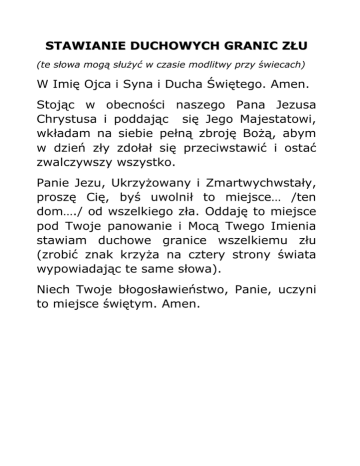 STAWIANIE DUCHOWYCH GRANIC ZŁU (te słowa mogą służyć w czasie modlitwy przy świecach) W Imię Ojca i Syna i Ducha Świętego. Amen. Stojąc w obecności naszego Pana Jezusa Chrystusa i poddając się Jego Majestatowi, wkładam na siebie pełną zbroję Bożą, abym w dzień zły zdołał się przeciwstawić i ostać zwalczywszy wszystko. Panie Jezu, Ukrzyżowany i Zmartwychwstały, proszę Cię, byś uwolnił to miejsce… /ten dom…./ od wszelkiego zła. Oddaję to miejsce pod Twoje panowanie i Mocą Twego Imienia stawiam duchowe granice wszelkiemu złu (zrobić znak krzyża na cztery strony świata wypowiadając te same słowa). Niech Twoje błogosławieństwo, Panie, uczyni to miejsce świętym. Amen.