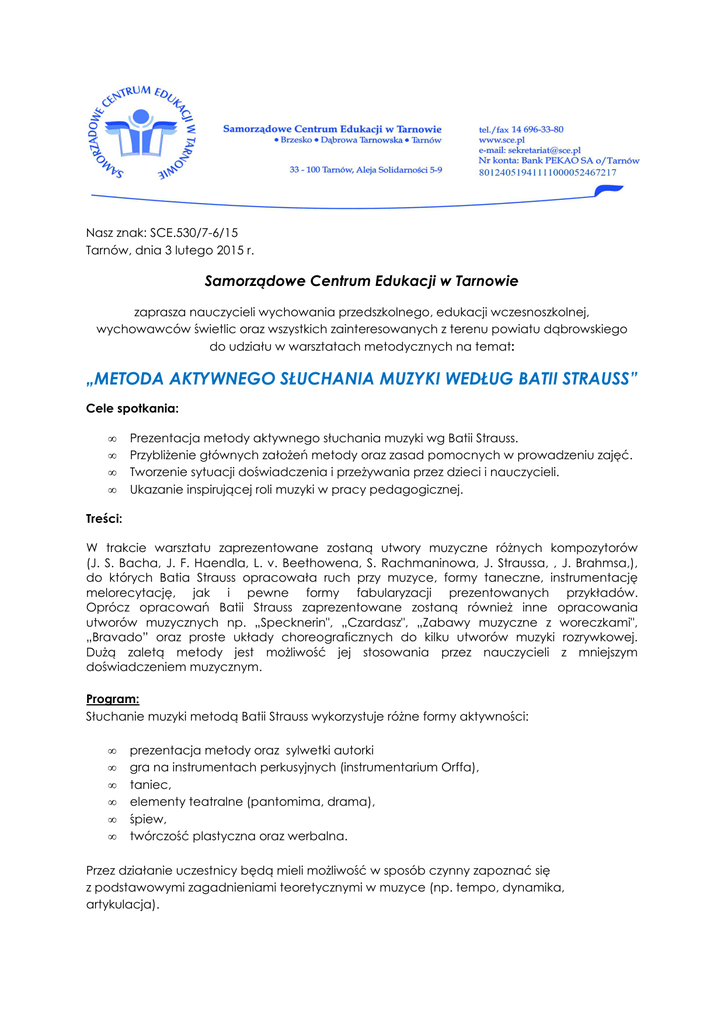 Nasz znak: SCE.530/7-6/15 Tarnów, dnia 3 lutego 2015 r. Samorządowe Centrum Edukacji w Tarnowie zaprasza nauczycieli wychowania przedszkolnego, edukacji wczesnoszkolnej, wychowawców świetlic oraz wszystkich zainteresowanych z terenu powiatu dąbrowskiego do udziału w warsztatach metodycznych na temat: „METODA AKTYWNEGO SŁUCHANIA MUZYKI WEDŁUG BATII STRAUSS” Cele spotkania: • • • • Prezentacja metody aktywnego słuchania muzyki wg Batii Strauss. Przybliżenie głównych założeń metody oraz zasad pomocnych w prowadzeniu zajęć. Tworzenie sytuacji doświadczenia i przeżywania przez dzieci i nauczycieli. Ukazanie inspirującej roli muzyki w pracy pedagogicznej. Treści: W trakcie warsztatu zaprezentowane zostaną utwory muzyczne różnych kompozytorów (J. S. Bacha, J. F. Haendla, L. v. Beethowena, S. Rachmaninowa, J. Straussa, , J. Brahmsa,), do których Batia Strauss opracowała ruch przy muzyce, formy taneczne, instrumentację melorecytację, jak i pewne formy fabularyzacji prezentowanych przykładów. Oprócz opracowań Batii Strauss zaprezentowane zostaną również inne opracowania utworów muzycznych np. „Specknerin", „Czardasz", „Zabawy muzyczne z woreczkami", „Bravado” oraz proste układy choreograficznych do kilku utworów muzyki rozrywkowej. Dużą zaletą metody jest możliwość jej stosowania przez nauczycieli z mniejszym doświadczeniem muzycznym. Program: Słuchanie muzyki metodą Batii Strauss wykorzystuje różne formy aktywności: • • • • • • prezentacja metody oraz sylwetki autorki gra na instrumentach perkusyjnych (instrumentarium Orffa), taniec, elementy teatralne (pantomima, drama), śpiew, twórczość plastyczna oraz werbalna. Przez działanie uczestnicy będą mieli możliwość w sposób czynny zapoznać się z podstawowymi zagadnieniami teoretycznymi w muzyce (np. tempo, dynamika, artykulacja). Warsztaty stanowią doskonałe doświadczenie w tworzeniu wspólnego celu, współdziałania, koncentracji i dobrej zabawy. Zajęcia warsztatowe poprowadzi: pani Małgorzata Szarek. Kilka słów o sobie: „Ukończyłam Państwową Szkołę Muzyczną I i II stopnia w Nowym Sączu w klasie fortepianu oraz śpiewu solowego. Moją edukację muzyczną kontynuowałam na kierunku Edukacja Artystyczna w zakresie Sztuki Muzycznej na Uniwersytecie Rzeszowskim. Ukończyłam też studia podyplomowe na kierunku Plastyka na Uniwersytecie Pedagogicznym w Krakowie. Pracę zawodową rozpoczęłam od prowadzenia programów wczesnodziecięcych w Szkole Muzycznej Yamacha w Nowym Sączu. Pracowałam z dziećmi i ich rodzicami w dwóch grupach wiekowych od 3 miesięcy do 1,5 roku (program „Niemowlaki w krainie muzyk”) oraz od 1,5 roku do 3 lat ( program „Szkraby” ), równocześnie powadziłam zajęcia z rytmiki w przedszkolach w Nowym Sączu. Od 2008 roku jestem zatrudniona w Samorządowym Centrum Edukacji Szkolnej w Tyliczu jako nauczyciel muzyki , plastyki i zajęć artystycznych. Brałam udział w projektach organizowanych przez Powiatowe Centrum Funduszy Europejskich „Aktywnie w przyszłość”,” Start na dobry początek” jako instruktor zajęć muzycznych. Od 2013 r. pracuję jako trener w projektach bezpośredniego wsparcia rozwoju szkółw Gminie Brzesko ( Przedszkole w Jurkowie, Tymowej, Tworkowej, Brzesku) oraz powiecie tarnowskim ( Przedszkole w Wojniczu i Żabnie) prowadząc warsztaty „ Metoda aktywnego słuchania muzyki według Batti Straus sposobem na motywowanie rozwoju dziecka w wieku przedszkolnym” Z metodą Batti Straus po raz pierwszy zetknęłam się na studiach jako jedna z wielu używanych w edukacji muzycznej, jednak podczas pracy z dziećmi zauważyłam jej wysoką skuteczność oraz duże możliwości jakie otwiera przed nauczycielem. Już w czasie studiów uczestniczyłam w warsztatach mających na celu poznanie tej metody oraz naukę jej wdrażanie w pracy z dziećmi. Pracując w przedszkolu jako nauczyciel rytmiki wykorzystywałam tę metodę i z czasem stała się ona wiodąca podczas moich zajęć. Opracowałam własne choreografie w oparciu o założenia metody do utworów muzyki klasycznej jak i rozrywkowej. Zajęcia prowadzone według programu Batti Strauss dają nauczycielowi możliwość w stosunkowo krótkim czasie osiągnięcie zamierzonego celu oraz wskazywanie w sposób niewerbalny na różne elementy dzieła muzycznego: formę, tempo, rytm, dynamikę, barwę. Jest to przede wszystkim nauka przez zabawę tak lubiana przez dzieci”. Czas trwania: 10 godzin. Termin spotkania: Po zebraniu 25 osobowej grupy (przewidywany: marzec/kwiecień 2015 r.). Miejsce: Dąbrowa Tarnowska. Szczegóły do ustalenia po zebraniu grupy. Zgłoszenie udziału pod numerem telefonu: 14 696 33 80 (SCE) lub mailem: [email protected] Wszelkich informacji udziela: Izabela Nadolnik – doradca metodyczny d.s. edukacji wczesnoszkolnej Samorządowego Centrum Edukacji w Tarnowie, pod numerem telefonu: 502 139 574 lub 14 696 33 80 Koszt szkolenia: Nauczyciele gmin zrzeszonych z Samorządowym Centrum Edukacji w Tarnowie- 100 zł. Pozostali nauczyciele: 120 zł UWAGA!!! Konieczny wygodny strój i obuwie zamienne.