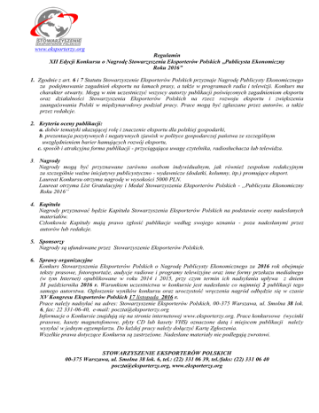 www.eksporterzy.org Regulamin XII Edycji Konkursu o Nagrodę Stowarzyszenia Eksporterów Polskich „Publicysta Ekonomiczny Roku 2016” 1. Zgodnie z art. 6 i 7 Statutu Stowarzyszenie Eksporterów Polskich przyznaje Nagrodę Publicysty Ekonomicznego za podejmowanie zagadnień eksportu na łamach prasy, a także w programach radia i telewizji. Konkurs ma charakter otwarty. Mogą w nim uczestniczyć wszyscy autorzy publikacji poświęconych zagadnieniom eksportu oraz działalności Stowarzyszenia Eksporterów Polskich na rzecz rozwoju eksportu i zwiększenia zaangażowania Polski w międzynarodowy podział pracy. Prace mogą być zgłaszane przez autorów, a także przez redakcje. 2. Kryteria oceny publikacji: a. dobór tematyki ukazującej rolę i znaczenie eksportu dla polskiej gospodarki, b. prezentacja pozytywnych i negatywnych zjawisk w polityce gospodarczej państwa ze szczególnym uwzględnieniem barier hamujących rozwój eksportu, c. sposób i atrakcyjna forma publikacji - przyciągająca uwagę czytelnika, radiosłuchacza lub telewidza. 3. Nagrody Nagrody mogą być przyznawane zarówno osobom indywidualnym, jak również zespołom redakcyjnym za szczególnie ważne inicjatywy publicystyczno - wydawnicze (dodatki, kolumny, itp.) promujące eksport. Laureat Konkursu otrzyma nagrodę w wysokości 5000 PLN. Laureat otrzyma List Gratulacyjny i Medal Stowarzyszenia Eksporterów Polskich - „Publicysta Ekonomiczny Roku 2016” 4. Kapituła Nagrody przyznawać będzie Kapituła Stowarzyszenia Eksporterów Polskich na podstawie oceny nadesłanych materiałów. Członkowie Kapituły mają prawo zgłosić publikacje według swojego uznania - poza nadesłanymi przez autorów lub redakcje. 5. Sponsorzy Nagrody są ufundowane przez Stowarzyszenie Eksporterów Polskich. 6. Sprawy organizacyjne Konkurs Stowarzyszenia Eksporterów Polskich o Nagrodę Publicysty Ekonomicznego za 2016 rok obejmuje teksty prasowe, fotoreportaże, audycje radiowe i programy telewizyjne oraz inne formy przekazu medialnego (w tym Internet) opublikowane w roku 2014 i 2015, przy czym termin ich nadsyłania upływa z dniem 31 października 2016 r. Warunkiem uczestnictwa w konkursie jest nadesłanie co najmniej 2 publikacji tego samego autorstwa. Ogłoszenie wyników konkursu oraz uroczystość wręczenia nagród odbędzie się w czasie XV Kongresu Eksporterów Polskich 17 listopada 2016 r. Prace należy nadsyłać na adres: Stowarzyszenie Eksporterów Polskich, 00-375 Warszawa, ul. Smolna 38 lok. 6, fax: 22 331-06-40, e-mail: [email protected] Informacje o Konkursie znajdują się na stronie internetowej www.eksporterzy.org. Prace konkursowe (wycinki prasowe, kasety magnetofonowe, płyty CD lub kasety VHS) oznaczone datą i miejscem publikacji należy wysyłać w jednym egzemplarzu. Do każdej pracy należy dołączyć Kartę Zgłoszenia. Wszelkie prawa dotyczące Konkursu są zastrzeżone. Nadesłane materiały nie podlegają zwrotowi. STOWARZYSZENIE EKSPORTERÓW POLSKICH 00-375 Warszawa, ul. Smolna 38 lok. 6, tel.: (22) 331 06 39, tel./faks: (22) 331 06 40 [email protected], www.eksporterzy.org