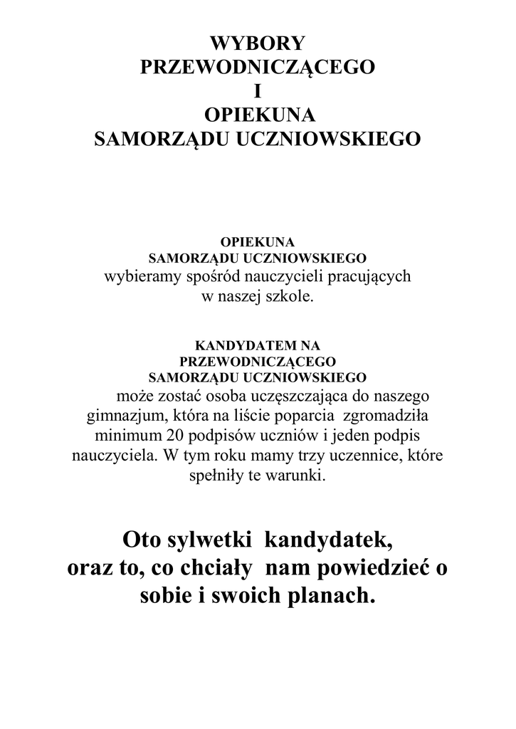 WYBORY PRZEWODNICZĄCEGO I OPIEKUNA SAMORZĄDU UCZNIOWSKIEGO OPIEKUNA SAMORZĄDU UCZNIOWSKIEGO wybieramy spośród nauczycieli pracujących w naszej szkole. KANDYDATEM NA PRZEWODNICZĄCEGO SAMORZĄDU UCZNIOWSKIEGO może zostać osoba uczęszczająca do naszego gimnazjum, która na liście poparcia zgromadziła minimum 20 podpisów uczniów i jeden podpis nauczyciela. W tym roku mamy trzy uczennice, które spełniły te warunki. Oto sylwetki kandydatek, oraz to, co chciały nam powiedzieć o sobie i swoich planach. Zofia Grochowiecka kl.IIIc Moje zainteresowania to jazda konna, czytanie książek, pływanie, podróżowanie. Jeżeli zostanę wybrana na przewodniczącą Samorządu Uczniowskiego postaram się wprowadzić w życie następujące przedsięwzięcia: - kontynuacja zbiórki żywności dla Markotu - Poczta walentynowa - Dzień Wiosny i dyskoteki okolicznościowe - Szczęśliwy numerek - Słodki kącik - apele na temat ochrony środowiska i praw zwierząt - zbiórki karmy dla psów ze schroniska w Pawłowie - wyjazd do schroniska w Pawłowie dla klasy, która uzbiera najwięcej karmy Wiktoria Oszczyk kl.IIIa Interesuję się motoryzacją. Lubię tworzyć projekty domów i dekorować ich wnętrza. W wolnym czasie zwiedzam różne ciekawe miejsca, fotografuję i czytam książki. Gdy zostanę przewodniczącą szkoły chciałabym kontynuować losowanie Szczęśliwego numerka. Postaram się o zorganizowanie wieczorku filmowego lub dyskoteki w naszej szkole. Chciałabym też żeby większa liczba uczniów uczęszczała na zajęcia pozalekcyjne np. kółko dziennikarskie. Brałabym pod uwagę pomysły innych uczniów, które byłyby rozpatrywane przez Samorząd Uczniowski. Poza tym obiecuję dbać o dobre imię szkoły i godnie reprezentować uczniów przed gronem nauczycielskim. Magdalena Julia Podlecka kl.IIIa Interesuje się sportem. Bardzo lubię wiele dyscyplin, ale moim największym zainteresowaniem cieszy się piłka nożna i skoki narciarskie. Gdybym została przewodniczącą szkoły chciałabym kontynuować losowanie Szczęśliwego numerka. Chętnie wróciłabym do Kolorowej trzynastki, o której słyszałam z opowieści. Przy wsparciu Samorządu Uczniowskiego oraz nauczycieli organizowałabym różne dyskoteki, loterie fantowe i słodkie kąciki. Jeśli zostanę przewodniczącą bez obaw będziecie mogli zgłaszać do mnie Wasze pomysły na to, jak urozmaicić nasze życie. Gwarantuję, że wszystko rozważę i przedyskutuję z odpowiednimi osobami. Nie chcę obiecywać gruszek na wierzbie. Pragnę wywiązać się z tych obietnic, które składam, gdyż wiem, że są one możliwe do zrealizowania. Wybierając mnie zyskacie przewodniczącą, z której będziecie zadowoleni. SERDECZNIE ZAPRASZAMY NA GŁOSOWANIE 15.09.2015 (wtorek)