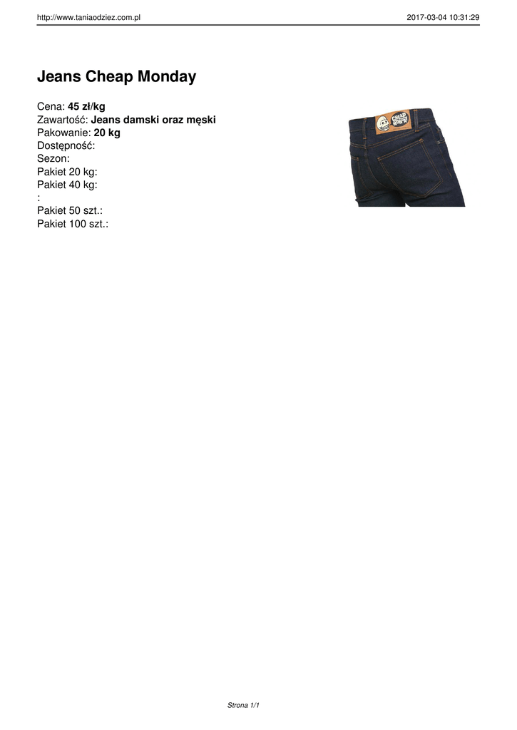 http://www.taniaodziez.com.pl 2017-03-04 10:31:29 Jeans Cheap Monday Cena: 45 zł/kg Zawartość: Jeans damski oraz męski Pakowanie: 20 kg Dostępność: Sezon: Pakiet 20 kg: Pakiet 40 kg: : Pakiet 50 szt.: Pakiet 100 szt.: Strona 1/1