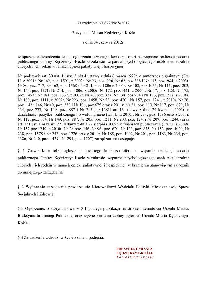 Zarządzenie Nr 872/PMS/2012 Prezydenta Miasta Kędzierzyn-Koźle z dnia 04 czerwca 2012r. w sprawie zatwierdzenia tekstu ogłoszenia otwartego konkursu ofert na wsparcie realizacji zadania publicznego Gminy Kędzierzyn-Koźle w zakresie wsparcia psychologicznego osób nieuleczalnie chorych i ich rodzin w ramach opieki paliatywnej i hospicyjnej Na podstawie art. 30 ust. 1 i ust. 2 pkt 4 ustawy z dnia 8 marca 1990r. o samorządzie gminnym (Dz. U. z 2001r. Nr 142, poz. 1591, z 2002r. Nr 23, poz. 220, Nr 62, poz.558 i Nr 113, poz. 984, z 2003r. Nr 80, poz. 717, Nr 162, poz. 1568 i Nr 214, poz. 1806 z 2004r. Nr 102, poz.1055, Nr 116, poz.1203, Nr 153, poz. 1271i Nr 214, poz. 1806, z 2005r. Nr 172, poz.1441, z 2006r. Nr 17, poz. 128, Nr 175, poz. 1457 i Nr 181, poz. 1337, z 2007r. Nr 48, poz. 327, Nr 138, poz.974 i Nr 173, poz.1218, z 2008r. Nr 180, poz. 1111, z 2009r. Nr 223, poz. 1458, Nr 52, poz. 420 i Nr 157, poz. 1241, z 2010r. Nr 28, poz. 142 i 146, Nr 40, poz. 230 i Nr 106, poz.675 oraz z 2011r. Nr 21, poz. 113, Nr 117, poz. 679, Nr 134, poz. 777, Nr 149, poz. 887 i Nr 217 poz.1281) art. 13 ustawy z dnia 24 kwietnia 2003r. o działalności pożytku publicznego i o wolontariacie (Dz. U. z 2010r. Nr 234, poz. 1536 oraz z 2011r. Nr 112, poz. 654, Nr 149, poz. 887, Nr 205, poz. 1211, Nr 208, poz. 1241i Nr 209, poz. 1244,) oraz art. 151 ust. 1 oraz art. 221 ustawy z dnia 27 sierpnia 2009r. o finansach publicznych (Dz. U. z 2009r. Nr 157 poz.1240, z 2010r. Nr 28 poz. 146, Nr 96, poz. 620, Nr 123, poz. 835, Nr 152, poz. 1020, Nr 238, poz. 1578 i Nr 257, poz. 1726 oraz z 2011r. Nr 185, poz. 1092, Nr 201, poz. 1183, Nr 234, poz. 1386, Nr 240, poz. 1429 i Nr 291, poz. 1707) zarządzam co następuje: § 1 Zatwierdzam tekst ogłoszenia otwartego konkursu ofert na wsparcie realizacji zadania publicznego Gminy Kędzierzyn-Koźle w zakresie wsparcia psychologicznego osób nieuleczalnie chorych i ich rodzin w ramach opieki paliatywnej i hospicyjnej, w brzmieniu stanowiącym załącznik do niniejszego zarządzenia. § 2 Wykonanie zarządzenia powierza się Kierownikowi Wydziału Polityki Mieszkaniowej Spraw Socjalnych i Zdrowia. § 3 Ogłoszenie, o którym mowa w § 1 podlega publikacji na stronie internetowej Urzędu Miasta, Biuletynie Informacji Publicznej oraz wywieszeniu na tablicy ogłoszeń Urzędu Miasta KędzierzynKoźle. § 4 Zarządzenie wchodzi w życie z dniem podjęcia. PREZYDENT MIASTA KĘDZIERZYN-KOŹLE T o m a s z W a n t u ł a (-) Załącznik do Zarządzenia Nr 872/PMS/2012 Prezydenta Miasta Kędzierzyn – Koźle z dnia 04 czerwca 2012 roku Ogłoszenie otwartego konkursu ofert na wsparcie realizacji zadania publicznego Gminy Kędzierzyn-Koźle w zakresie wsparcia psychologicznego osób nieuleczalnie chorych i ich rodzin w ramach opieki paliatywnej i hospicyjnej Na postawie art. 13 ustawy z dnia 24 kwietnia 2003r. o działalności pożytku publicznego i o wolontariacie ( Dz. U. Nr 96, poz.873) oraz art. 221 ustawy z dnia 27.08.2009r., o finansach publicznych (Dz. U. 157 poz. 1240), Prezydent Miasta Kędzierzyn-Koźle ogłasza otwarty konkurs ofert na wsparcie realizacji zadania publicznego Gminy Kędzierzyn-Koźle w zakresie: wsparcia psychologicznego osób nieuleczalnie chorych i ich rodzin w ramach opieki paliatywnej i hospicyjnej od daty zawarcia umowy do 30 listopada 2012r. W konkursie mogą wziąć udział organizacje pozarządowe oraz osoby prawne i jednostki organizacyjne, o których mowa w art. 3 ust. 2 i 3 ustawy o działalności pożytku publicznego i o wolontariacie. I OPIS ZADANIA 1. Cel i zakres zadania Wsparcie psychologiczne osób nieuleczalnie chorych, z postępującymi chorobami nowotworowymi lub w okresie terminalnym oraz ich rodzin w trakcie trwania choroby i w żałobie, zamieszkałych na terenie Kędzierzyna-Koźla w ramach opieki paliatywnej i hospicyjnej, w miejscu realizacji zadania jak i w domu pacjenta. 2. Wysokość dotacji a) Wysokość środków ujętych w budżecie przeznaczonych na zadanie w 2011r. – 0,00 zł b) Wysokość środków ujętych w budżecie przeznaczonych na zadanie w 2012r. – 10.800,00 zł 3. Wydatki pokrywane z dotacji wynagrodzenia (bez składek na ZUS i Fundusz Pracy ponoszonych przez wypłacającego wynagrodzenie) osób udzielających wsparcia psychologicznego w ramach opieki paliatywnej i hospicyjnej (psycholog lub psycholog kliniczny), przy czym wysokość tego wynagrodzenia nie może przekroczyć kwoty 60 zł. za godzinę zegarową, a liczba godzin pracy finansowanych z dotacji nie może przekroczyć 36 godz. miesięcznie. 4. Warunki, jakie winien spełniać podmiot ubiegający się o dotację na realizację zadania: a) Dysponowanie przez podmiot ubiegający się o dotację kadrą posiadającą kwalifikacje zawodowe do udzielania wsparcia psychologicznego: psycholog lub psycholog kliniczny, legitymującą się dyplomem i doświadczeniem zawodowym w pracy w ramach opieki paliatywnej i hospicyjnej (udokumentowane oświadczeniem oferenta oraz dyplomami, certyfikatami itp.) b) Dysponowanie przez podmiot ubiegający się o dotację lokalem (udokumentowane tytułem prawnym). c) Dyspozycyjność kadry psychologicznej, podmiotu ubiegającego się o udzielenie dotacji świadczącej opiekę psychologiczną również w domach pacjentów. II. SKŁADANIE OFERT 1. Kompletne oferty należy składać na formularzu stanowiącym załącznik nr 1 do rozporządzenia Ministra Pracy i Polityki Społecznej z dnia 15 grudnia 2010r. (dostępny od dnia ukazania się niniejszego ogłoszenia na stronie internetowej BIP Urzędu Miasta Kędzierzyn-Koźle – www.kedzierzynkozle.pl) w nieprzekraczalnym terminie do dnia 25 czerwca 2012r. w Kancelarii Ogólnej Urzędu Miasta Kędzierzyn-Koźle, ul. Piramowicza 32, pokój nr 109. 2. Do oferty należy dołączyć następujące załączniki: a) odpis z Krajowego Rejestru Sądowego lub innego rejestru obowiązkowego dla oferenta, wystawiony po ostatniej zmianie, jednak nie wcześniej niż 3 miesiące przed datą wyz
