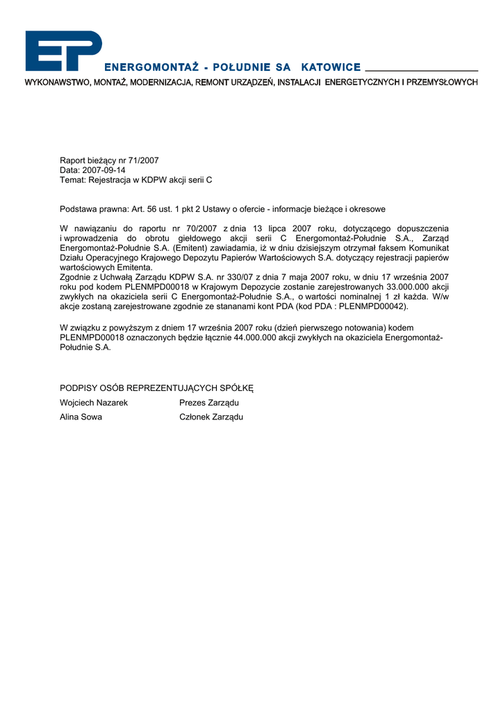 Raport bieżący nr 71/2007 Data: 2007-09-14 Temat: Rejestracja w KDPW akcji serii C Podstawa prawna: Art. 56 ust. 1 pkt 2 Ustawy o ofercie - informacje bieżące i okresowe W nawiązaniu do raportu nr 70/2007 z dnia 13 lipca 2007 roku, dotyczącego dopuszczenia i wprowadzenia do obrotu giełdowego akcji serii C Energomontaż-Południe S.A., Zarząd Energomontaż-Południe S.A. (Emitent) zawiadamia, iż w dniu dzisiejszym otrzymał faksem Komunikat Działu Operacyjnego Krajowego Depozytu Papierów Wartościowych S.A. dotyczący rejestracji papierów wartościowych Emitenta. Zgodnie z Uchwałą Zarządu KDPW S.A. nr 330/07 z dnia 7 maja 2007 roku, w dniu 17 września 2007 roku pod kodem PLENMPD00018 w Krajowym Depozycie zostanie zarejestrowanych 33.000.000 akcji zwykłych na okaziciela serii C Energomontaż-Południe S.A., o wartości nominalnej 1 zł każda. W/w akcje zostaną zarejestrowane zgodnie ze stananami kont PDA (kod PDA : PLENMPD00042). W związku z powyższym z dniem 17 września 2007 roku (dzień pierwszego notowania) kodem PLENMPD00018 oznaczonych będzie łącznie 44.000.000 akcji zwykłych na okaziciela EnergomontażPołudnie S.A. PODPISY OSÓB REPREZENTUJĄCYCH SPÓŁKĘ Wojciech Nazarek Prezes Zarządu Alina Sowa Członek Zarządu