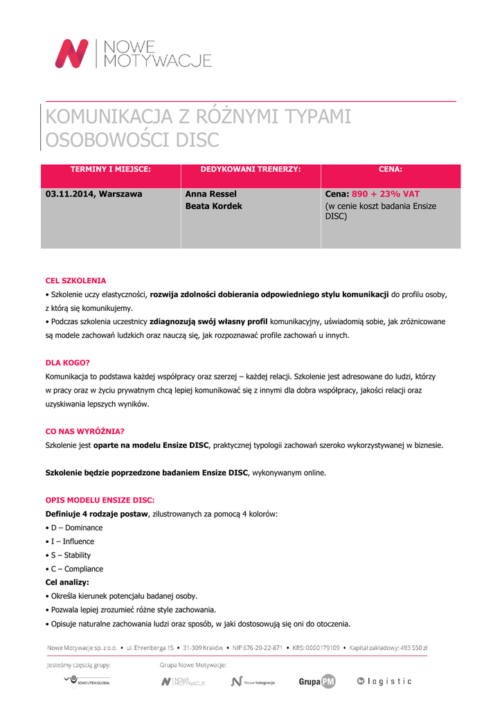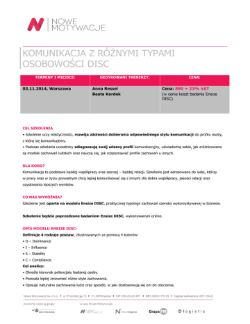 KOMUNIKACJA Z RÓŻNYMI TYPAMI OSOBOWOŚCI DISC TERMINY I MIEJSCE: 03.11.2014, Warszawa DEDYKOWANI TRENERZY: Anna Ressel Beata Kordek CENA: Cena: 890 + 23% VAT (w cenie koszt badania Ensize DISC) CEL SZKOLENIA • Szkolenie uczy elastyczności, rozwija zdolności dobierania odpowiedniego stylu komunikacji do profilu osoby, z którą się komunikujemy. • Podczas szkolenia uczestnicy zdiagnozują swój własny profil komunikacyjny, uświadomią sobie, jak zróżnicowane są modele zachowań ludzkich oraz nauczą się, jak rozpoznawać profile zachowań u innych. DLA KOGO? Komunikacja to podstawa każdej współpracy oraz szerzej – każdej relacji. Szkolenie jest adresowane do ludzi, którzy w pracy oraz w życiu prywatnym chcą lepiej komunikować się z innymi dla dobra współpracy, jakości relacji oraz uzyskiwania lepszych wyników. CO NAS WYRÓŻNIA? Szkolenie jest oparte na modelu Ensize DISC, praktycznej typologii zachowań szeroko wykorzystywanej w biznesie. Szkolenie będzie poprzedzone badaniem Ensize DISC, wykonywanym online. OPIS MODELU ENSIZE DISC: Definiuje 4 rodzaje postaw, zilustrowanych za pomocą 4 kolorów: • D – Dominance • I – Influence • S – Stability • C – Compliance Cel analizy: • Określa kierunek potencjału badanej osoby. • Pozwala lepiej zrozumieć różne style zachowania. • Opisuje naturalne zachowania ludzi oraz sposób, w jaki dostosowują się oni do otoczenia. Przebieg badania i raport • Badanie jest prowadzone online, każdy z badanych otrzymuje hasło umożliwiające zalogowanie się w systemie. • Podczas szkolenia każdy z uczestników otrzymuje indywidualny raport z analizy. KORZYŚCI DLA UCZESTNIKÓW • Poznasz swój styl zachowań według typologii Ensize DISC; zidentyfikujesz potrzeby, mocne strony i ograniczenia komunikacyjne. • Nauczysz się diagnozować style zachowań innych ludzi. • Dowiesz się, w jaki sposób efektywnie komunikować się z osobami reprezentującymi odmienny od Twojego styl zachowań. • Rozwiniesz umiejętności komunikacji z dopasowaniem typologicznym. PROGRAM Typologia zachowań a efektywność komunikacyjna • Czym jest efektywna komunikacja? • Indywidualne preferencje postrzegania i podejmowania decyzji. • Charakterystyka czterech stylów zachowań Ensize DISC: • Profil naturalny i adaptowany. • Potencjalne mocne strony i ograniczenia. • Preferowane role zespołowe. • Wpływ preferowanego stylu zachowań na sposób komunikacji. • Ćwiczenia w diagnozowaniu stylów – przykłady filmowe. Indywidualna diagnoza stylu komunikacji • Analiza raportu indywidualnego Ensize DISC. • Mój styl kontaktowania się z innymi – czego potrzebuję dla dobrej komunikacji i współpracy? • Jak komunikuję się z osobami odmiennymi ode mnie? Typologiczna „komunikacyjna instrukcja obsługi” • Komunikacja: reguły uniwersalne oraz reguły temperamentalne. • Praktyczne wskazówki komunikacji uwzględniającej różnorodność stylów zachowań. • Inteligentne ścieżki komunikacji, czyli dopasowanie typologiczne. • Wywieranie wpływu: od typologicznego rozdźwięku do dopasowania – przykłady filmowe. Warsztat komunikacji z dopasowaniem typologicznym • Docenianie innych – sztuka niedoceniana. • Co ważne w docenianiu poszczególnych temperamentów? • Docenianie odmiennego od własnego stylu zachowań – symulacje rozmów i informacje zwrotne.