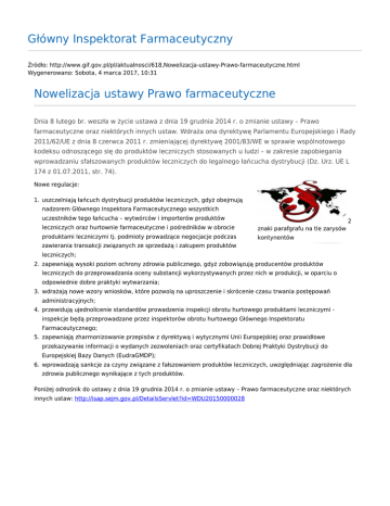 Główny Inspektorat Farmaceutyczny Źródło: http://www.gif.gov.pl/pl/aktualnosci/618,Nowelizacja-ustawy-Prawo-farmaceutyczne.html Wygenerowano: Sobota, 4 marca 2017, 10:31 Nowelizacja ustawy Prawo farmaceutyczne Dnia 8 lutego br. weszła w życie ustawa z dnia 19 grudnia 2014 r. o zmianie ustawy – Prawo farmaceutyczne oraz niektórych innych ustaw. Wdraża ona dyrektywę Parlamentu Europejskiego i Rady 2011/62/UE z dnia 8 czerwca 2011 r. zmieniającej dyrektywę 2001/83/WE w sprawie wspólnotowego kodeksu odnoszącego się do produktów leczniczych stosowanych u ludzi – w zakresie zapobiegania wprowadzaniu sfałszowanych produktów leczniczych do legalnego łańcucha dystrybucji (Dz. Urz. UE L 174 z 01.07.2011, str. 74). Nowe regulacje: 1. uszczelniają łańcuch dystrybucji produktów leczniczych, gdyż obejmują nadzorem Głównego Inspektora Farmaceutycznego wszystkich uczestników tego łańcucha – wytwórców i importerów produktów 2 leczniczych oraz hurtownie farmaceutyczne i pośredników w obrocie znaki parafgrafu na tle zarysów produktami leczniczymi tj. podmioty prowadzące negocjacje podczas kontynentów zawierania transakcji związanych ze sprzedażą i zakupem produktów leczniczych; 2. zapewniają wysoki poziom ochrony zdrowia publicznego, gdyż zobowiązują producentów produktów leczniczych do przeprowadzania oceny substancji wykorzystywanych przez nich w produkcji, w oparciu o odpowiednie dobre praktyki wytwarzania; 3. wdrażają nowe wzory wniosków, które pozwolą na uproszczenie i skrócenie czasu trwania postępowań administracyjnych; 4. przewidują ujednolicenie standardów prowadzenia inspekcji obrotu hurtowego produktami leczniczymi inspekcje będą przeprowadzane przez inspektorów obrotu hurtowego Głównego Inspektoratu Farmaceutycznego; 5. zapewniają zharmonizowanie przepisów z dyrektywą i wytycznymi Unii Europejskiej oraz prawidłowe przekazywanie informacji o wydanych zezwoleniach oraz certyfikatach Dobrej Praktyki Dystrybucji do Europejskiej Bazy Danych (EudraGMDP); 6. wprowadzają sankcje za czyny związane z fałszowaniem produktów leczniczych, uwzględniając zagrożenie dla zdrowia publicznego wynikające z tych produktów. Poniżej odnośnik do ustawy z dnia 19 grudnia 2014 r. o zmianie ustawy – Prawo farmaceutyczne oraz niektórych innych ustaw: http://isap.sejm.gov.pl/DetailsServlet?id=WDU20150000028