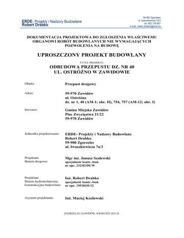 ERDE- Projekty i Nadzory Budowlane Robert Drabko 59-900 Zgorzelec ul. Iwaszkiewicza 7a/3 tel. 602 139 807 e-mail: [email protected] DOKUMENTACJA PROJEKTOWA DO ZGŁOSZENIA WŁAŚCIWEMU ORGANOWI ROBÓT BUDOWLANYCH NIE WYMAGAJĄCYCH POZWOLENIA NA BUDOWĘ UPROSZCZONY PROJEKT BUDOWLANY TYTUŁ PROJEKTU: ODBUDOWA PRZEPUSTU DZ. NR 40 UL. OSTRÓŻNO W ZAWIDOWIE Obiekt: Przepust drogowy Adres: 59-970 Zawidów ul. Ostróżno dz. nr 1, 40 (AM-1; obr. II), 754, 757 (AM-12; obr. I) Inwestor: Gmina Miejska Zawidów Plac Zwycięstwa 21/22 59-970 Zawidów Jednostka projektowania: ERDE- Projekty i Nadzory Budowlane Robert Drabko 59-900 Zgorzelec ul. Iwaszkiewicza 7a/3 Projektant Branża drogowa: Mgr inż. Janusz Szalewski Projektant Branża hydrotechniczna, konstrukcyjno-budowlana: Inż. Robert Drabko Asystent projektanta: Inż. Maciej Kozłowski specjalność kontr.-bud. nr upr. 232/02/DUW specjalność kontr.-bud. nr upr. 195/DOŚ/12 ZGORZELEC/ZAWIDÓW, KWIECIEŃ 2013 R. Uproszczony Projekt Budowlany Odbudowa przepustu w Zawidowie, ul. Ostróżno, dz. nr 1, 40 (AM-1; obr. II); 754, 757 (AM-12; obr. I) 2 SPIS ZAWARTOŚCI OPRACOWANIA I. OŚWIADCZENIE PROJEKTANTA………………………….…………....………………...................... II. OPIS TECHNICZNY................................................................................................................................. 1. Podstawa prawna opracowania……………………….………………………...................................... 2. Cel i zakres opracowania……………..……………………………………............................................ 3. Dane wyjściowe…………………..…………………………………………………............................ 4. Przedmiot inwestycji…………………………….................................................................................... 5. Stan zagospodarowania terenu….……………………...........…………………...................................... 5.1. Przepust......................................................................………………………………………..…….. 5.2. Droga ul. Ostróżno............................................................................……………………………… 5.3. Potok..........................................................................……………………………………………… 5.4. Rów...............................................................................................………………………………… 5.5. Kabel oświetleniowy.................................................................................................……………… 5.6. Roboty rozbiórkowe..................................................................................................……………… 6. Projektowane zagospodarowanie terenu…….…………......................................................................... 6.1. Przepust......................................................................………………………………………..…….. 6.1.1. Fundament przepustu......................................................................……………………......... 6.1.2. Płyta zespalająca.............................................................................……………………......... 6.1.3. Izolacja...........................................................................................……………………......... 6.1.4. Szczeliny dylatacyjne.....................................................................……………………......... 6.2. Droga ul. Ostróżno............................................................................……………………………… 6.2.1. Konstrukcja nawierzchni.................................................................……………………......... 6.2.2. Wzmocnienie konstrukcji nawierzchni...........................................……………………......... 6.2.3. Nasyp w obrębie przepustu.............................................................……………………......... 6.3. Ściany oporowe przepustu.........................................……………………………………………… 6.4. Poręcze ochronne...........................................................................………………………………… 6.5. Potok................................................................................………………………………… 6.6. Rów...............................................................................................………………………………… 6.7. Kabel oświetleniowy.................................................................................................……………… 7. Odprowadzenie wód deszczowych..............................................…….…………................................... 8. Wymagania wykonania robót…………..…………………………………………………................... 8.1. Wymagania podstawowe………………………………………………………............................ 8.2. Roboty ziemne………………………………………………………………................................. 8.3. Instalacje podziemne………………………………………………………………...................... III. CZĘŚĆ RYSUNKOWA……………...……………………………………….......…………………...... IV. CZĘŚĆ FOTOGRAFICZNA………………...………………………...………...................................... V. ZAŁĄCZNIKI….……………..…...............................………………………..………………………… RAZEM ERDE- Projekty i Nadzory Budowlane Robert Drabko 59-900 Zgorzelec, ul. Iwaszkiewicza 7a/3; tel. 602 139 807;