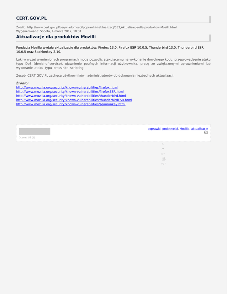 CERT.GOV.PL Źródło: http://www.cert.gov.pl/cer/wiadomosci/poprawki-i-aktualizacj/553,Aktualizacje-dla-produktow-Mozilli.html Wygenerowano: Sobota, 4 marca 2017, 10:31 Aktualizacje dla produktów Mozilli Fundacja Mozilla wydała aktualizacje dla produktów: Firefox 13.0, Firefox ESR 10.0.5, Thunderbird 13.0, Thunderbird ESR 10.0.5 oraz SeaMonkey 2.10. Luki w wyżej wymienionych programach mogą pozwolić atakującemu na wykonanie dowolnego kodu, przeprowadzenie ataku typu DoS (denial-of-service), ujawnienie poufnych informacji użytkownika, pracę ze zwiększonymi uprawnieniami lub wykonanie ataku typu cross-site scripting. Zespół CERT.GOV.PL zachęca użytkowników i administratorów do dokonania niezbędnych aktualizacji. Źródło: http://www.mozilla.org/security/known-vulnerabilities/firefox.html http://www.mozilla.org/security/known-vulnerabilities/firefoxESR.html http://www.mozilla.org/security/known-vulnerabilities/thunderbird.html http://www.mozilla.org/security/known-vulnerabilities/thunderbirdESR.html http://www.mozilla.org/security/known-vulnerabilities/seamonkey.html poprawki, podatności, Mozilla, aktualizacje RG Ocena: 1/5 (1)
