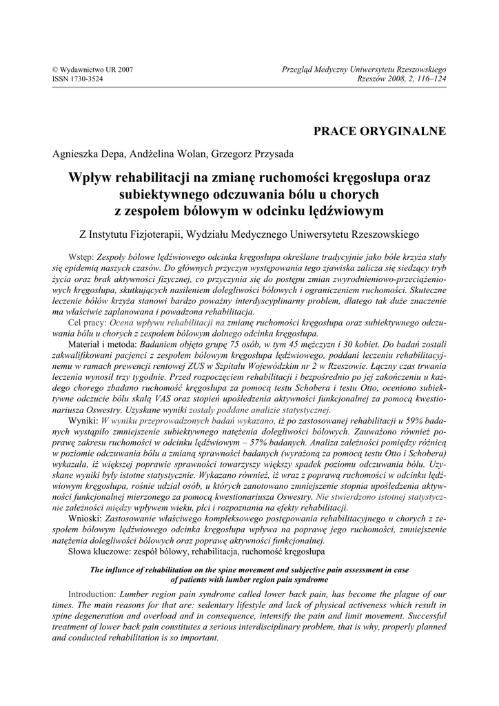 © Wydawnictwo UR 2007 ISSN 1730-3524 Przegląd Medyczny Uniwersytetu Rzeszowskiego Rzeszów 2008, 2, 116–124 PRACE ORYGINALNE Agnieszka Depa, Andżelina Wolan, Grzegorz Przysada Wpływ rehabilitacji na zmianę ruchomości kręgosłupa oraz subiektywnego odczuwania bólu u chorych z zespołem bólowym w odcinku lędźwiowym Z Instytutu Fizjoterapii, Wydziału Medycznego Uniwersytetu Rzeszowskiego Wstęp: Zespoły bólowe lędźwiowego odcinka kręgosłupa określane tradycyjnie jako bóle krzyża stały się epidemią naszych czasów. Do głównych przyczyn występowania tego zjawiska zalicza się siedzący tryb życia oraz brak aktywności fizycznej, co przyczynia się do postępu zmian zwyrodnieniowo-przeciążeniowych kręgosłupa, skutkujących nasileniem dolegliwości bólowych i ograniczeniem ruchomości. Skuteczne leczenie bólów krzyża stanowi bardzo poważny interdyscyplinarny problem, dlatego tak duże znaczenie ma właściwie zaplanowana i powadzona rehabilitacja. Cel pracy: Ocena wpływu rehabilitacji na zmianę ruchomości kręgosłupa oraz subiektywnego odczuwania bólu u chorych z zespołem bólowym dolnego odcinka kręgosłupa. Materiał i metoda: Badaniem objęto grupę 75 osób, w tym 45 mężczyzn i 30 kobiet. Do badań zostali zakwalifikowani pacjenci z zespołem bólowym kręgosłupa lędźwiowego, poddani leczeniu rehabilitacyjnemu w ramach prewencji rentowej ZUS w Szpitalu Wojewódzkim nr 2 w Rzeszowie. Łączny czas trwania leczenia wynosił trzy tygodnie. Przed rozpoczęciem rehabilitacji i bezpośrednio po jej zakończeniu u każdego chorego zbadano ruchomość kręgosłupa za pomocą testu Schobera i testu Otto, oceniono subiektywne odczucie bólu skalą VAS oraz stopień upośledzenia aktywności funkcjonalnej za pomocą kwestionariusza Oswestry. Uzyskane wyniki zostały poddane analizie statystycznej. Wyniki: W wyniku przeprowadzonych badań wykazano, iż po zastosowanej rehabilitacji u 59% badanych wystąpiło zmniejszenie subiektywnego natężenia dolegliwości bólowych. Zauważono również poprawę zakresu ruchomości w odcinku lędźwiowym – 57% badanych. Analiza zależności pomiędzy różnicą w poziomie odczuwania bólu a zmianą sprawności badanych (wyrażoną za pomocą testu Otto i Schobera) wykazała, iż większej poprawie sprawności towarzyszy większy spadek poziomu odczuwania bólu. Uzyskane wyniki były istotne statystycznie. Wykazano również, iż wraz z poprawą ruchomości w odcinku lędźwiowym kręgosłupa, rośnie udział osób, u których zanotowano zmniejszenie stopnia upośledzenia aktywności funkcjonalnej mierzonego za pomocą kwestionariusza Oswestry. Nie stwierdzono istotnej statystycznie zależności między wpływem wieku, płci i rozpoznania na efekty rehabilitacji. Wnioski: Zastosowanie właściwego kompleksowego postępowania rehabilitacyjnego u chorych z zespołem bólowym lędźwiowego odcinka kręgosłupa wpływa na poprawę jego ruchomości, zmniejszenie natężenia dolegliwości bólowych oraz poprawę aktywności funkcjonalnej. Słowa kluczowe: zespół bólowy, rehabilitacja, ruchomość kręgosłupa The influnce of rehabilitation on the spine movement and subjective pain assessment in case of patients with lumber region pain syndrome Introduction: Lumber region pain syndrome called lower back pain, has become the plague of our times. The main reasons for that are: sedentary lifestyle and lack of physical activeness which result in spine degeneration and overload and in consequence, intensify the pain and limit movement. Successful treatment of lower back pain constitutes a serious interdisciplinary problem, that is why, properly planned and conducted rehabilitation is so important. The aim of the research work: the evaluation of rehabilitation’s influence on a change of spine movement and subjective pain assessment, in case of patients with lower back pain syndrome. Material and method: the research was performed on a group of 75 people, the group included 45 men and 30 women. Qualified for the research were the patients with lumber region pain syndrome, undergoing treatment as part of ZUS pension prevention in the Regional Hospital no. 2 in Rzeszów. The treatment lasted three weeks in total. Before rehabilitation started and right after it has finished, every patient has undergone examination of spine movement by means of Schober’s test and Otto test, subjective pain assessment was also evaluated by VAS scale of pain, as well as the degree of functional activeness impairment measured with Oswestry questionnaire. The obtained results were subject to statistical analysis. Results: As a result of the research, it was stated that after rehabilitation 59% of patients experienced decrease of subjective pain intensity. It was also noticed that lumber region spine movement has improved – 57% of patients. The analysis of relation between the difference in degree of pain feeling and change of patients’ fitness (expressed by Otto and Schober’s tests) has proved that together with the improvement of fitness, the feeling of pain decreases. The obtained results were of statistical importance. It was also shown that when lumber region movement improves, more patients experience decrease of functional activeness impairment degree, measured by means of Oswestry questionnaire. No statistically important relation between age, gender, diagnosis and rehabilitation results was noticed. Conclusion: Employment of the proper, complex rehabilitation activities on the patients with lumber region pain syndrome improves spine movement, reduces pain and improves functional activeness. Key words: pain syndrome, rehabilitation, spine movement WSTĘP Bóle dolnego odcinka kręgosłupa zaliczane są do najczęstszych schorzeń cywilizacyjnych. Obecnie przyjmuje się, że około 80% populacji powyżej czterdziestego roku życia miało przynajmniej jeden poważny epizod bólowy lędźwiowego odcinka kręgosłupa. Występowanie te