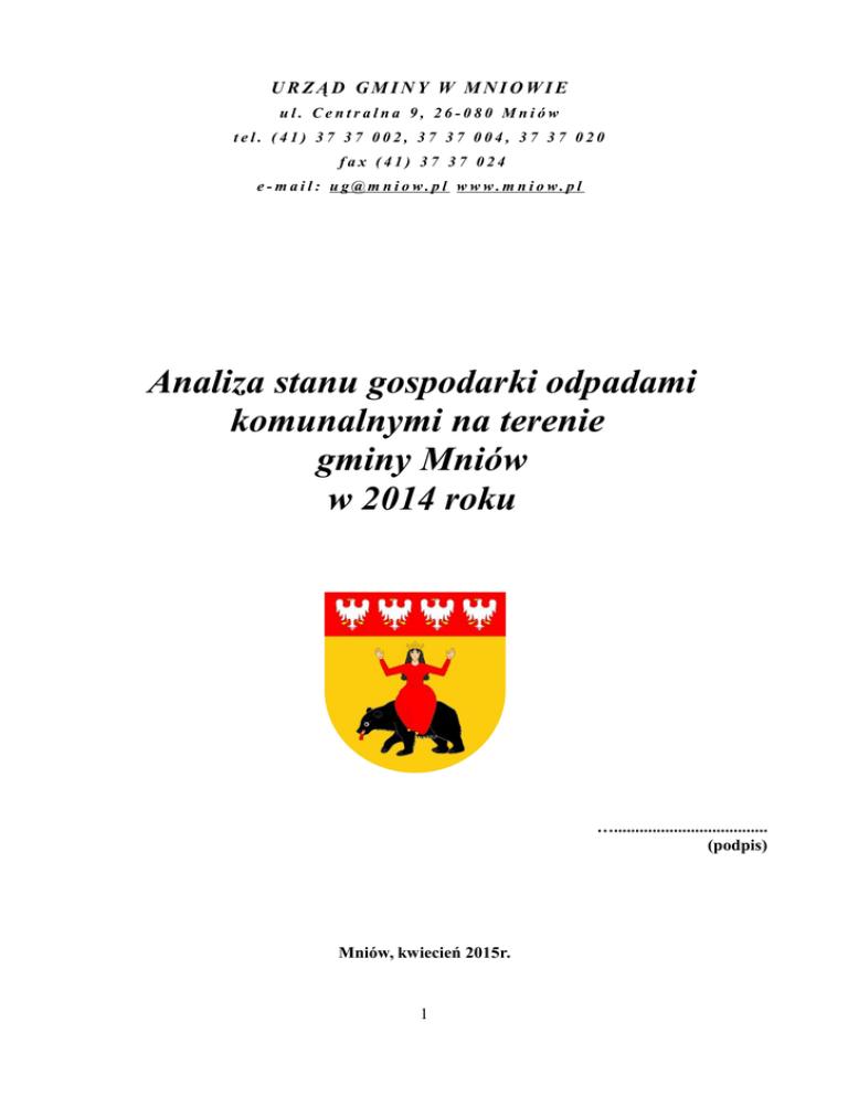 URZĄD GMINY W MNIOWIE ul. Centralna 9, 26-080 Mniów tel. (41) 37 37 002, 37 37 004, 37 37 020 fax (41) 37 37 024 e-mail: [email protected] www.mniow.pl Analiza stanu gospodarki odpadami komunalnymi na terenie gminy Mniów w 2014 roku ….................................... (podpis) Mniów, kwiecień 2015r. 1 SPIS TREŚCI 1. Podstawa prawna sporządzenia analizy …........................................................................str. 3 2. Uchwały podjęte przez Radę Gminy Mniów …..................................................................str. 3 3. Ogólna charakterystyka sytemu gospodarowania odpadami komunalnymi na terenie Gminy Mniów w 2014 roku …...........................................................................................str. 4 4. Możliwości przetwarzania zmieszanych odpadów komunalnych, odpadów zielonych oraz pozostałości z sortowania i pozostałości z mechaniczno-biologicznego przetwarzania odpadów komunalnych przeznaczonych do składowania …..................... str. 5 5. Analiza potrzeb inwestycyjnych związanych z gospodarowaniem odpadami komunalnymi …................................................................................................................ str. 6 6. Koszty poniesione w związku z odbieraniem, odzyskiem, recyklingiem i unieszkodliwieniem odpadów komunalnych …............................................................... str. 7 7. Liczba mieszkańców.......................................................................................................... str. 8 8. Liczba właścicieli nieruchomości, którzy nie zawarli umowy, o której mowa w art. 6 ust. 1, w imieniu których gmina powinna podjąć działania, o których mowa w art. 6 ust. 6-12 .............................................................................................................................str. 8 9. Ilość odpadów komunalnych wytwarzanych na terenie gminy......................................... str. 9 10. Ilość zmieszanych odpadów komunalnych, odpadów zielonych odbieranych z terenu gminy oraz powstających z przetwarzania odpadów komunalnych pozostałości z sortowania i pozostałości z mechaniczno-biologicznego przetwarzania odpadów komunalnych do składowania......................................................................... str. 10 SPIS TABEL 1. Instalacje regionalne w regionie 4 województwa świętokrzyskiego ….............................. str.6 2. Wykaz liczby mieszkańców oraz gospodarstw domowych w poszczególnych sołectwach ….......................................................................................................................str.8 3. Ilość odpadów komunalnych wytworzonych na terenie gminy Mniów w 2014 roku........................................................................................................................str. 9 4. Ilość zmieszanych odpadów komunalnych oraz odpadów zielonych odebranych w 2014 r. z terenu gminy i przekazanych do RIPOK-ów …..............................................str. 10 2 1. Podstawa prawna sporządzenia analizy. Zgodnie z art. 3 ust. 2 pkt 10 ustawy z dnia 13 września 1996 r. o utrzymaniu czystości i porządku w gminach (t.j. Dz.U. z 2013r., poz. 1399 ze zm.) Gminy mają obowiązek dokonać corocznej analizy stanu gospodarki odpadami komunalnymi, celem weryfikacji możliwości technicznych i organizacyjnych gminy w zakresie gospodarowania odpadami komunalnymi. Zgodnie z art. 9tb w/w ustawy analizę stanu gospodarki odpadami komunalnymi sporządzono na podstawie sprawozdań złożonych przez podmioty odbierające odpady komunalne od właścicieli nieruchomości oraz innych dostępnych danych wpływających na koszty systemu gospodarowania odpadami komunalnymi, obejmującą w szczególności: 1) możliwości przetwarzania zmieszanych odpadów komunalnych, odpadów zielonych oraz pozostałości z sortowania i pozostałości z mechaniczno-biologicznego przetwarzania odpadów komunalnych przeznaczonych do składowania; 2) potrzeby inwestycyjne związane z gospodarowaniem odpadami komunalnymi; 3) koszty poniesione w związku z odbieraniem, odzyskiem, recyklingiem i unieszkodliwianiem odpadów komunalnych; 4) liczbę mieszkańców; 5) liczbę właścicieli nieruchomości, którzy nie zawarli umowy, o której mowa w art. 6 ust. 1, w imieniu których gmina powinna podjąć działania, o których mowa w art. 6 ust. 6-12; 6) ilość odpadów komunalnych wytwarzanych na terenie gminy; 7) ilość zmieszanych odpadów komunalnych, odpadów zielonych odbieranych z terenu gminy oraz powstających z przetwarzania odpadów komunalnych pozostałości z sortowania i pozostałości z mechaniczno-biologicznego przetwarzania odpadów komunalnych przeznaczonych do składowania. Analizę stanu gospodarki odpadami komunalnymi sporządza się w terminie do dnia 30 kwietnia za poprzedni rok kalendarzowy. Analiza stanu gospodarki odpadami komunalnymi podlega publicznemu udostępnieniu na stronie podmiotowej Biuletynu Informacji Publicznej Urzędu Gminy. 2. Uchwały podjęte przez Radę Gminy Mniów. Zasady funkcjonowania gminnego systemu gospodarki odpadami komunalnymi określają szczegółowo Uchwały Rady Gminy, tj.: 1. Uchwała Nr 1/XXVII/2013 Rady Gminy w Mniowie z dnia 30 stycznia 2013 r. w sprawie Regulaminu utrzymania czystości i porządku na terenie Gminy Mniów, zmieniony: Uchwałą Nr 19/XXIX/2013 , z dnia 26 marca 2013 r. 2. Uchwała Nr 5/XXVII/2013 Rady Gminy w Mniowie z dnia 30 stycznia 2013r. w sprawie szczegółowego sposobu i zakresu świadczenia usług w zakresie odbierania i zagospodarowania odpadów komunalnych od właścicieli nieruchomości, na których zamieszkują mieszkańcy, zmieniona Uchwałą Nr 20/XXIX/2013 z dnia 26 marca 2013r. 3. Uchwała Nr 4/XXVII/2013 Rady Gminy w Mniowie z dnia 30 stycznia 2013r. w sprawie określenia wzoru deklaracji o wysokości opłaty za gospodarowanie odpadami komunalnymi, zmieniona Uchwałą Nr 19/