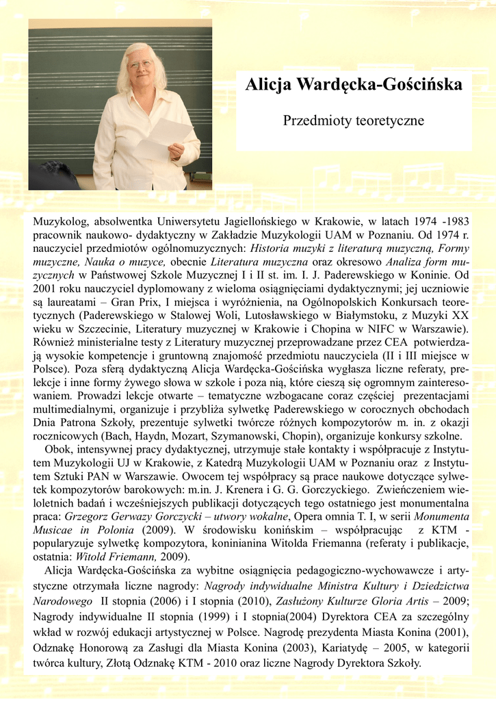 Alicja Wardęcka-Gościńska Przedmioty teoretyczne Muzykolog, absolwentka Uniwersytetu Jagiellońskiego w Krakowie, w latach 1974 -1983 pracownik naukowo- dydaktyczny w Zakładzie Muzykologii UAM w Poznaniu. Od 1974 r. nauczyciel przedmiotów ogólnomuzycznych: Historia muzyki z literaturą muzyczną, Formy muzyczne, Nauka o muzyce, obecnie Literatura muzyczna oraz okresowo Analiza form muzycznych w Państwowej Szkole Muzycznej I i II st. im. I. J. Paderewskiego w Koninie. Od 2001 roku nauczyciel dyplomowany z wieloma osiągnięciami dydaktycznymi; jej uczniowie są laureatami – Gran Prix, I miejsca i wyróżnienia, na Ogólnopolskich Konkursach teoretycznych (Paderewskiego w Stalowej Woli, Lutosławskiego w Białymstoku, z Muzyki XX wieku w Szczecinie, Literatury muzycznej w Krakowie i Chopina w NIFC w Warszawie). Również ministerialne testy z Literatury muzycznej przeprowadzane przez CEA potwierdzają wysokie kompetencje i gruntowną znajomość przedmiotu nauczyciela (II i III miejsce w Polsce). Poza sferą dydaktyczną Alicja Wardęcka-Gościńska wygłasza liczne referaty, prelekcje i inne formy żywego słowa w szkole i poza nią, które cieszą się ogromnym zainteresowaniem. Prowadzi lekcje otwarte – tematyczne wzbogacane coraz częściej prezentacjami multimedialnymi, organizuje i przybliża sylwetkę Paderewskiego w corocznych obchodach Dnia Patrona Szkoły, prezentuje sylwetki twórcze różnych kompozytorów m. in. z okazji rocznicowych (Bach, Haydn, Mozart, Szymanowski, Chopin), organizuje konkursy szkolne. Obok, intensywnej pracy dydaktycznej, utrzymuje stałe kontakty i współpracuje z Instytutem Muzykologii UJ w Krakowie, z Katedrą Muzykologii UAM w Poznaniu oraz z Instytutem Sztuki PAN w Warszawie. Owocem tej współpracy są prace naukowe dotyczące sylwetek kompozytorów barokowych: m.in. J. Krenera i G. G. Gorczyckiego. Zwieńczeniem wieloletnich badań i wcześniejszych publikacji dotyczących tego ostatniego jest monumentalna praca: Grzegorz Gerwazy Gorczycki – utwory wokalne, Opera omnia T. I, w serii Monumenta Musicae in Polonia (2009). W środowisku konińskim – współpracując z KTM popularyzuje sylwetkę kompozytora, koninianina Witolda Friemanna (referaty i publikacje, ostatnia: Witold Friemann, 2009). Alicja Wardęcka-Gościńska za wybitne osiągnięcia pedagogiczno-wychowawcze i artystyczne otrzymała liczne nagrody: Nagrody indywidualne Ministra Kultury i Dziedzictwa Narodowego II stopnia (2006) i I stopnia (2010), Zasłużony Kulturze Gloria Artis – 2009; Nagrody indywidualne II stopnia (1999) i I stopnia(2004) Dyrektora CEA za szczególny wkład w rozwój edukacji artystycznej w Polsce. Nagrodę prezydenta Miasta Konina (2001), Odznakę Honorową za Zasługi dla Miasta Konina (2003), Kariatydę – 2005, w kategorii twórca kultury, Złotą Odznakę KTM - 2010 oraz liczne Nagrody Dyrektora Szkoły.